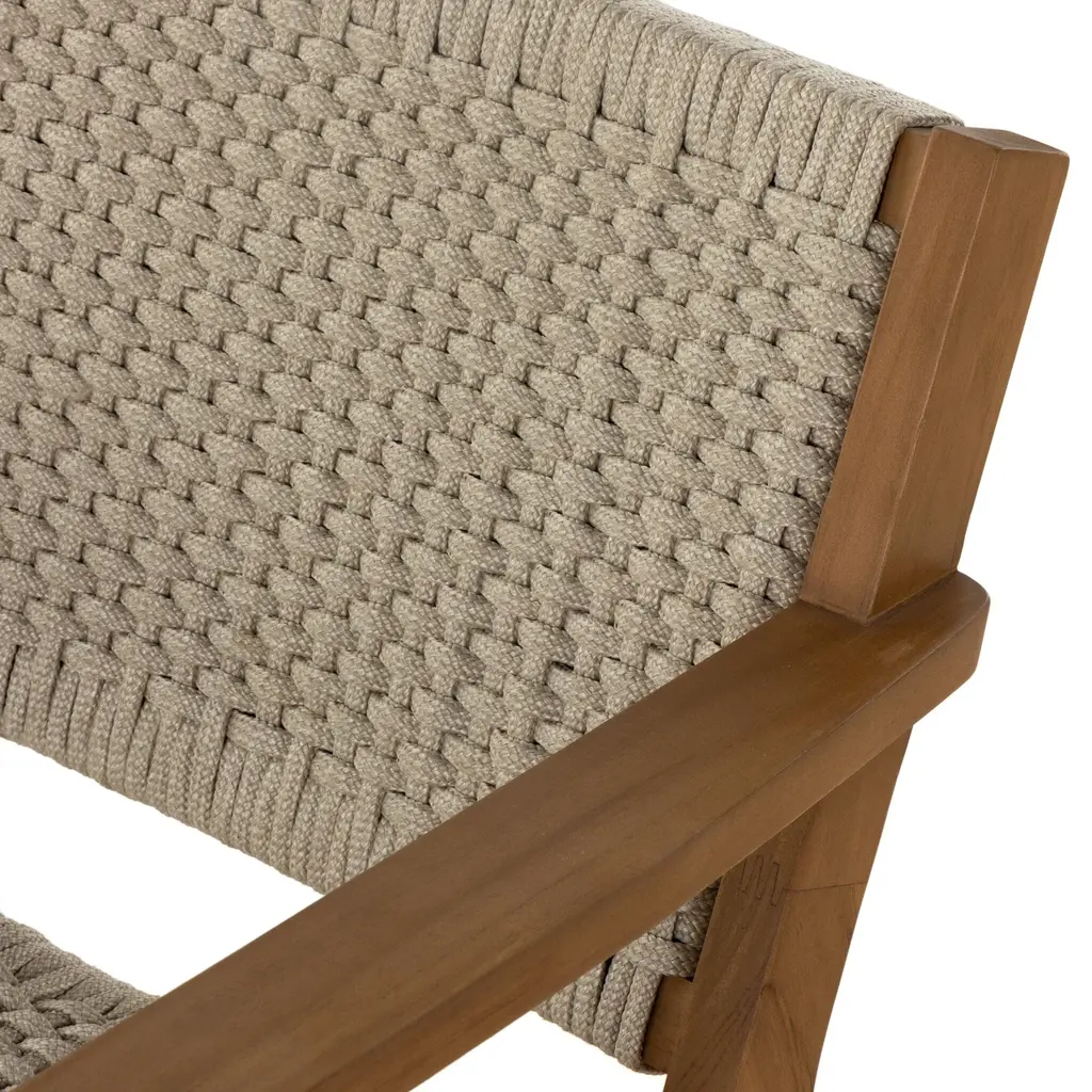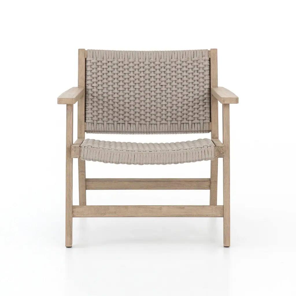 The Delano Outdoor Lounge Chair from Four Handspresents a refined study in material dialogue through its thoughtful composition and textural sophistication. Its distinguished weathered grey teak framework creates architectural presence with natural elegance, while meticulously handwoven rope seating in complementary grey tones introduces tactile intrigue and visual depth. This exceptional chair demonstrates considered design sensibility—where structural elements and seating surfaces achieve harmonious balance through chromatic restraint and material contrast. Highlights