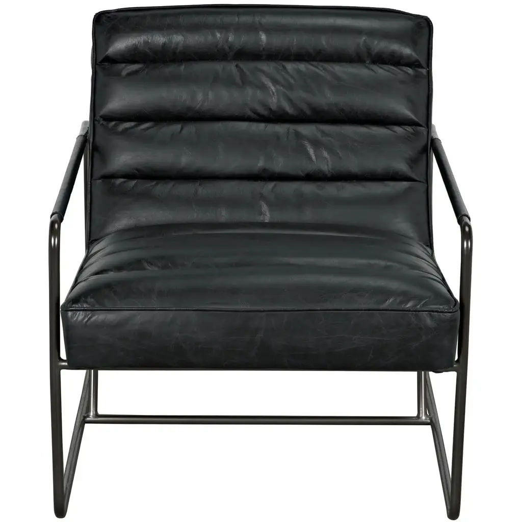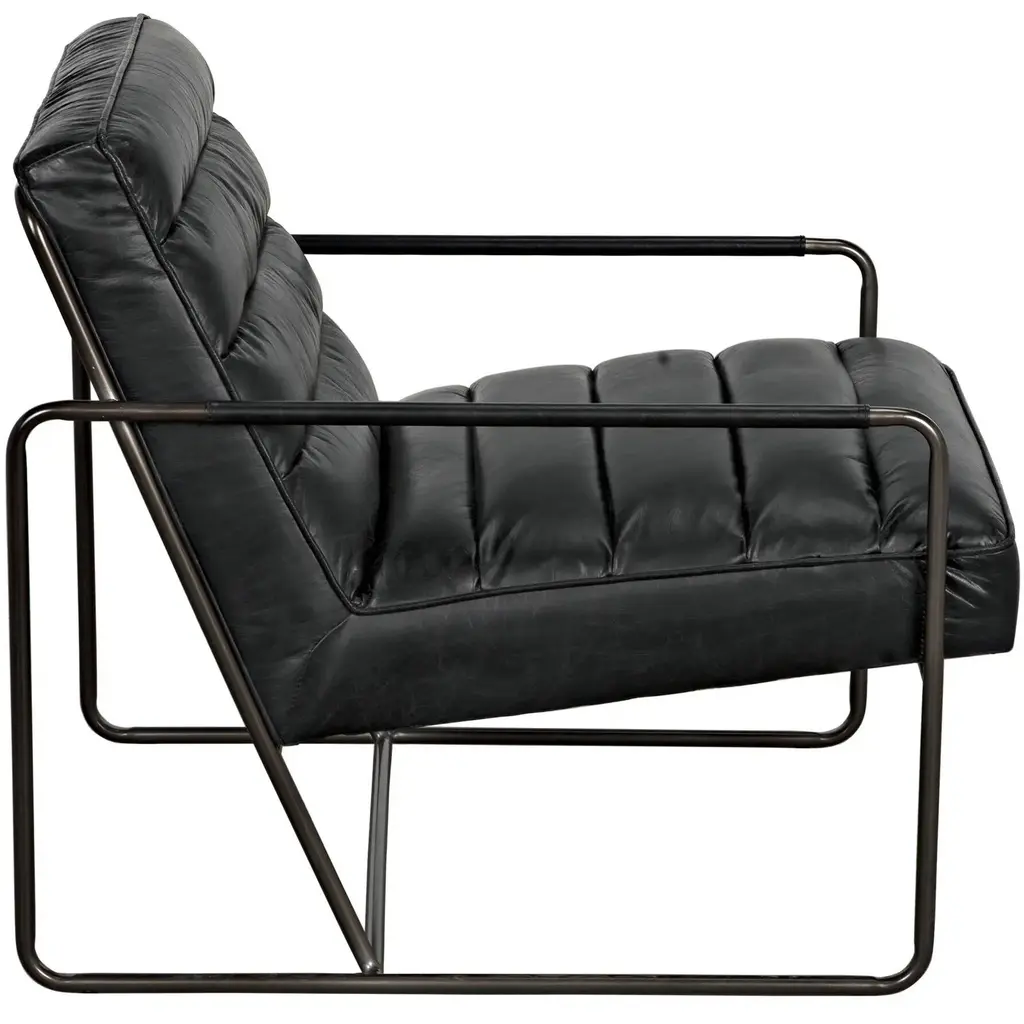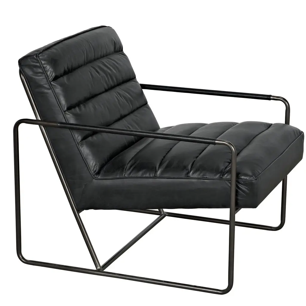 This uber chic upholstered club chair features include black leather cushioning for softness, and minimally finished metal legs for an intriguing touch of edge. Handcrafted and finished, it is an intriguing choice for any modern decor.
