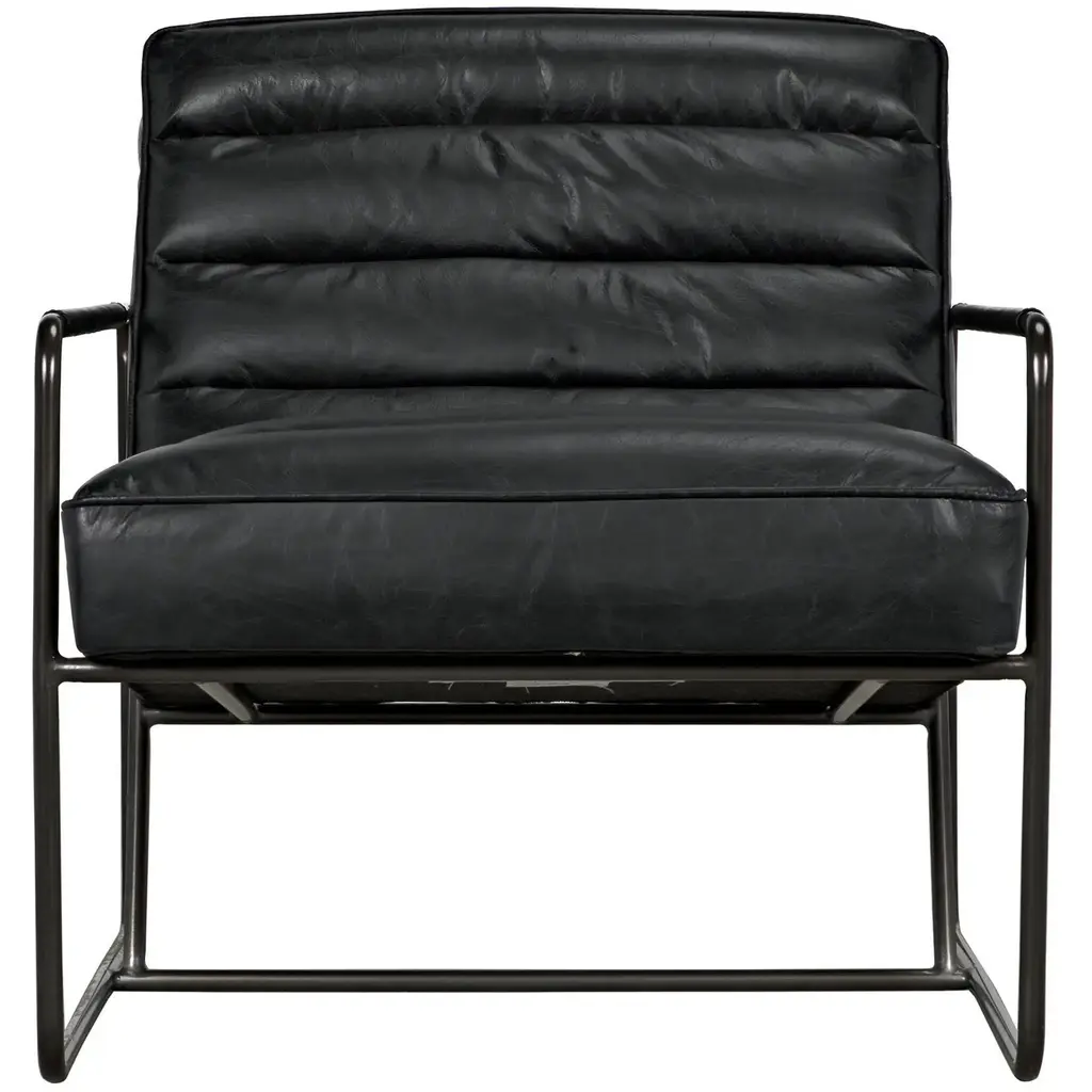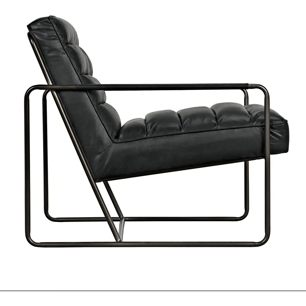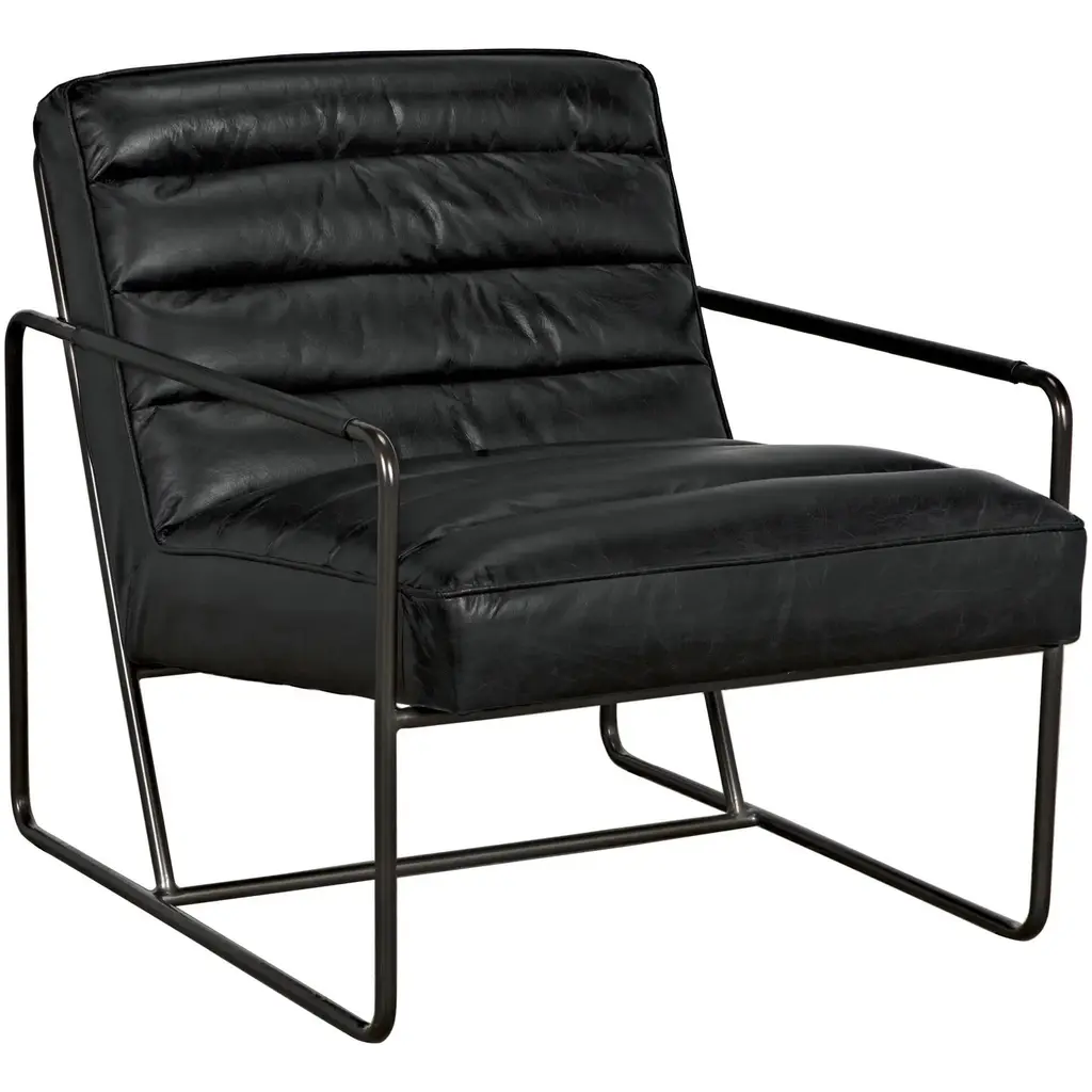 This uber chic upholstered club chair features include black leather cushioning for softness, and minimally finished metal legs for an intriguing touch of edge. Handcrafted and finished, it is an intriguing choice for any modern decor.