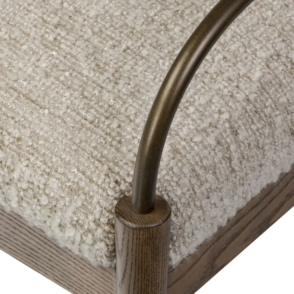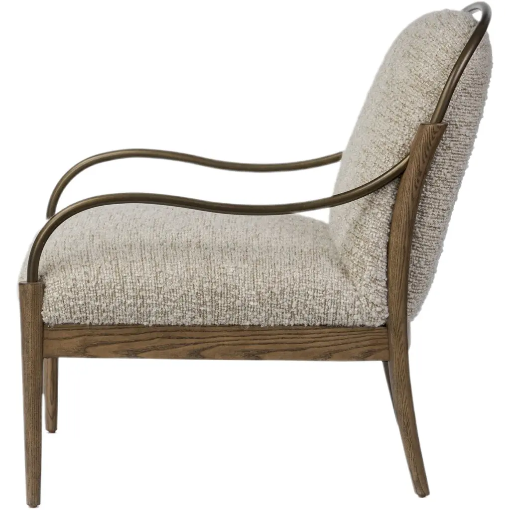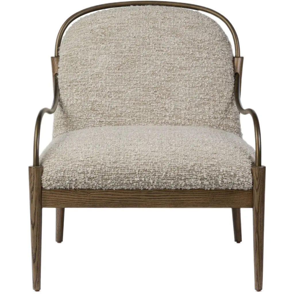 A tribute to traditional artistry and found pieces, this updated accent chair silhouette fluidly combines ash and burnished brass to frame a comfortable S-spring seat. Finished in heavy boucle-like upholstery that features a subtle linear pattern for added depth — creating a luxe, inviting feel. A design collaboration by Amber Lewis and Four Hands.