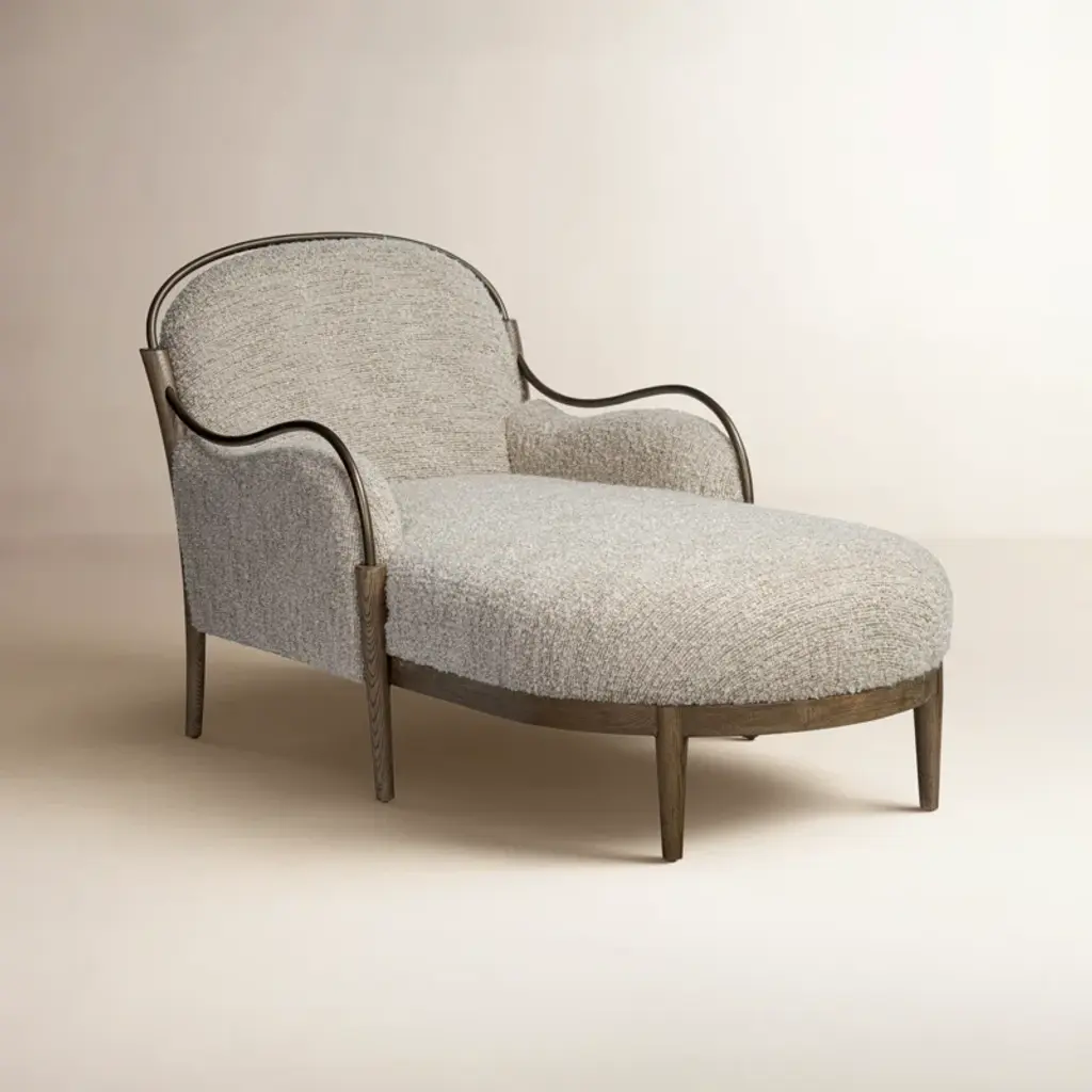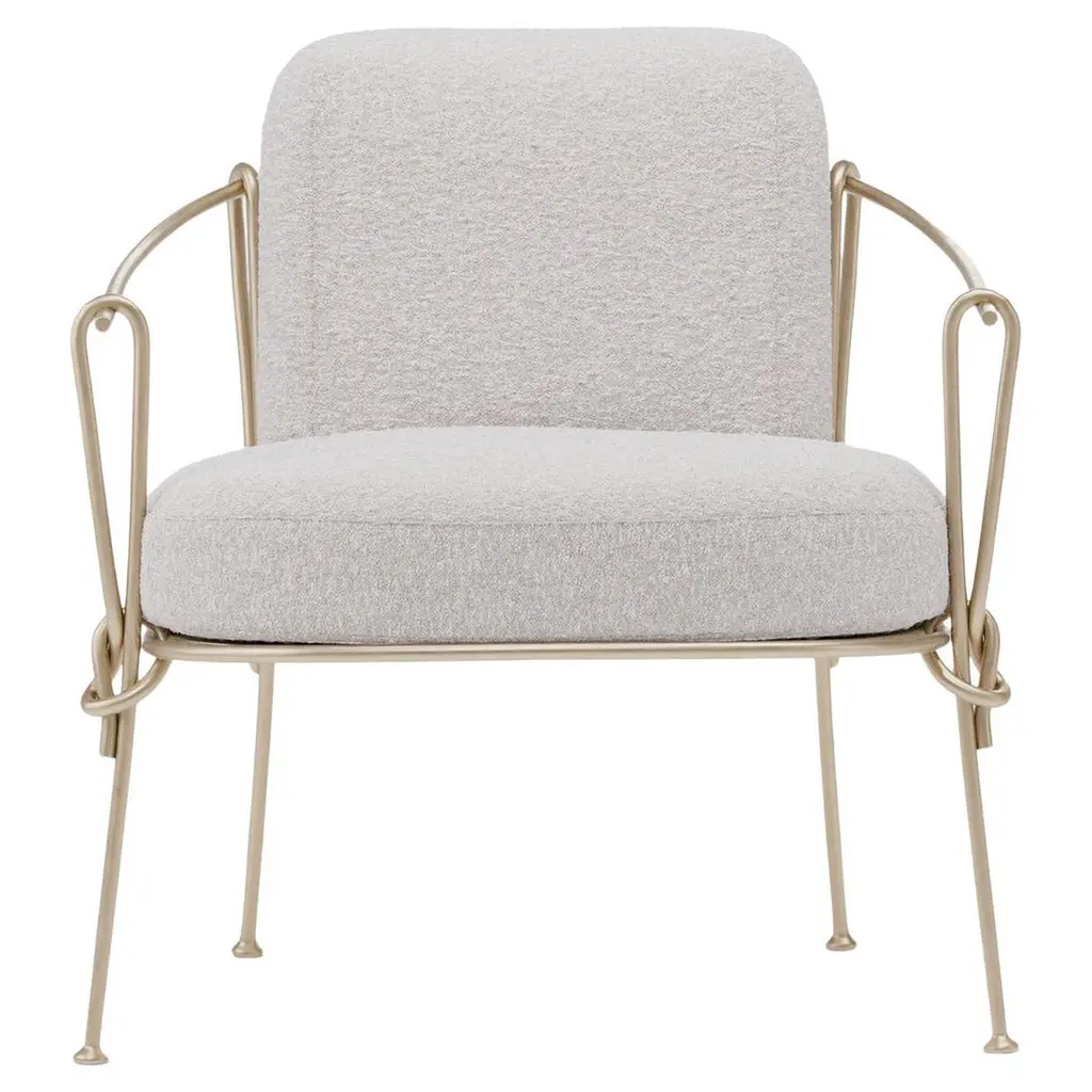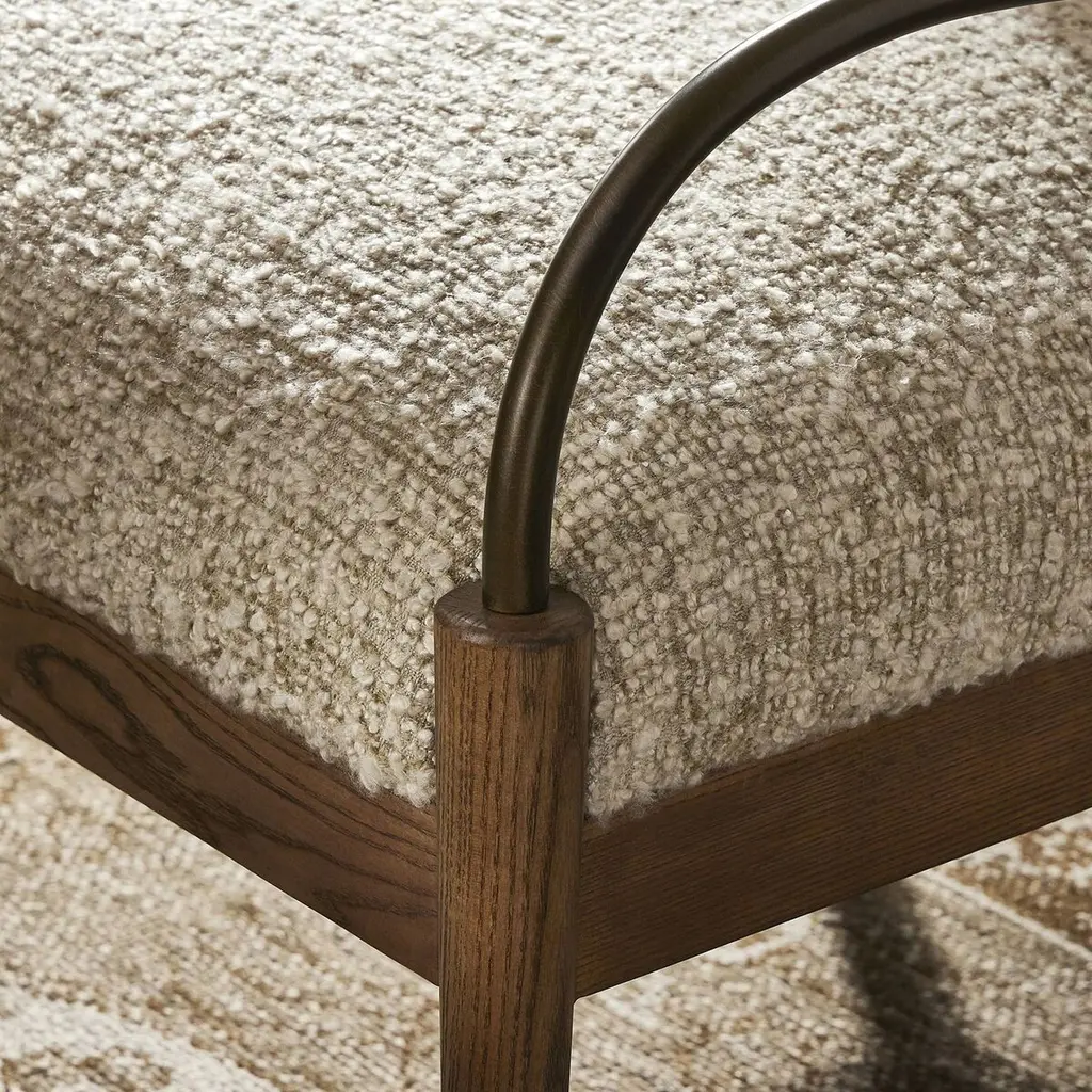 A tribute to traditional artistry and found pieces, this updated accent chair silhouette fluidly combines ash and burnished brass to frame a comfortable S-spring seat. Finished in heavy boucle-like upholstery that features a subtle linear pattern for added depth — creating a luxe, inviting feel. A design collaboration by Amber Lewis and Four Hands.