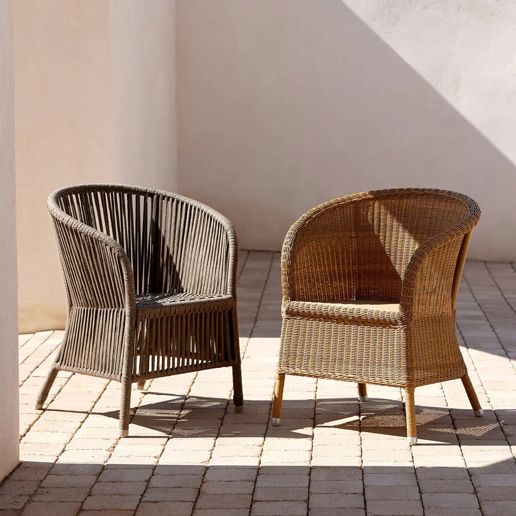 The romantic Derby garden chair is handwoven with maintenance free honey colored cane on a warm galvanized steel frame. This combination of materials makes it possible to leave the garden chair outside all year round - zero maintenance required. To maximize the level of comfort, you are able to purchase on of our seat cushions. They come in 5 different colors: Black, chocolate, silver, white and taupe. Note: Frame and cushion sold separately.