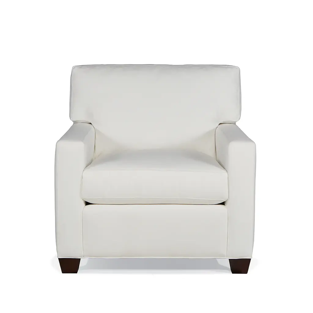 The substantial frame and cushions of the Designer Classics Track Arm Chair make it ideal for any styled space. Whether it's for additional seating in your living space, an accent in a bedroom, or an essential addition to a home library or office, this seat does it all. Ships In 8-10 Weeks One loose back pillow One loose seat cushion As Shown Fabric: Exposure White As Shown Finish: Antique Walnut If you choose to purchase COM, once you have placed your order a customer service rep will contact you regarding where to send your fabric. Please note that current lead time is 17-19 weeks once your fabric arrives at the factory, and if unused fabric is under 1.5 yards, it cannot be sent back to you.This product can be special ordered in additional fabrics, leathers, finishes, and cushion fillings. Click here to email us for for additional information about special ordering.This image is for illustrative purposes only. The colors shown are accurate within the constraints of lighting, photography, and the color accuracy of your screen.