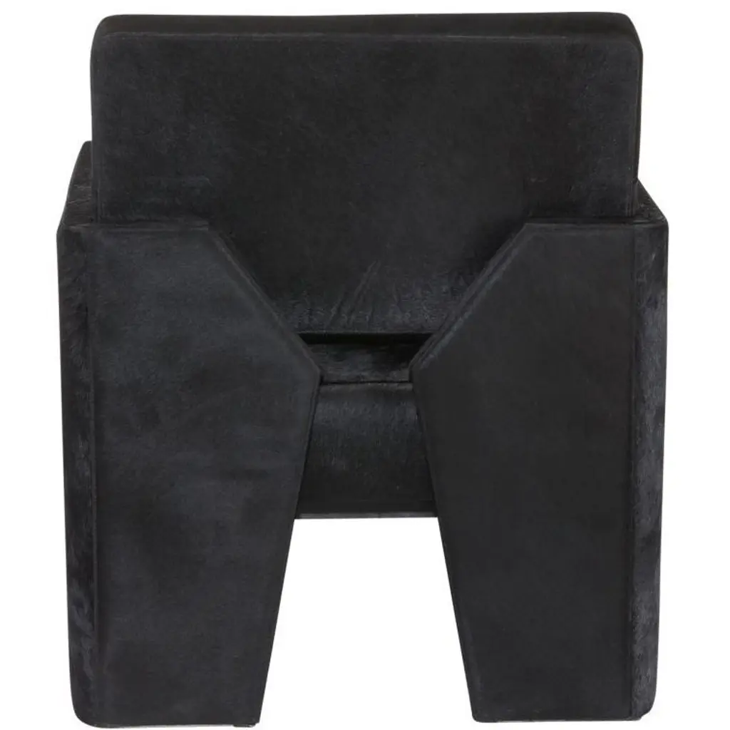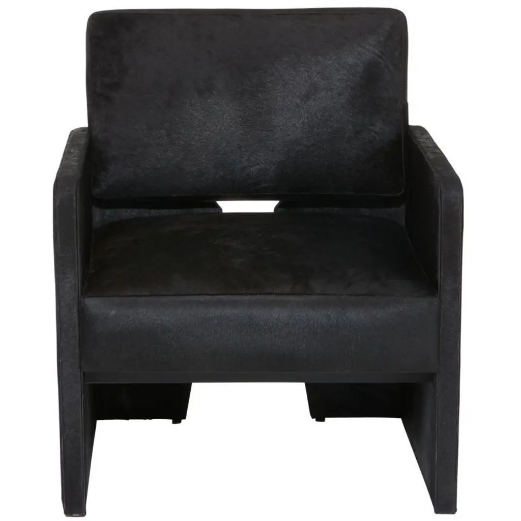 Bringing back the best of 1990s-influenced style, this handsome black hair-on-hide style was designed to please from every angle in a room. As attractive from the back as when seen head on, its precise lines are enhanced with a cinched hourglass back. Squared arms and a well-padded seat complete the silhouette. Hide will vary.