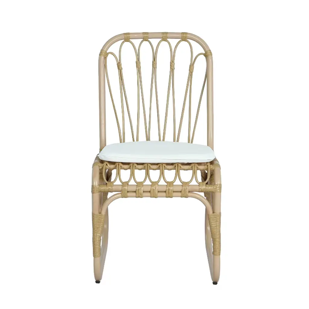 This outdoor chair features a durable iron frame and elegant hand-woven rattan, designed to withstand the elements. With a weight capacity of 400lbs, it provides sturdy, comfortable seating for all. The unique petal-shaped backrest adds a stylish touch, while adjustable foot pads allow for height customization on uneven surfaces. The 1.2-inch thick cushions offer extra comfort and are covered in washable polyester fabric with a zipper for easy cleaning. Available in two colors, this chair comes fully assembled and requires minimal maintenance. Simply wipe with a cloth to keep it looking fresh, making it perfect for any outdoor space.
