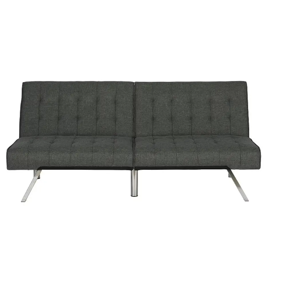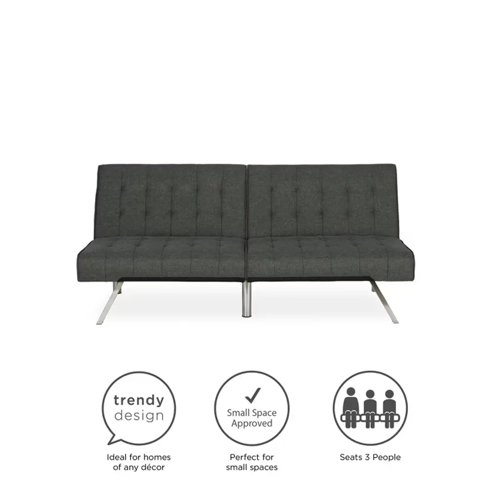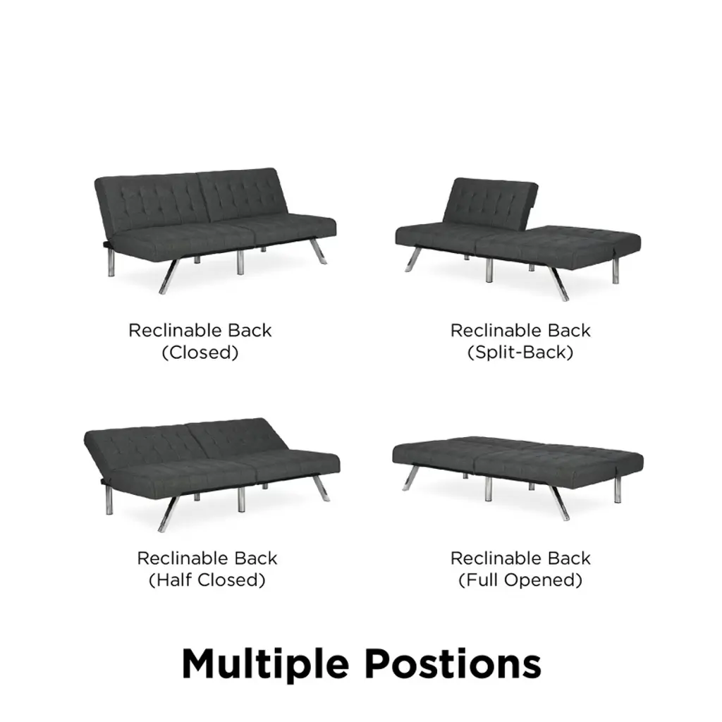 The Emily futon is a striking piece that blends a modern look with a low-profile style. The tufted upholstery adds a classic touch and is available in faux leather, linen and velvet in a variety of colors. The sleek slanted chrome legs add an exciting burst of shine that is perfect for any living space! Thanks to the Emily's convenient split back, you and your guest can easily adjust the futon to your comfort level--whether that's sitting up to chat or lounging back to watch a favorite movie. You can also lie both sides flat for a really comfortable sleeping spot for overnight guests. Its small profile means your futon can fit just about anywhere like your living room, home office and even guest room, while always making a big statement! For a truly impressive seating space and even more sleeping room, pair your futon with the Emily chair, chaise lounger and/or ottoman.