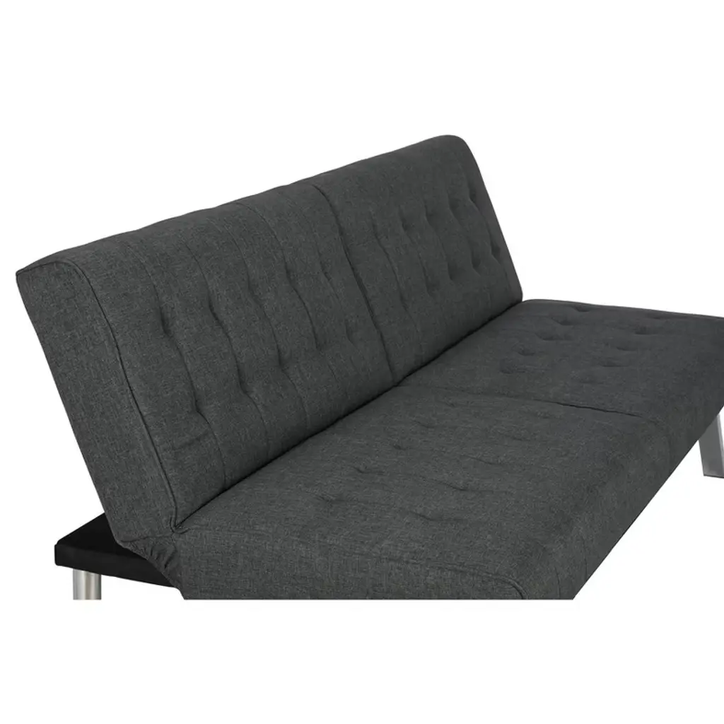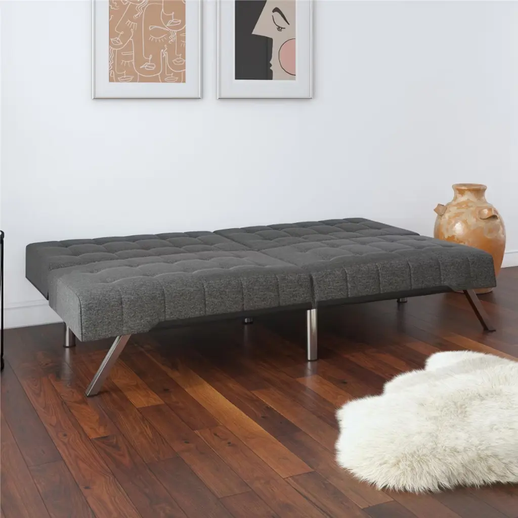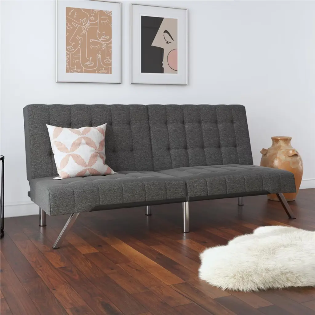 The Emily futon is a striking piece that blends a modern look with a low-profile style. The tufted upholstery adds a classic touch and is available in faux leather, linen and velvet in a variety of colors. The sleek slanted chrome legs add an exciting burst of shine that is perfect for any living space! Thanks to the Emily's convenient split back, you and your guest can easily adjust the futon to your comfort level--whether that's sitting up to chat or lounging back to watch a favorite movie. You can also lie both sides flat for a really comfortable sleeping spot for overnight guests. Its small profile means your futon can fit just about anywhere like your living room, home office and even guest room, while always making a big statement! For a truly impressive seating space and even more sleeping room, pair your futon with the Emily chair, chaise lounger and/or ottoman.