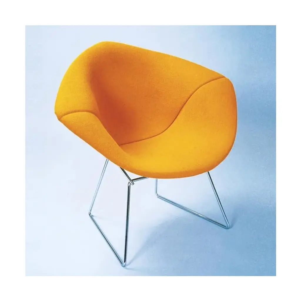 An innovative offering from Harry Bertoia's Wire Furniture collection, recognized worldwide as one of the great achievements of 20th-century furniture design. An ingenious work of art and craftsmanship, the Diamond Lounge Chair by Knoll is an elegant blend of comfort and visual appeal. Welded steel rods form a diamond-shaped, mesh-like seat that gives a springy feel. Hidden mono-filament and metal hooks help the seat pad and cover attach directly to the frame. Glides on the steel sled base prevent damage to flooring.