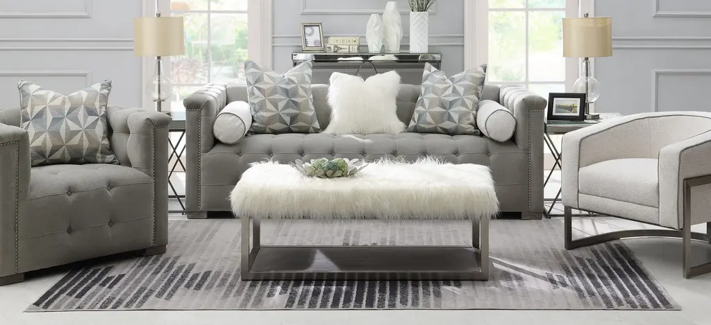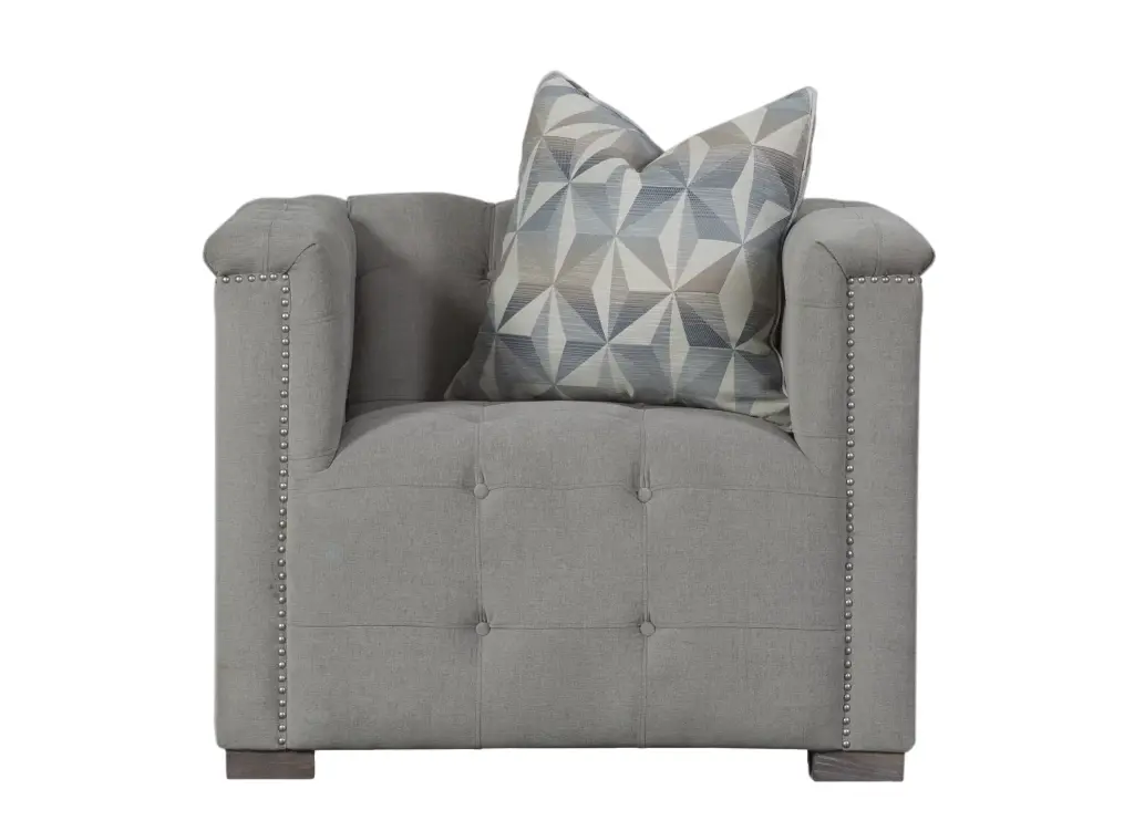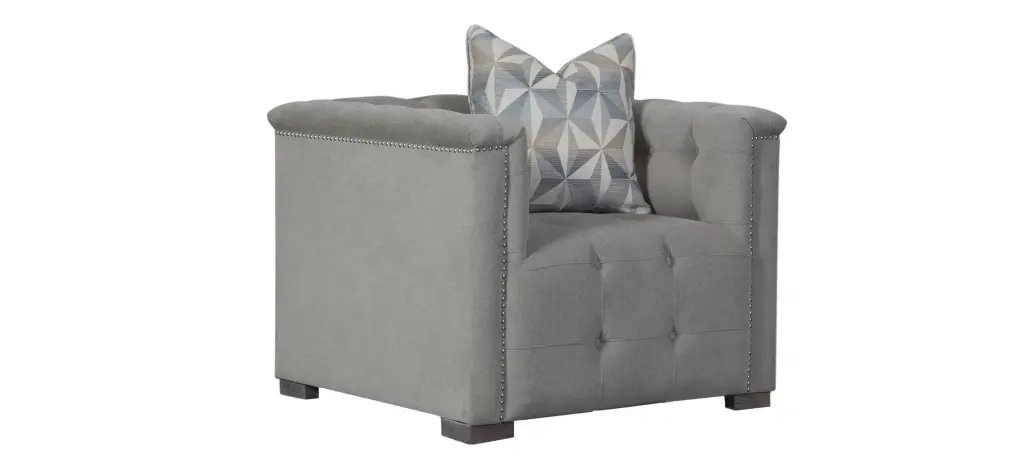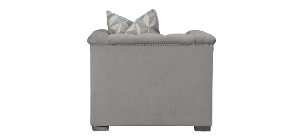 The Diana chair is exotic, adventurous and glamorous. Rich hues in smoke and beautiful nailhead trim create a distinctive, unique and daringly sensuous look. Button-tufted plush polyester adorns this piece, while a patterned accent pillow adds fabulous flair.