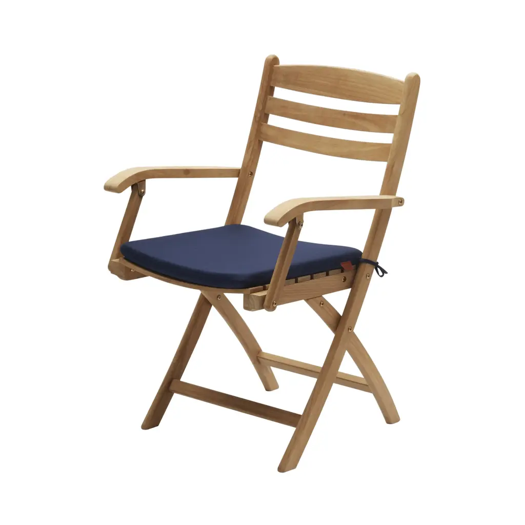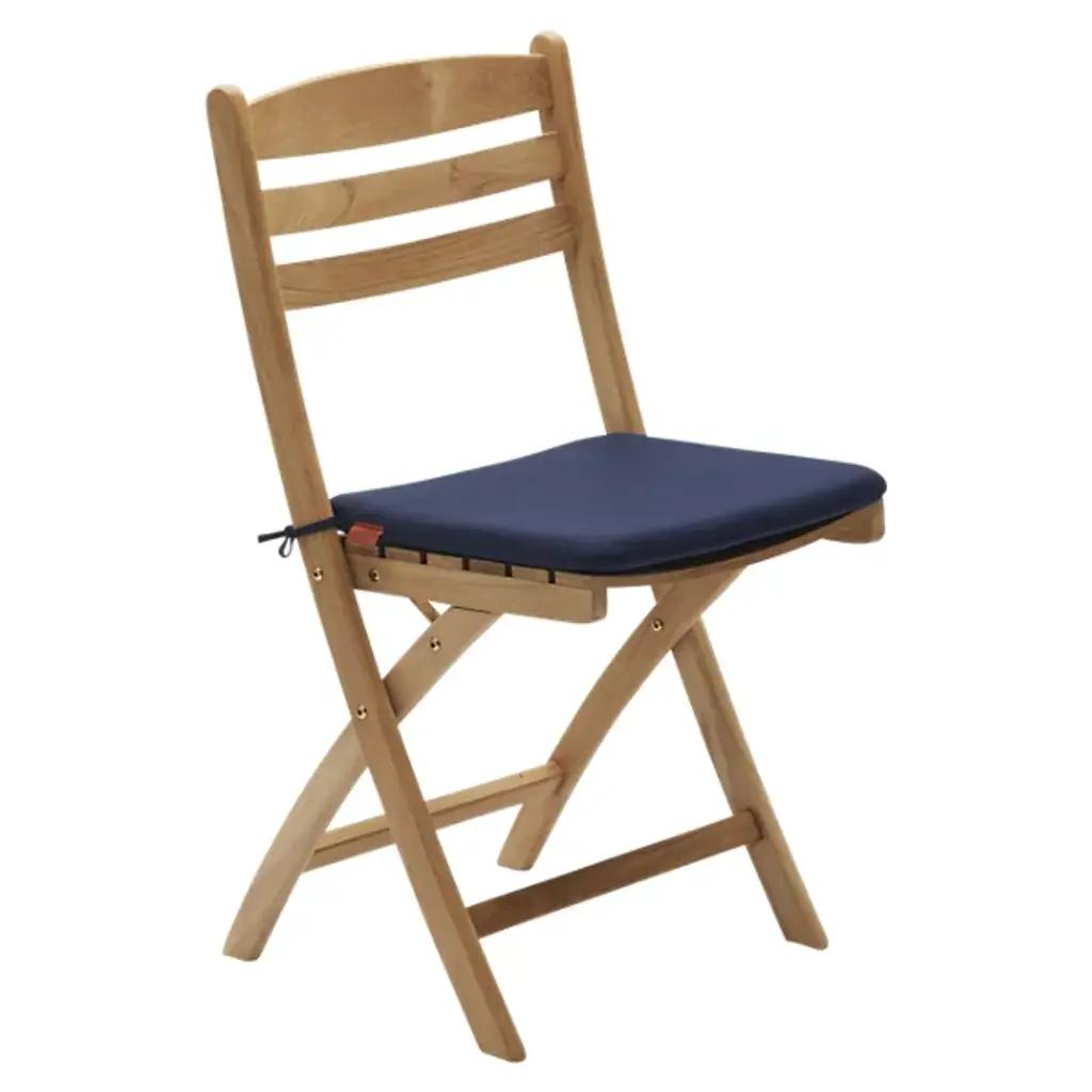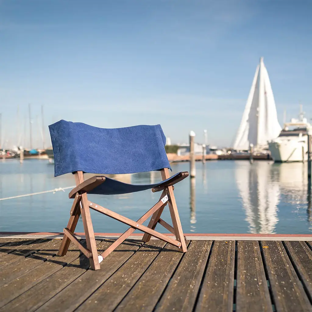 A revisitation of the traditional folding chair and an homage to Dino Gavina who brought this design back in 1974, this piece enriches simple proportions with modern details. The frame is crafted of solid black walnut (iroko wood also available) treated with protective oil with crossed front slats and stainless steel pins. The seat and backrest are fashioned of cerulean fabric, and the backrest is removable and turns into a bag to carry the folded chair. This chair conveys visual lightness in a comfortable silhouette that can easily transition from patio to living room.