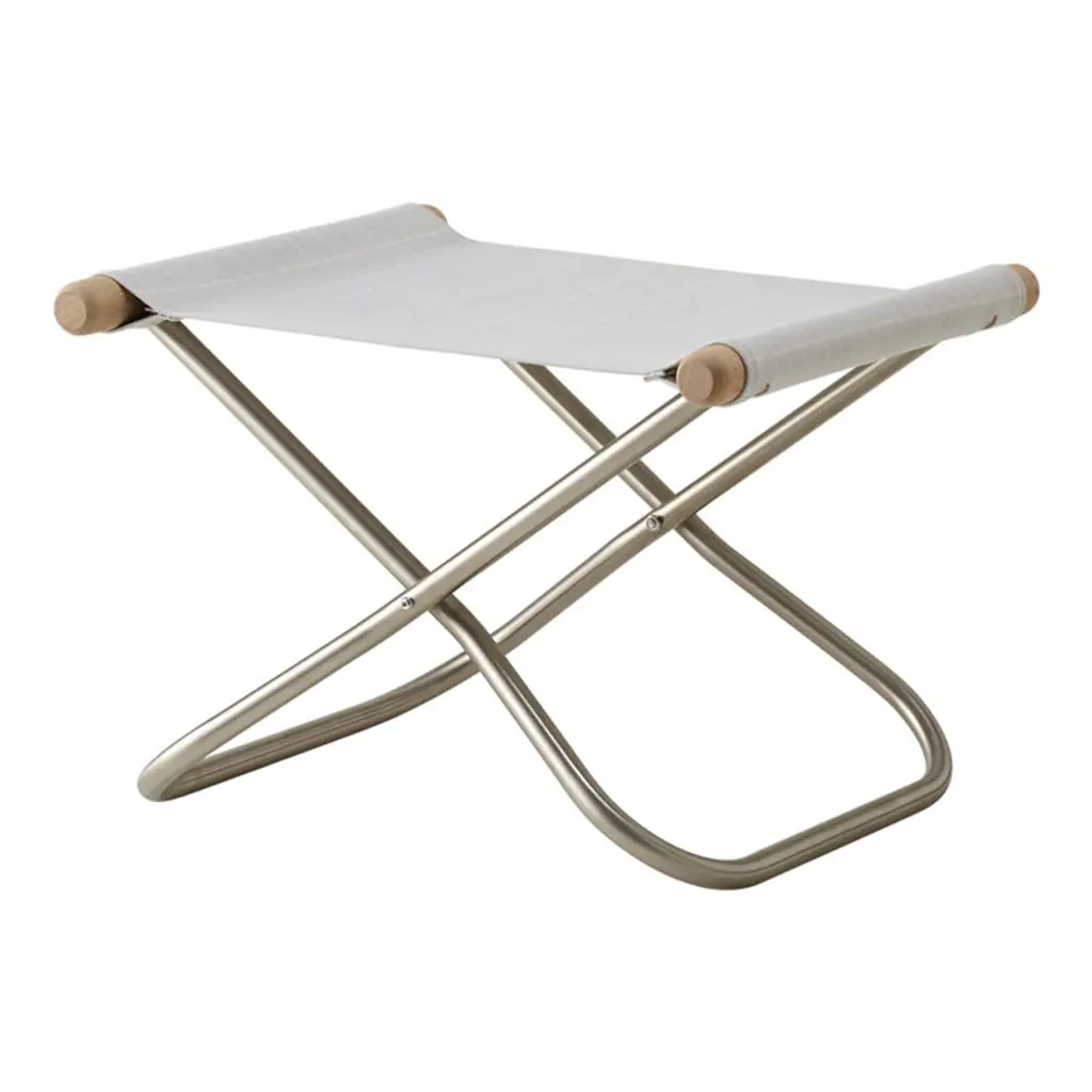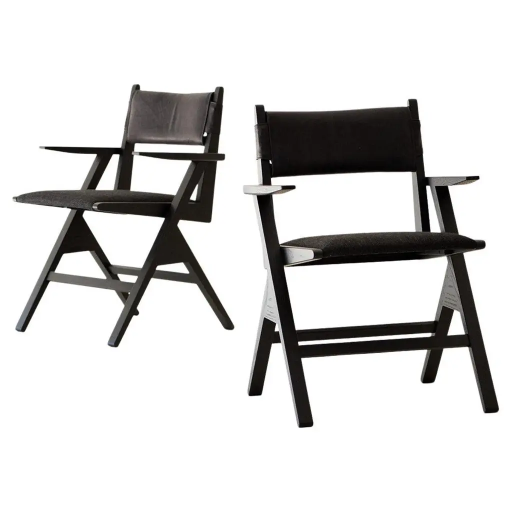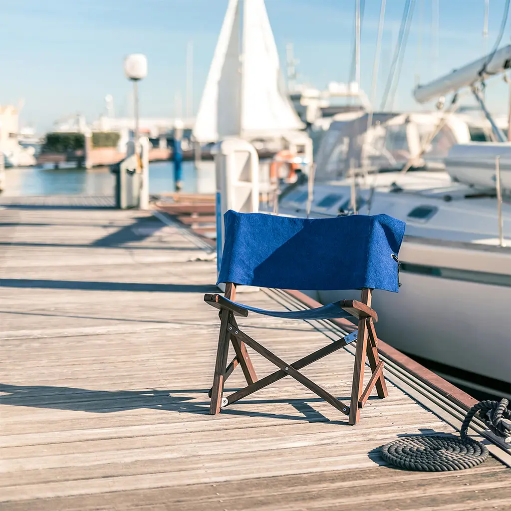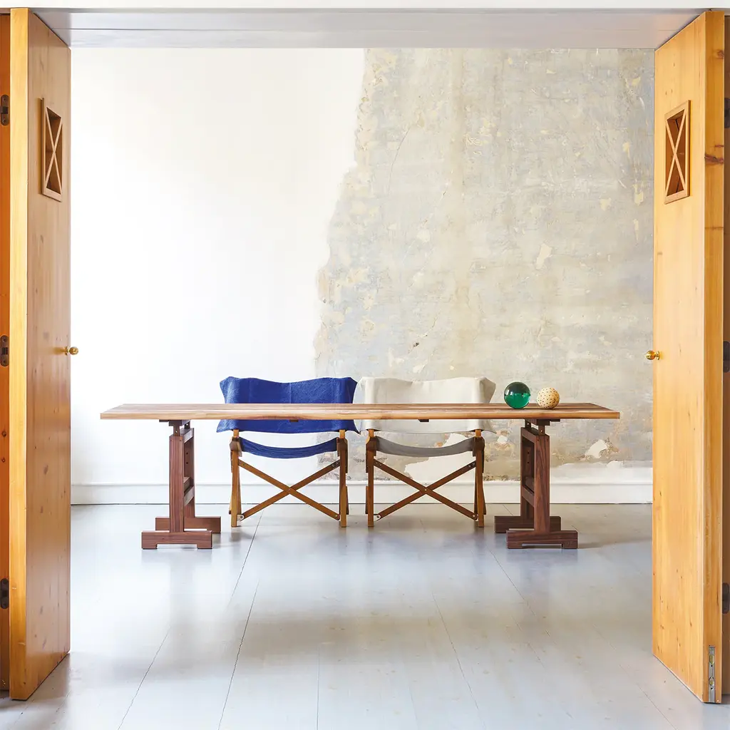 A revisitation of the traditional folding chair and an homage to Dino Gavina who brought this design back in 1974, this piece enriches simple proportions with modern details. The frame is crafted of solid black walnut (iroko wood also available) treated with protective oil with crossed front slats and stainless steel pins. The seat and backrest are fashioned of cerulean fabric, and the backrest is removable and turns into a bag to carry the folded chair. This chair conveys visual lightness in a comfortable silhouette that can easily transition from patio to living room.