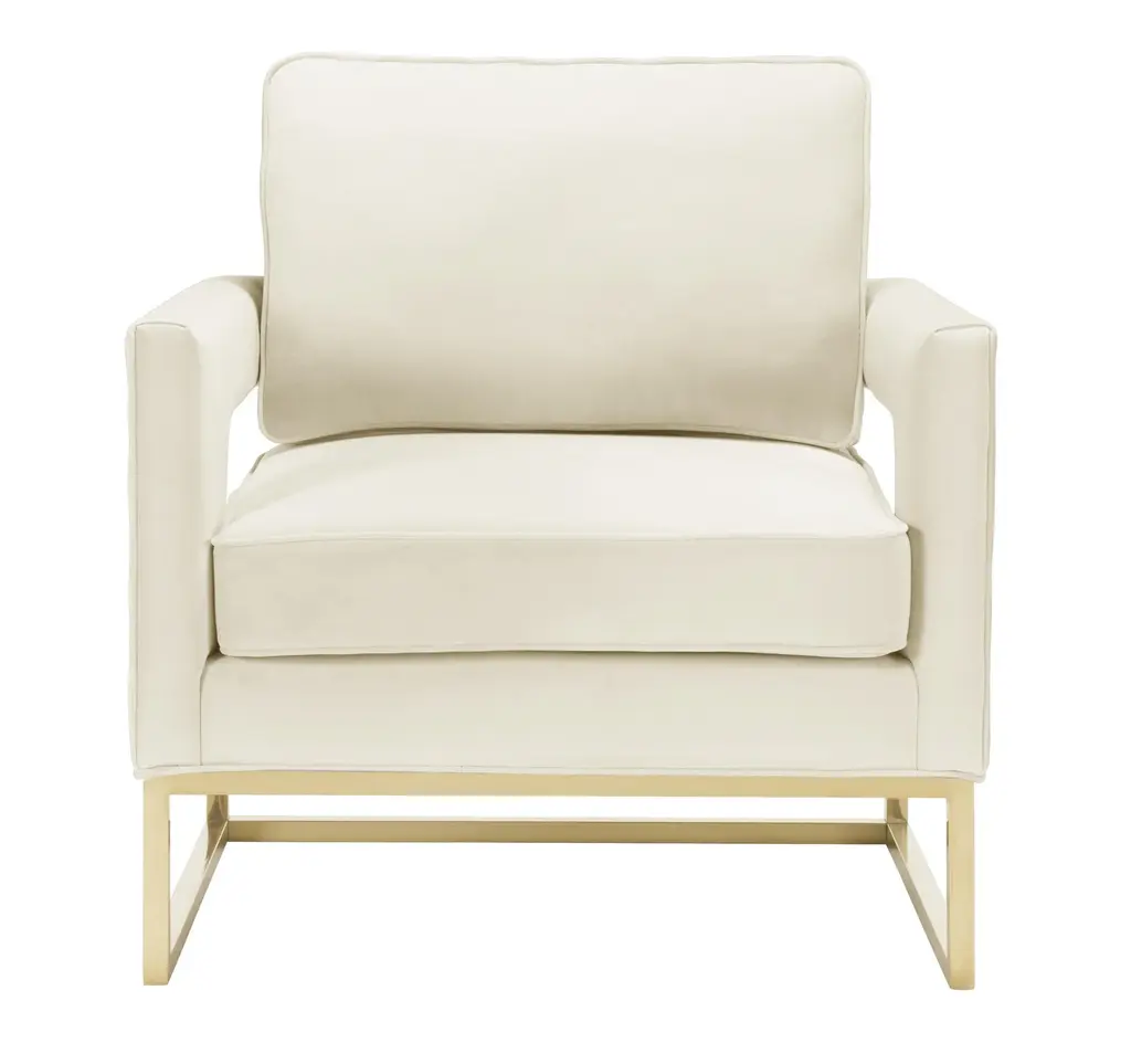 A unique combination of comfort and elegant design, this armchair will create a sophisticated ambiance in both a Classic and a contemporary home. As accent chair in a living room or entryway, this piece will make an elegant statement. Its metal structure connects armrests and base and is adorned at the back with a decoration of crossing rods. The metal is coated with 24-karat gold and supports the cushions of seat and back in hypoallergenic polyurethane covered in beige velvet with tufted back and armrests.