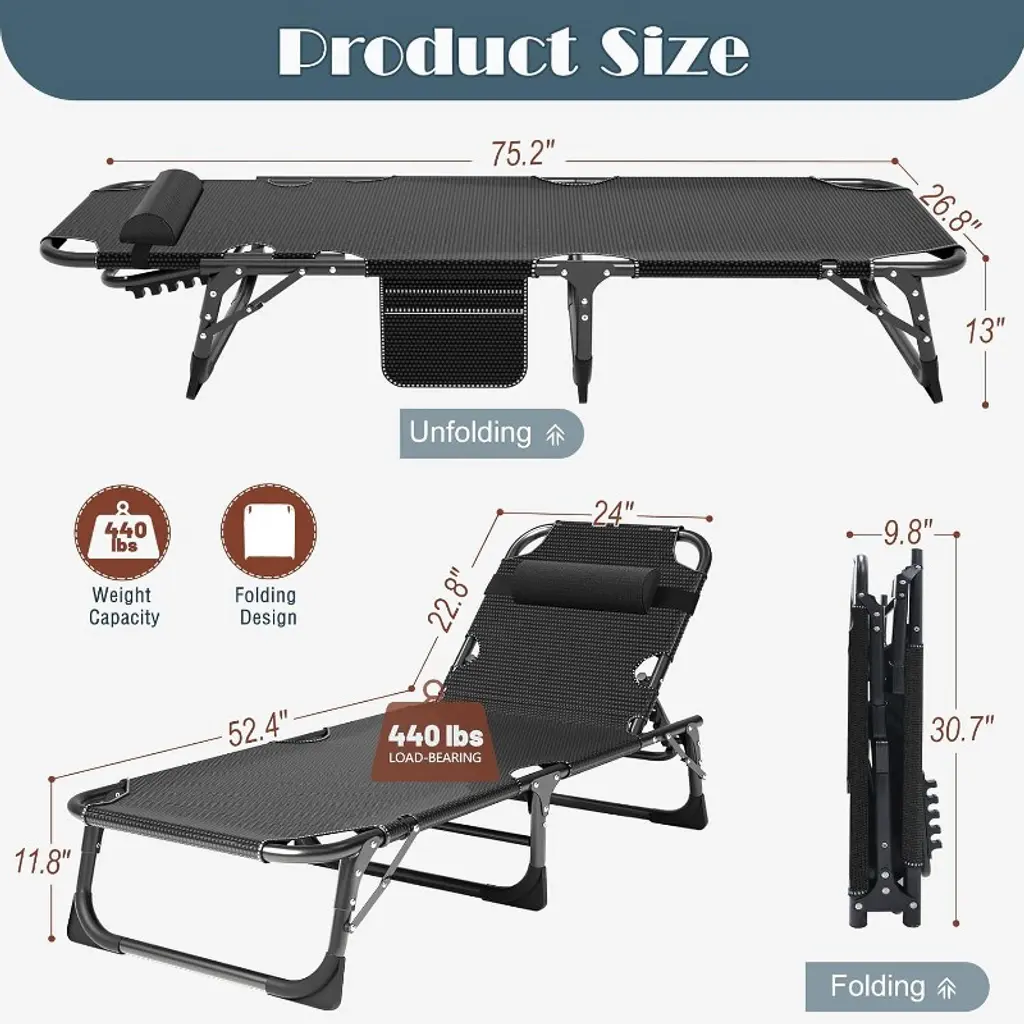Designed with a 5 positions adjustable locking system, this sturdy folding cot allows you to adjust it to a comfortable position as needed. You can recline or lay flat. Ergonomic design is good for your back, can also help reducing muscle tension and stress. The folding cot unfold size: L75.2" x W26.8" x H11.8". Folded size: 30.7" x 26.8" x 9.8", very easy to carry. Heavy duty folding chaise lounge chairs are built for last. Comes with soft pad and detachable pillow for a more comfortable sleep on this portable folding recliner; This Folding Chaise Lounge Chair is made of sturdy aluminium and iron tubes, ensuring it can hold up to 440 lbs; The breathable materials can provide maximum breathability and comfort. Perfect for any outdoor setting, this chair is a reliable and versatile choice. Our lounge chair is perfect for relaxing at home, by the pool, at the beach or as a comfortable bed cot to sleep while camping. Convenient for camping, overnight hiking, trekking, hunting, road trip, also ideal for indoor and office lunch break use.
