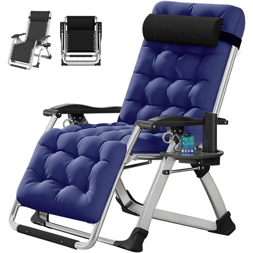 Designed with a 5 positions adjustable locking system, this sturdy folding cot allows you to adjust it to a comfortable position as needed. You can recline or lay flat. Ergonomic design is good for your back, can also help reducing muscle tension and stress. The folding cot unfold size: L75.2" x W26.8" x H11.8". Folded size: 30.7" x 26.8" x 9.8", very easy to carry. Heavy duty folding chaise lounge chairs are built for last. Comes with soft pad and detachable pillow for a more comfortable sleep on this portable folding recliner; This Folding Chaise Lounge Chair is made of sturdy aluminium and iron tubes, ensuring it can hold up to 440 lbs; The breathable materials can provide maximum breathability and comfort. Perfect for any outdoor setting, this chair is a reliable and versatile choice. Our lounge chair is perfect for relaxing at home, by the pool, at the beach or as a comfortable bed cot to sleep while camping. Convenient for camping, overnight hiking, trekking, hunting, road trip, also ideal for indoor and office lunch break use.