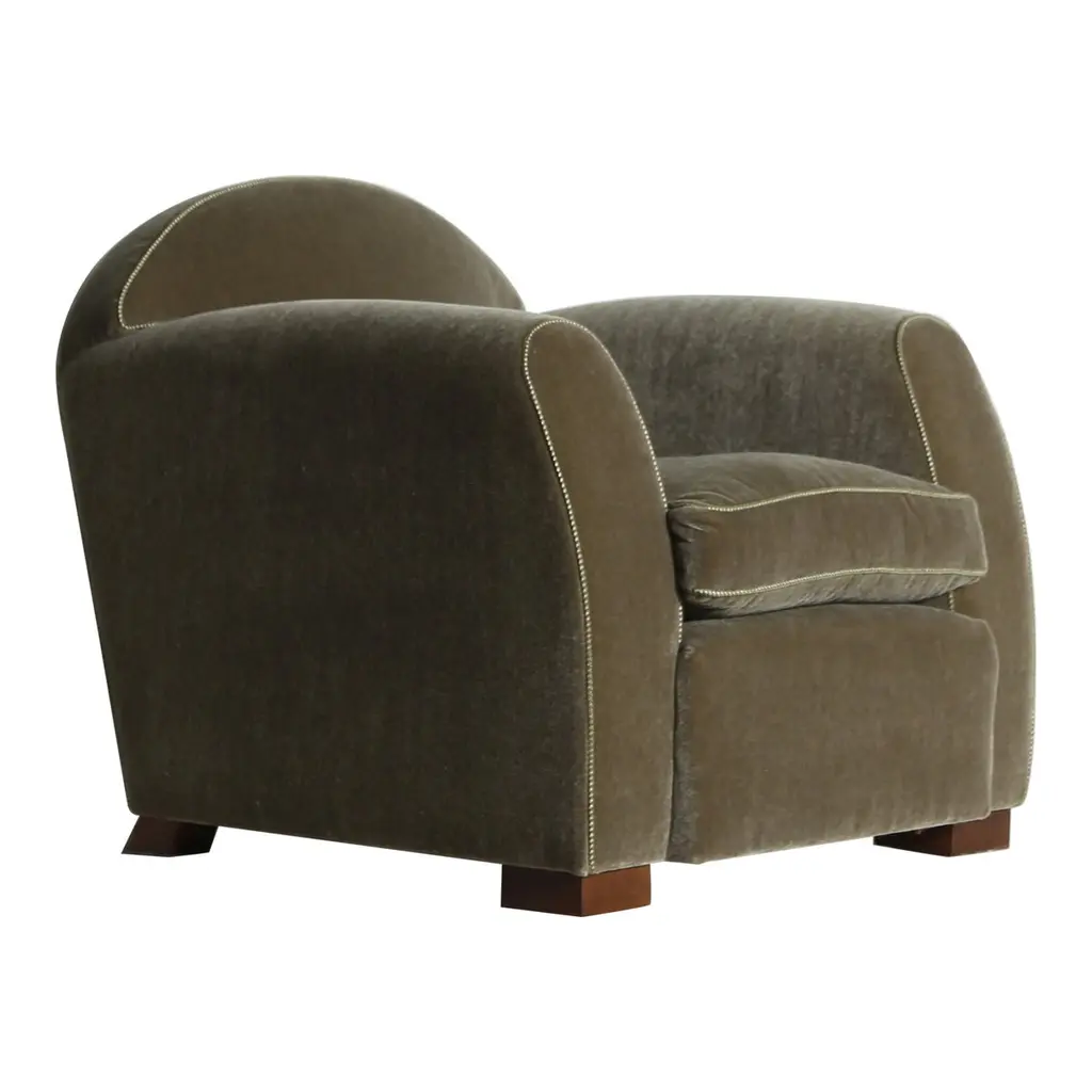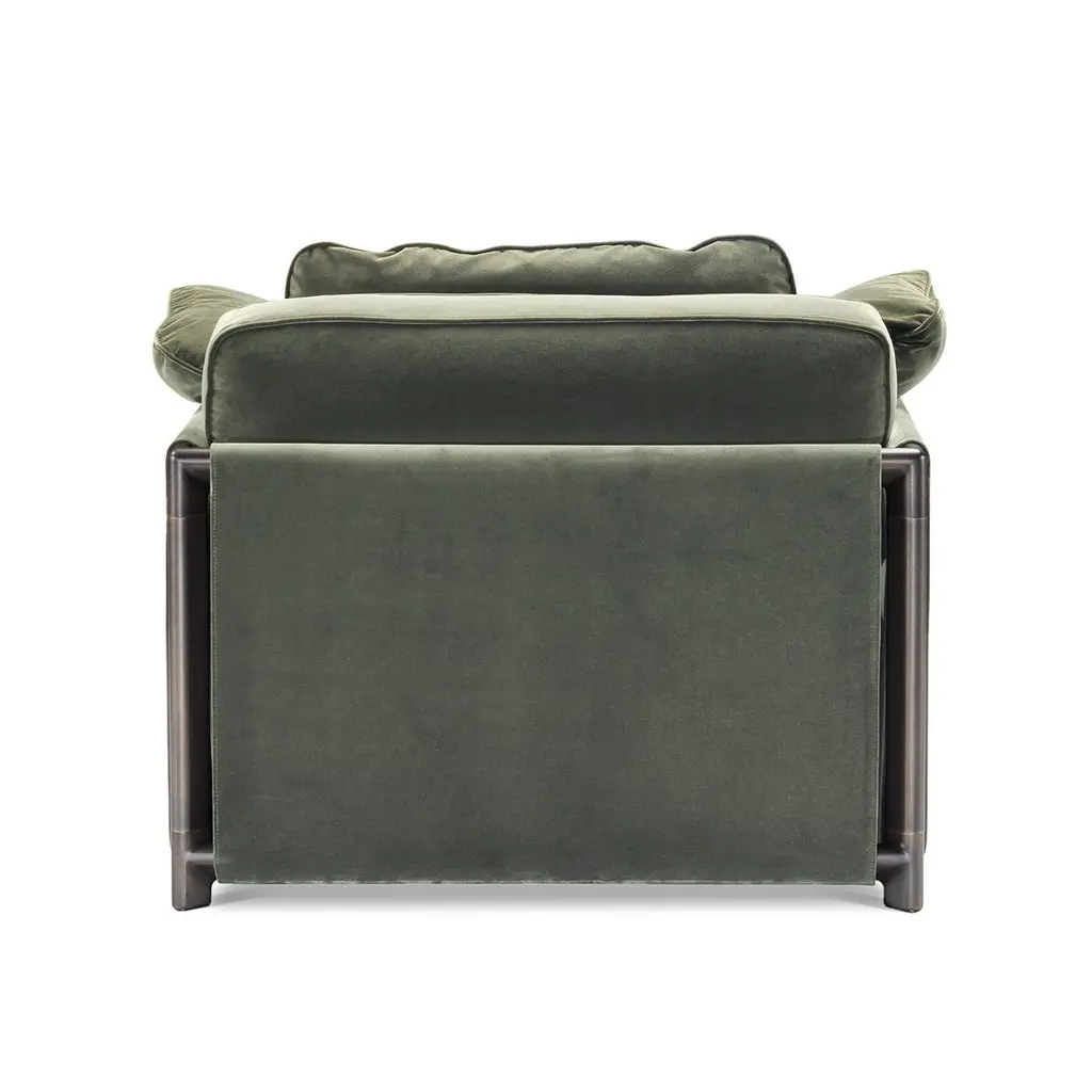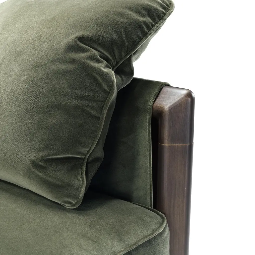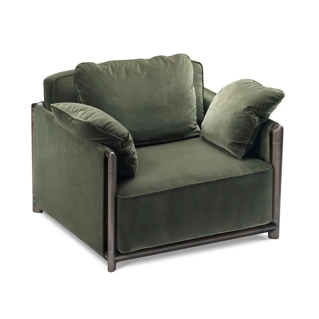 Ideal to be paired with its sofa counterpart for a cohesive look, this armchair couples neat lines to generous volumes to provide excellent comfort without renouncing sober elegance, Fluffy cushions covered in soft, green fabric comprise the seat, backrest, and armrests, enveloping the user in a soft embrace, while structural support is guaranteed by the sturdy metal frame marked by clean lines.