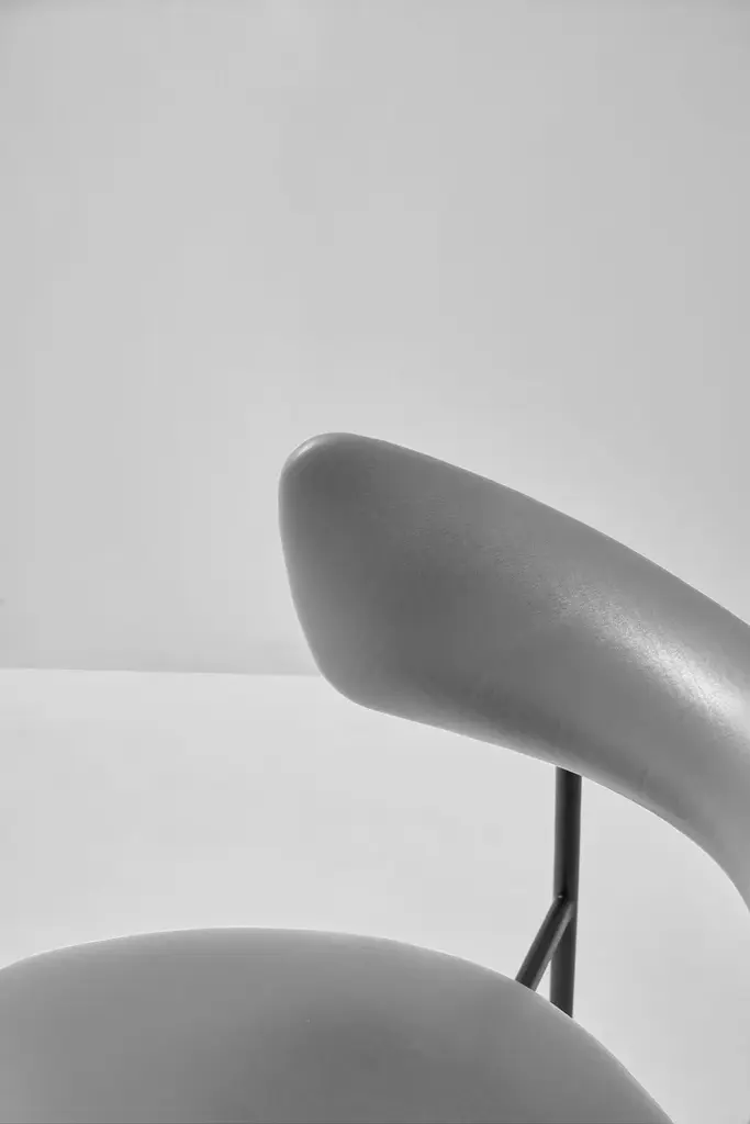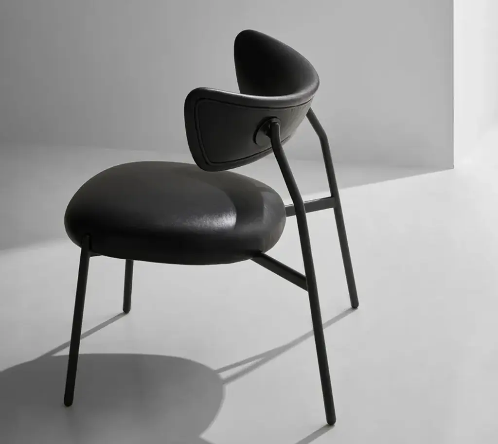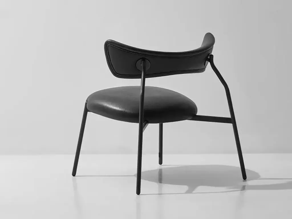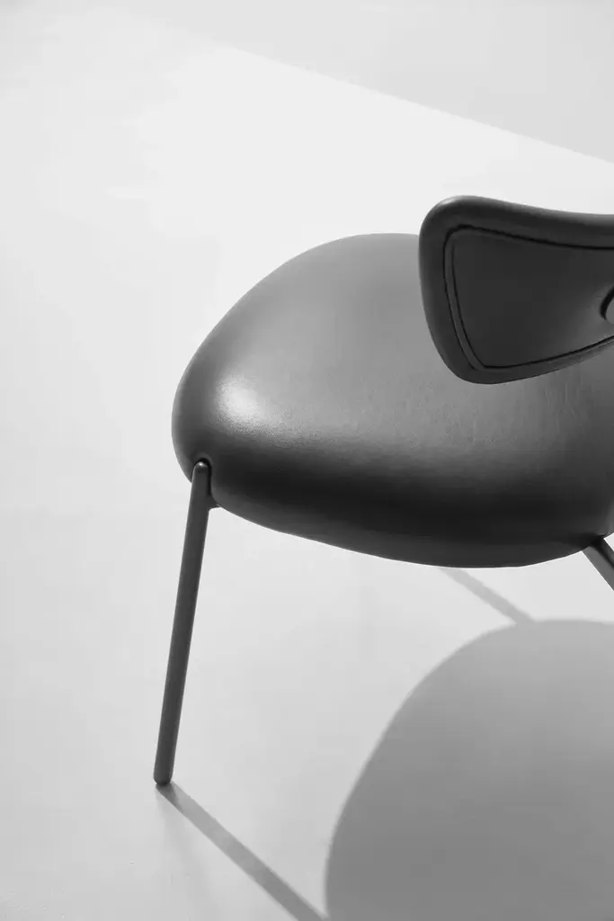 The Dragonfly Lounge Chair emphasizes its distinct shape with a strong, sharp, and wide backrest. Its frame is built with a black steel tube, while the seat comes in either a leather or fabric finish.