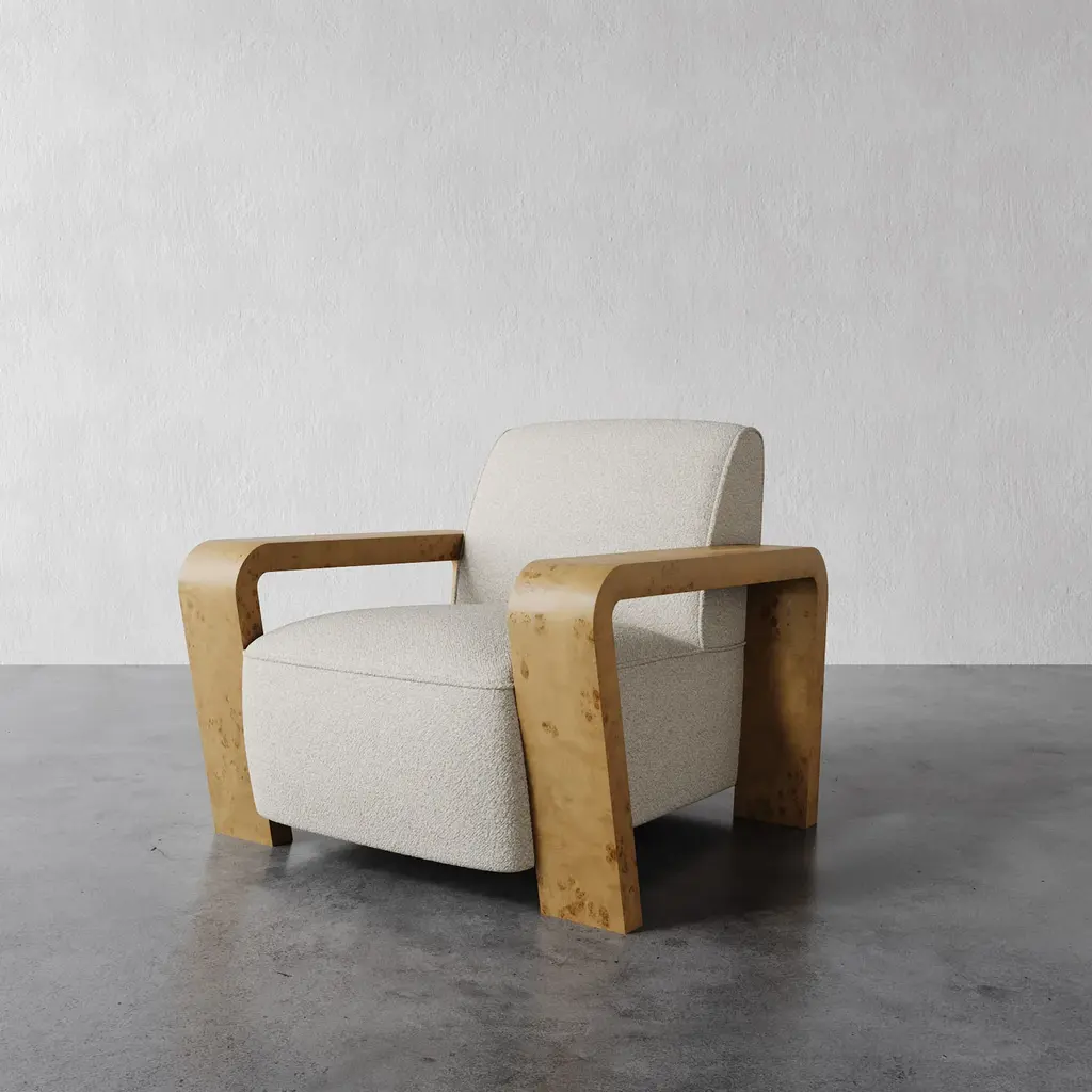 The Dumas Lounge Chair combines a clean, tightly tailored seat and back with wide Oak burl arms, creating a distinctive and inviting design. Its deep seat and curving legs pay homage to the Art Deco lounge chairs of the 1930s, mixing vintage inspiration with modern design. Available in a variety of luxurious fabrics, the Dumas Lounge Chair is a perfect addition to any living space, blending classic design with modern comfort.