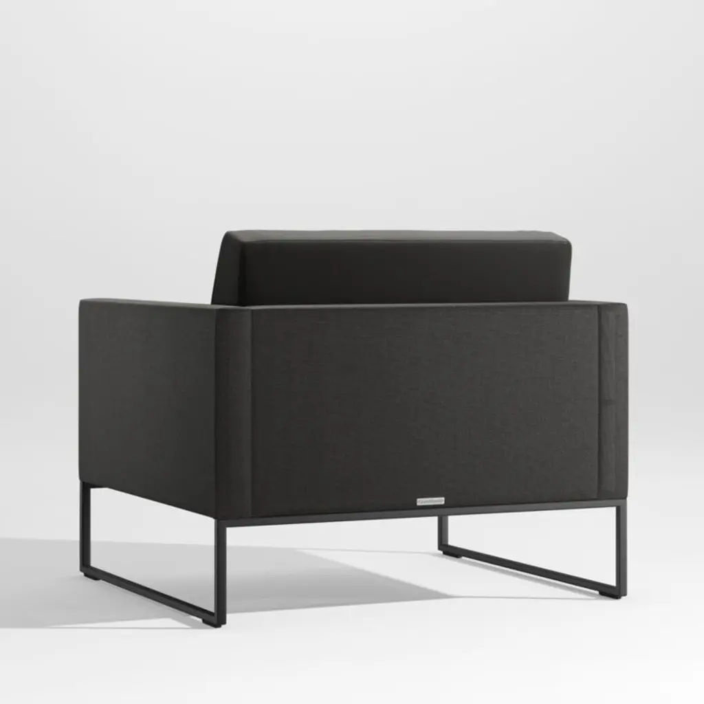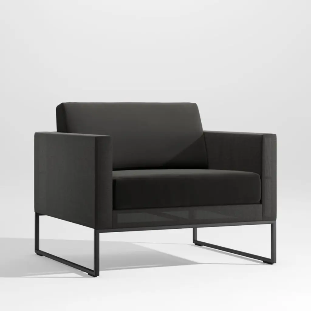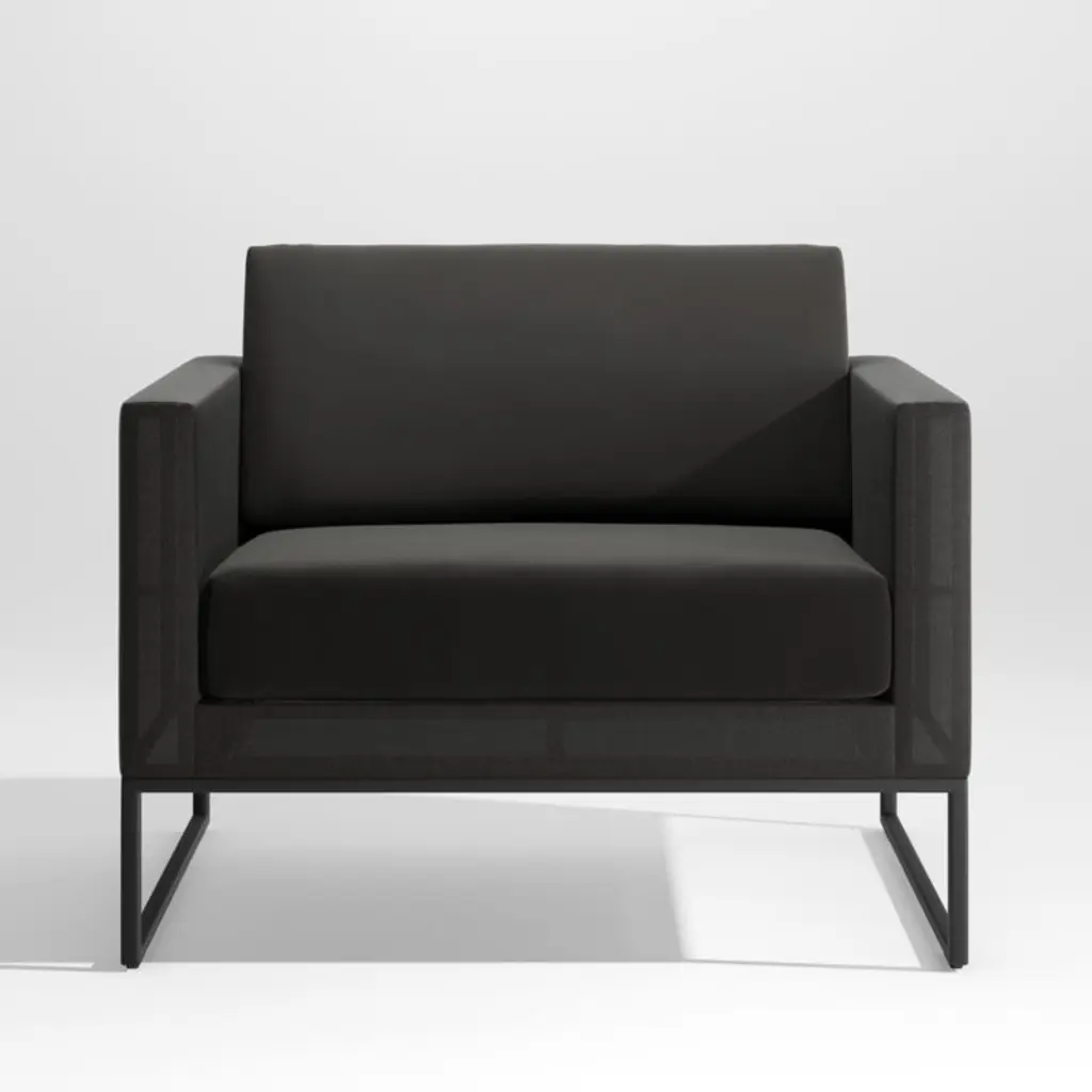 Our urban-style Dune outdoor collection forms the centerpiece of a truly modern "indoor room" that lives outdoors. Outdoor-grade aluminum constructs the lounge chair's crisp linear frame cloaked in black synthetic mesh that's fade-, mold-, tear- and stain-resistant. Matching black cushions tailored in weather-resistant acrylic are a custom fit. The Dune black outdoor lounge chair is a Crate & Barrel exclusive.