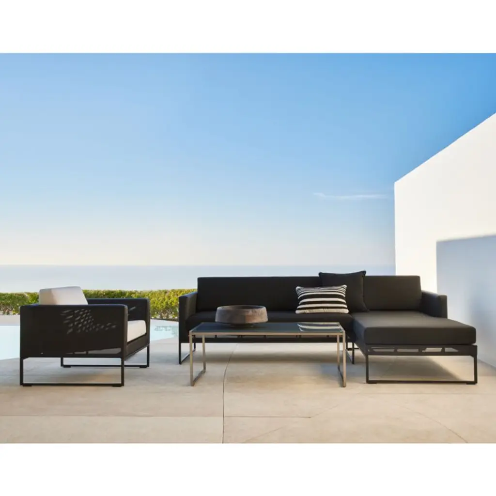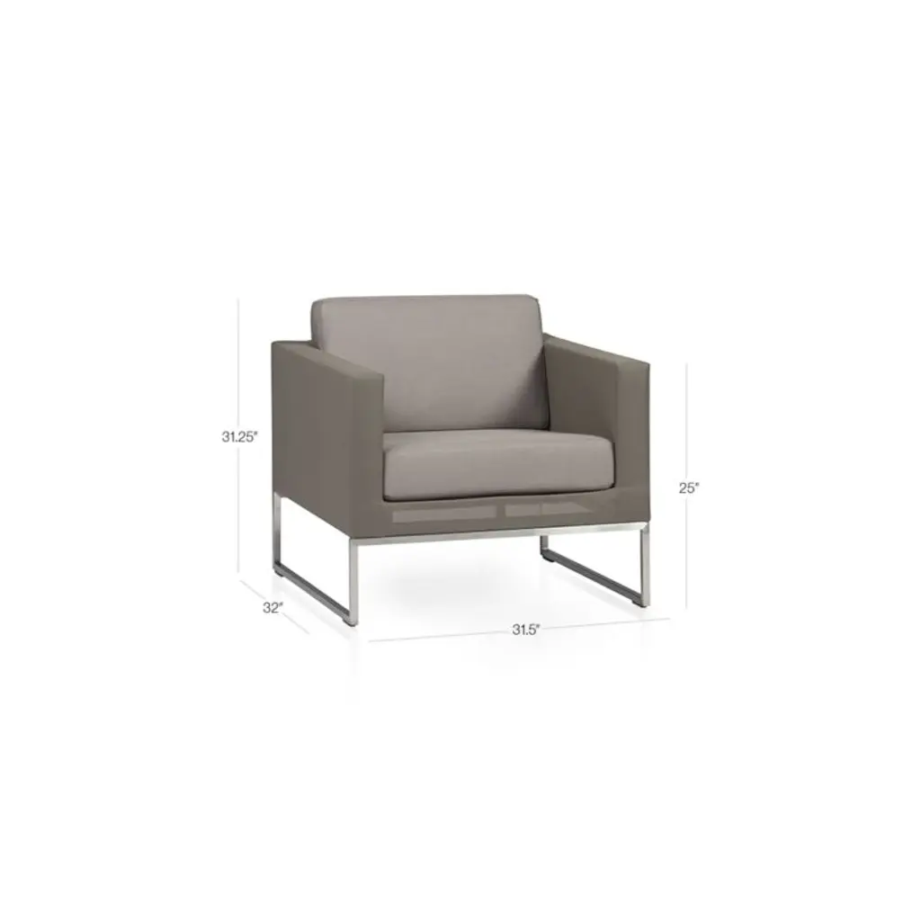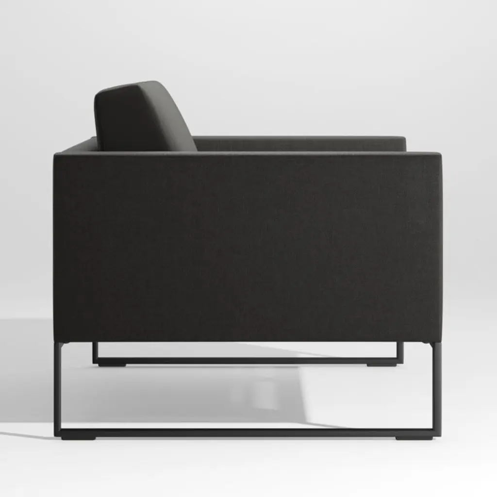Our urban-style Dune outdoor collection forms the centerpiece of a truly modern "indoor room" that lives outdoors. Outdoor-grade aluminum constructs the lounge chair's crisp linear frame cloaked in black synthetic mesh that's fade-, mold-, tear- and stain-resistant. Matching black cushions tailored in weather-resistant acrylic are a custom fit. The Dune black outdoor lounge chair is a Crate & Barrel exclusive.