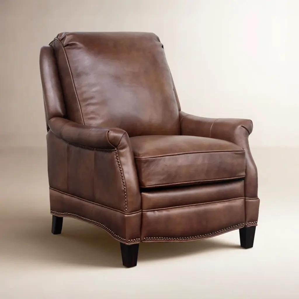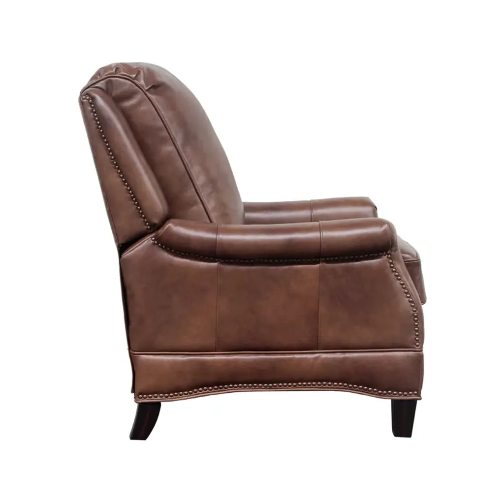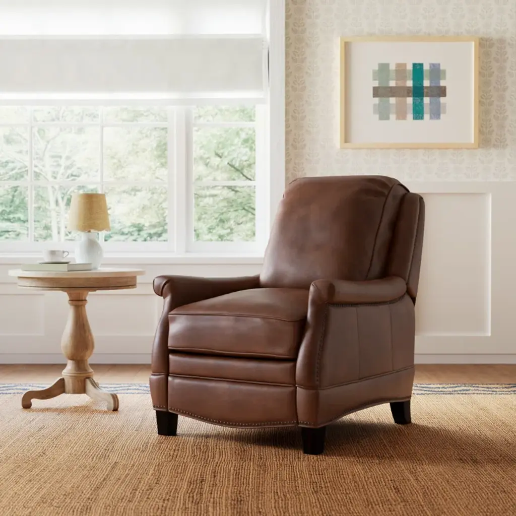 We think this genuine leather recliner is just the right addition for your living room or study. It has warm and welcoming top grain leather upholstery, nailhead trim details and a club-chair inspired design for a traditional feel. This manual recliner is made with a solid and engineered wood frame, and has a coil-spring seat that supports its foam- and down-filled seat cushion. It has three reclining positions – all you need to do is push back to relax with a good book, company, or the big game.