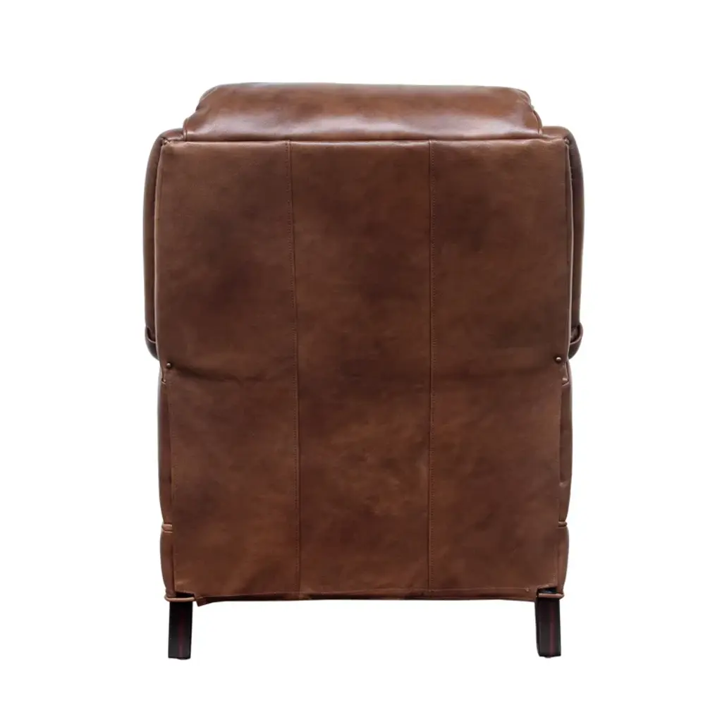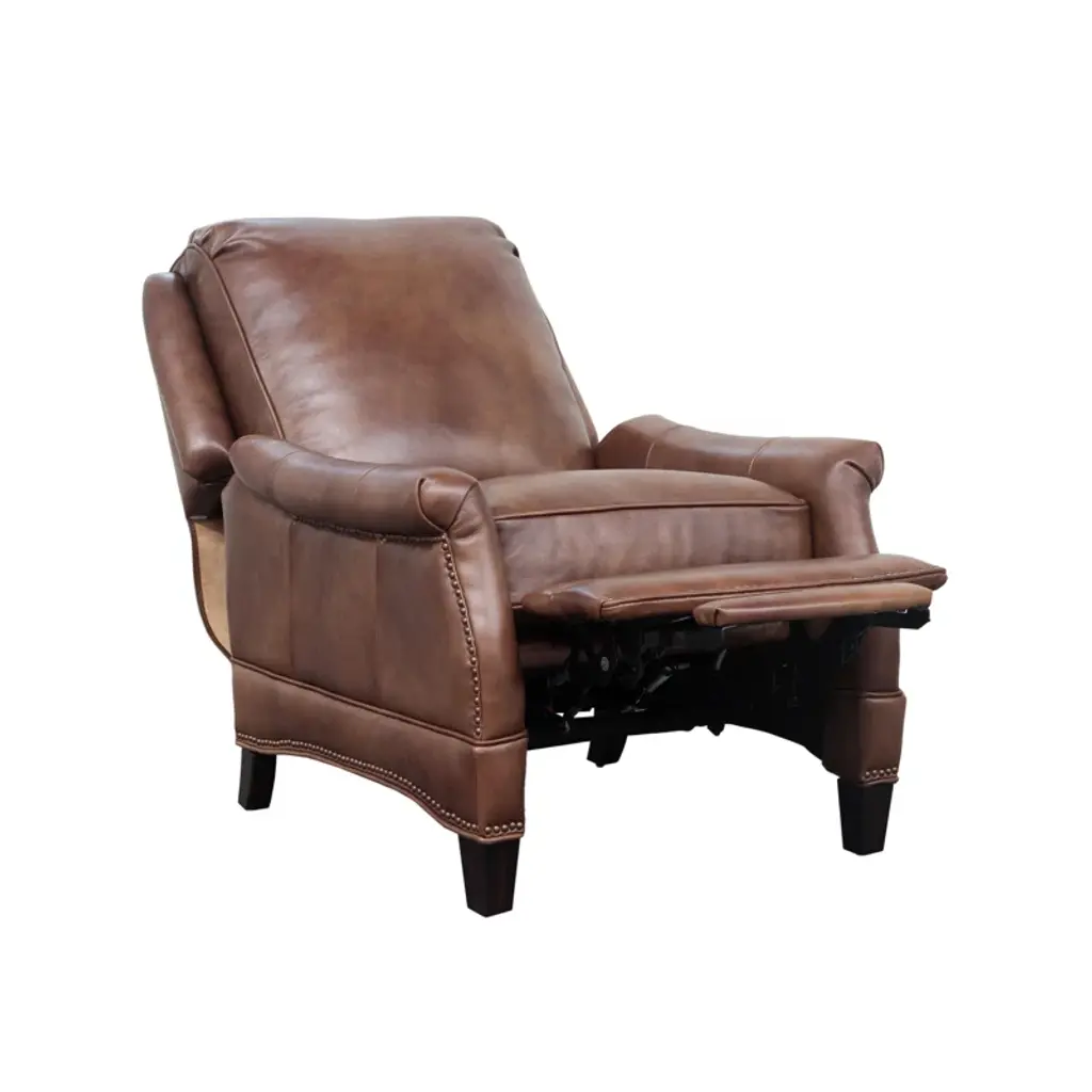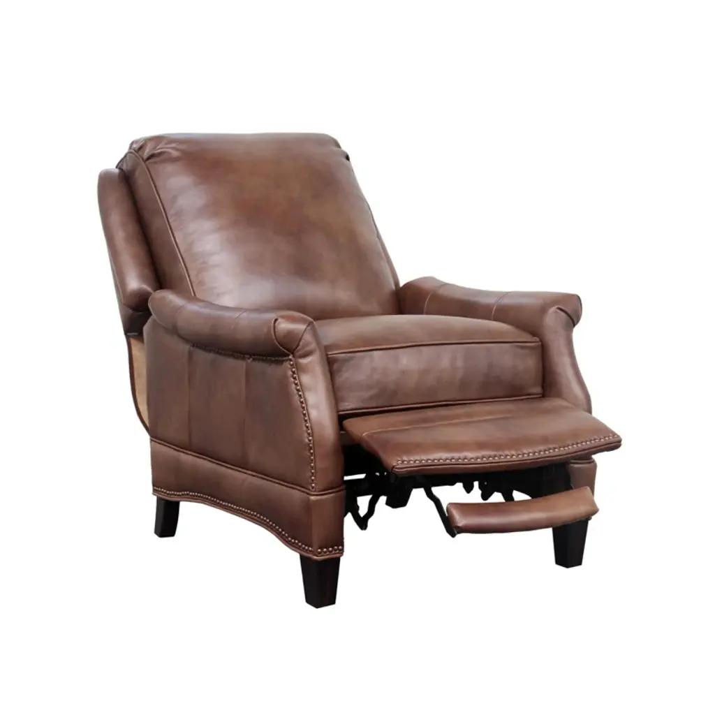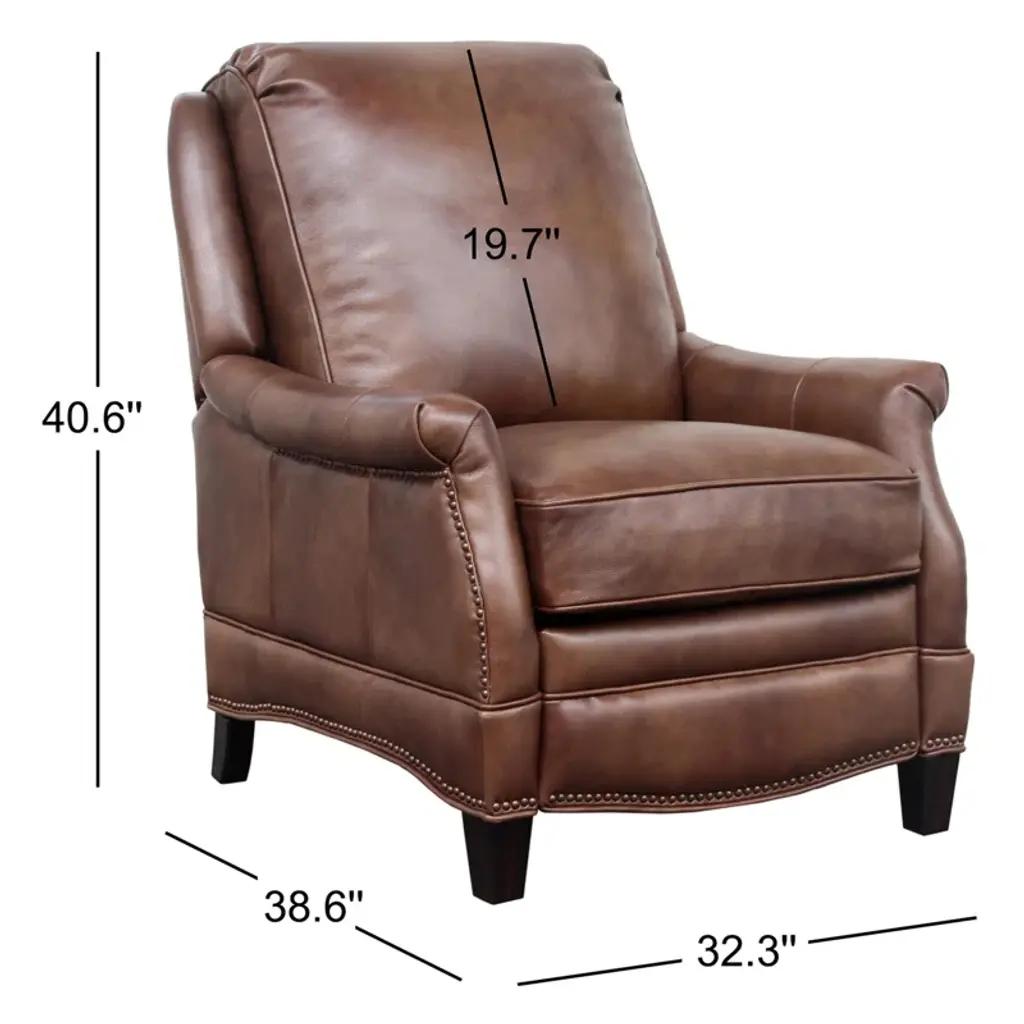 We think this genuine leather recliner is just the right addition for your living room or study. It has warm and welcoming top grain leather upholstery, nailhead trim details and a club-chair inspired design for a traditional feel. This manual recliner is made with a solid and engineered wood frame, and has a coil-spring seat that supports its foam- and down-filled seat cushion. It has three reclining positions – all you need to do is push back to relax with a good book, company, or the big game.