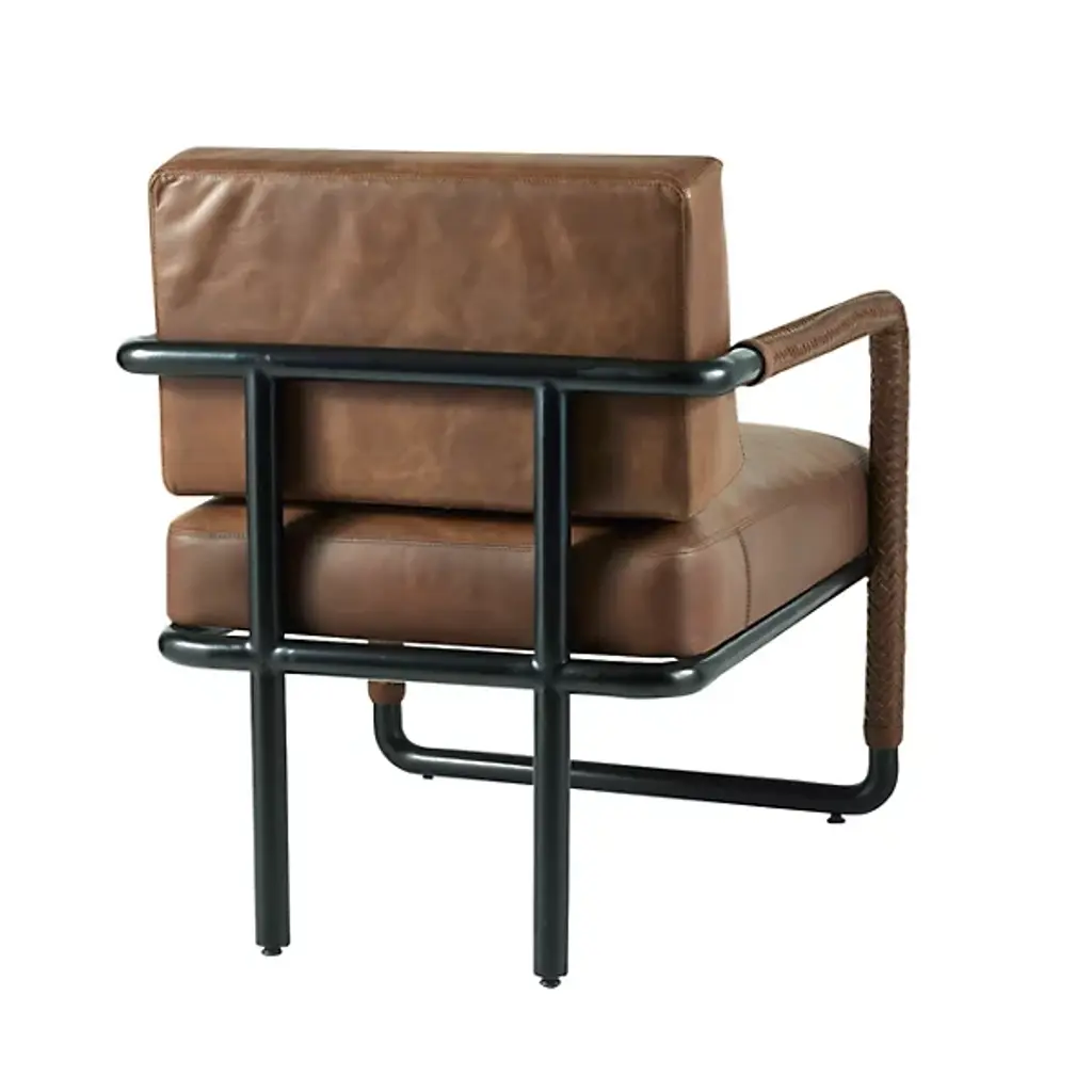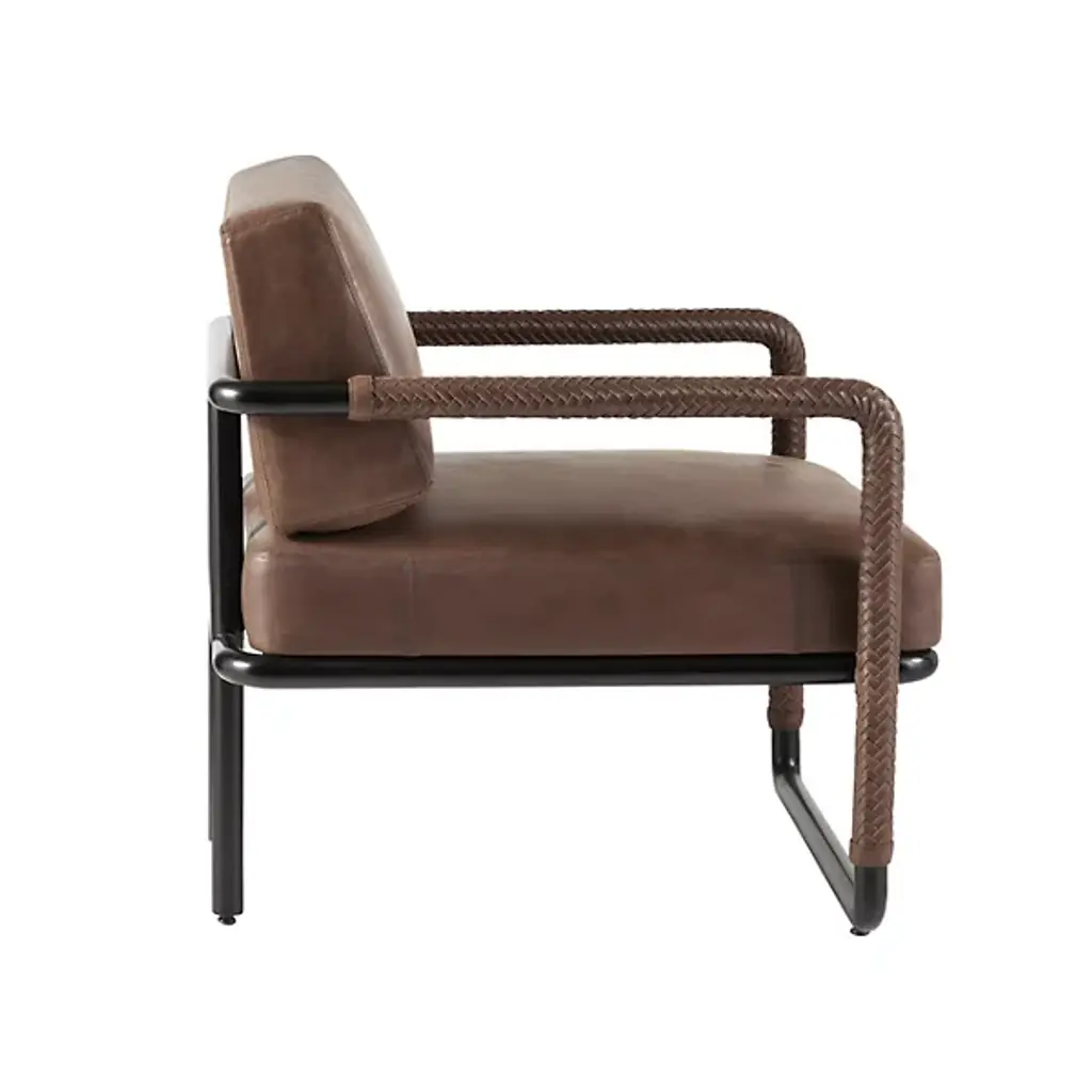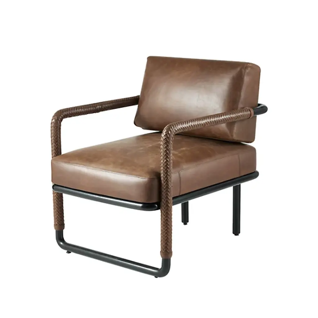 The Durham Accent Chair from Arteriors is a modern reimagining of the classic leather club chair. It features a modern open-armed design accented with intricate pieced details. Each arm features tactile braided leather in a rich cognac hue, complementing the sturdy mid-century lines. Slight variations in the finish make each piece unique. An open blackened bronze stainless steel frame adds a lighter, vintage feel, making it easy to place in any setting with its generous proportions and intricate design.