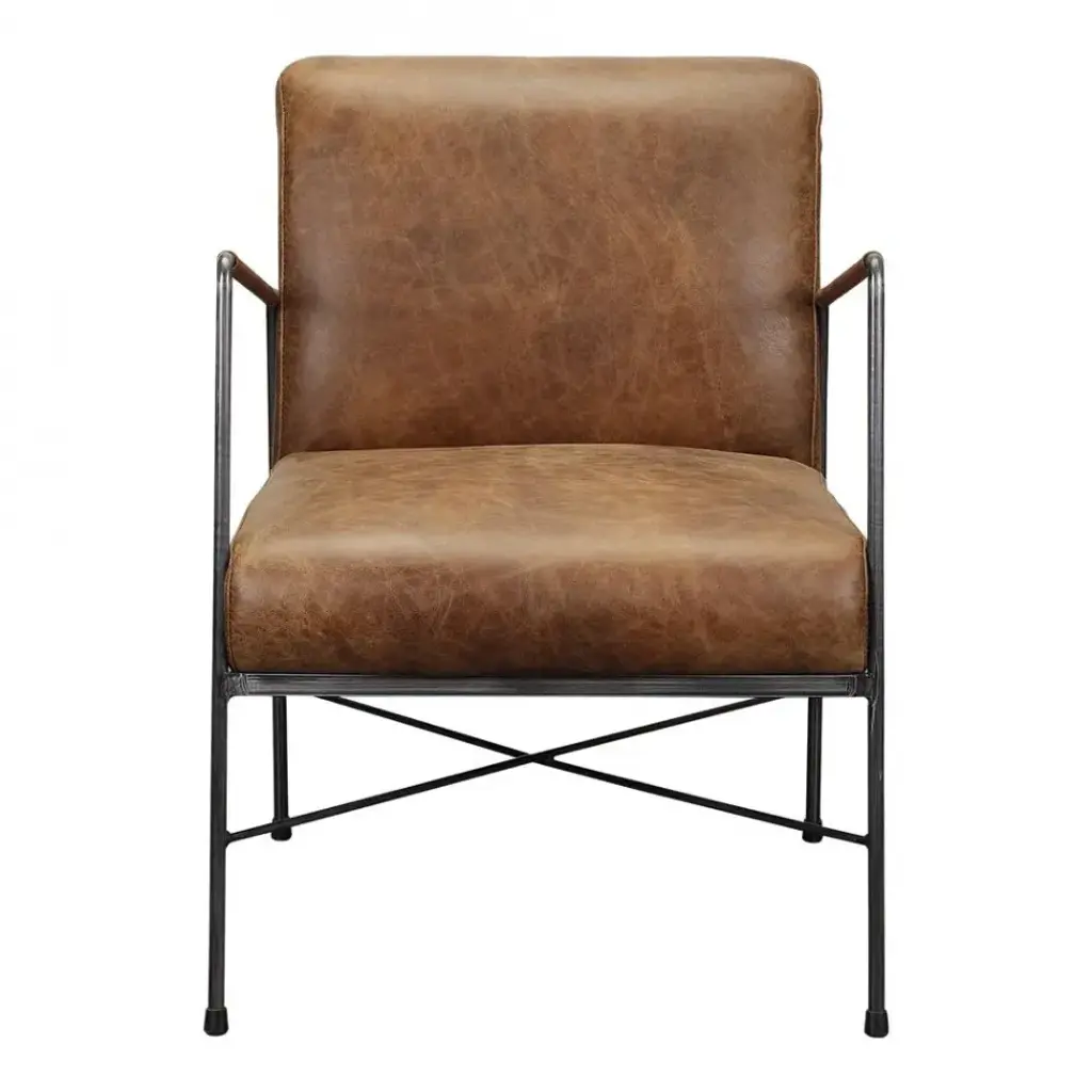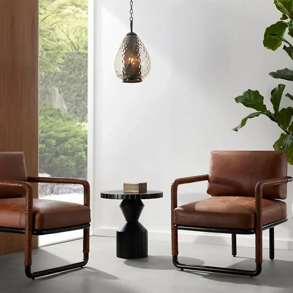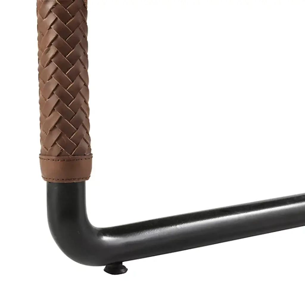 The Durham Accent Chair from Arteriors is a modern reimagining of the classic leather club chair. It features a modern open-armed design accented with intricate pieced details. Each arm features tactile braided leather in a rich cognac hue, complementing the sturdy mid-century lines. Slight variations in the finish make each piece unique. An open blackened bronze stainless steel frame adds a lighter, vintage feel, making it easy to place in any setting with its generous proportions and intricate design.