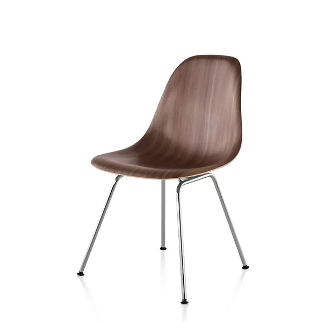 Bring a sleek, modern addition to your interiors with the Eames Molded Wood Side Chair with 4-Leg Base from Herman Miller. A 2013 update of the Shell Chair created by the renowned spousal design duo Ray and Charles Eames in the 1950s, it keeps their iconic one-piece contoured shell seat, emblematic of their quest for fun, functional design. It is secured to the robust, four-legged metal base using a series of bolts, ensuring a comfortable seat that accentuates its surroundings rather than overpowering them.