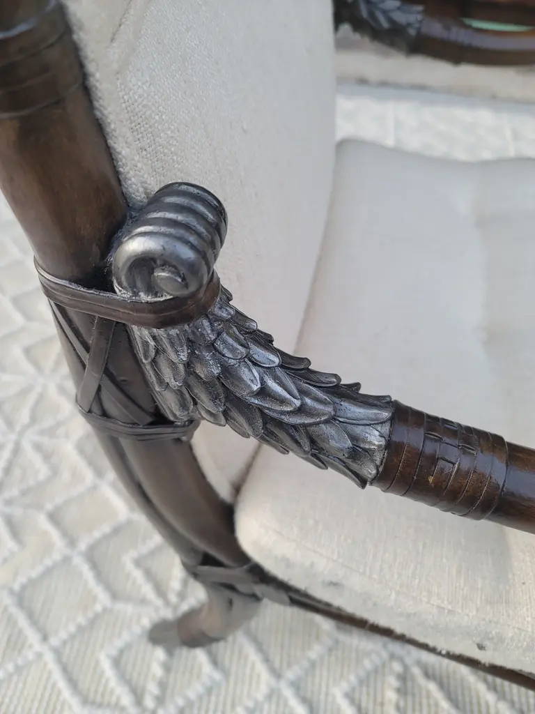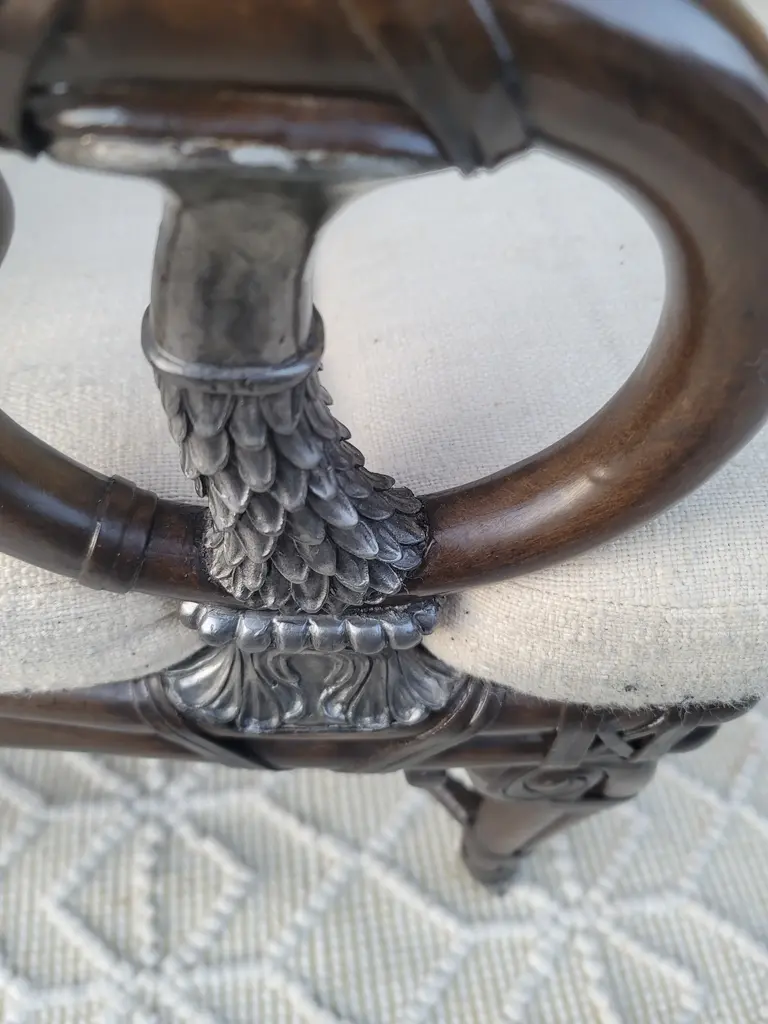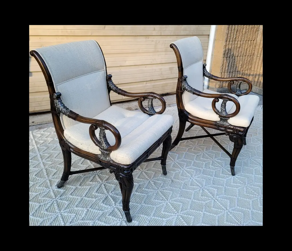 Featured is a unique, possibly custom-made, pair of Contemporary Regency Style Faux Bamboo Armchairs With Pewter Colored Metal Accents. We sourced a total of 6 of these beauties from a grand and luxurious home in Washington DC's prestigious suburb, Bethesda, MD. Sold as pairs. IDN489