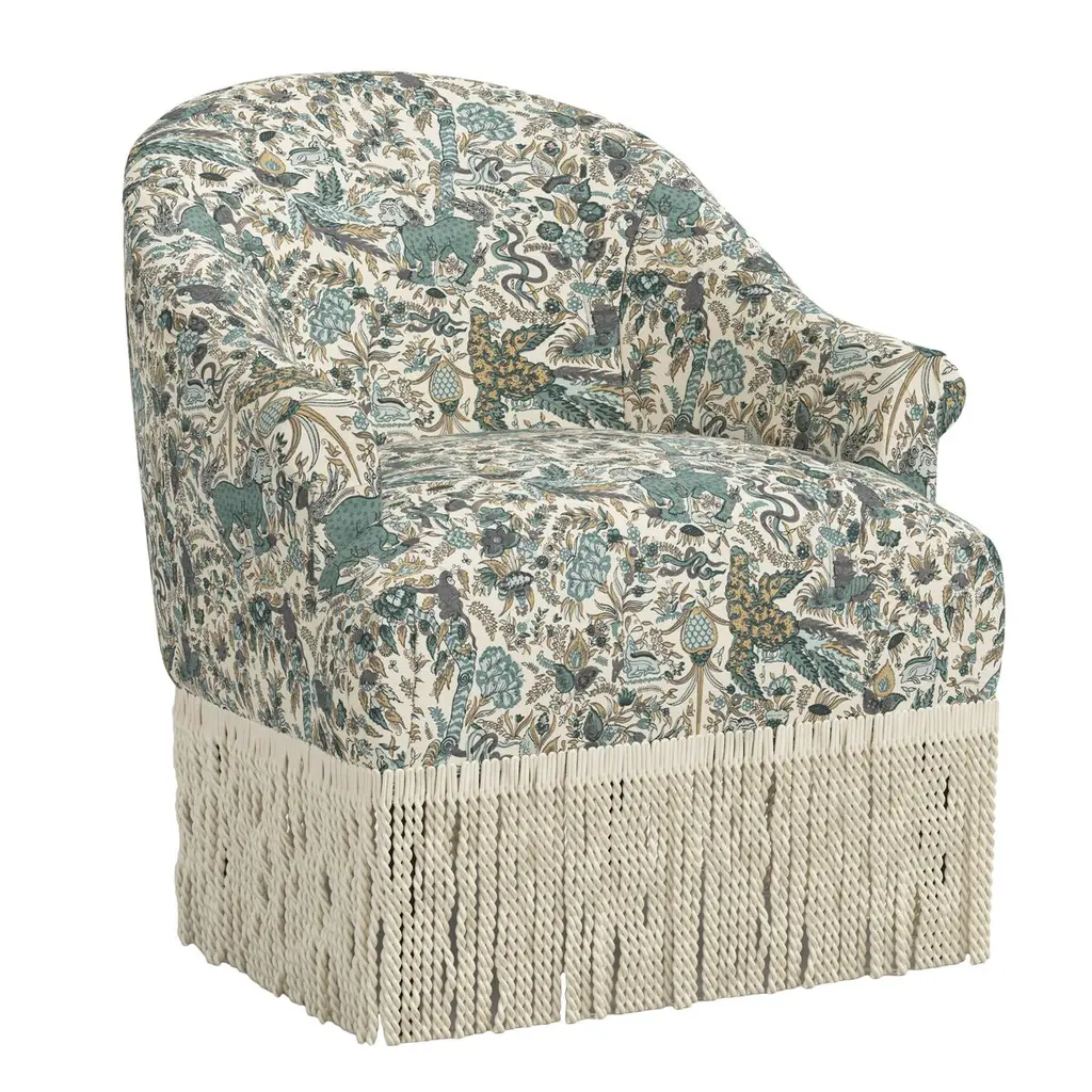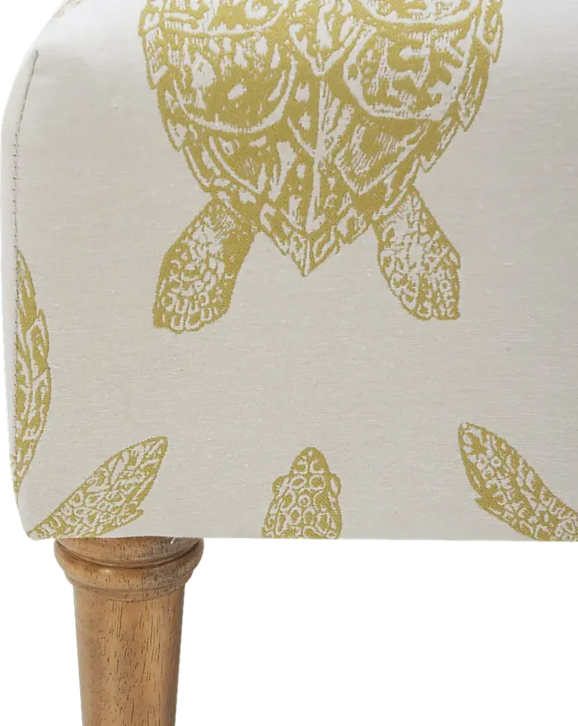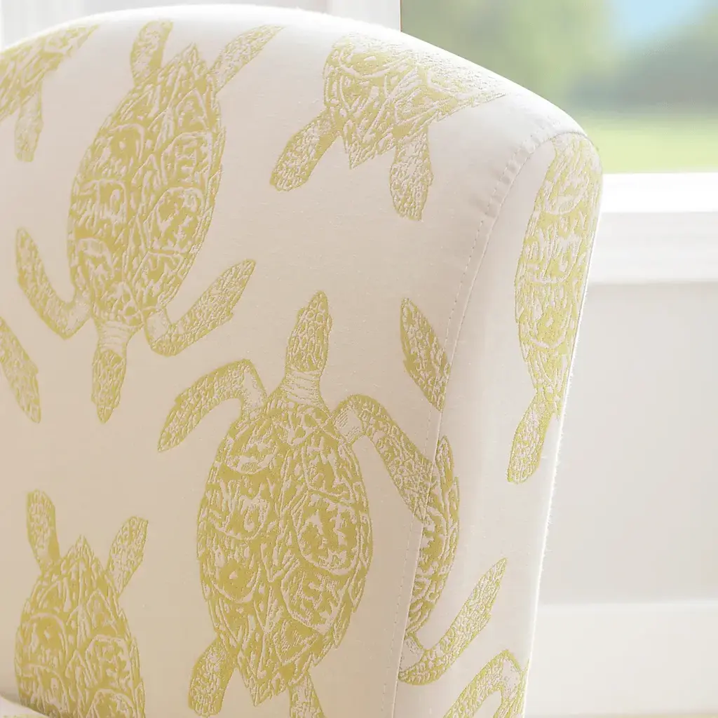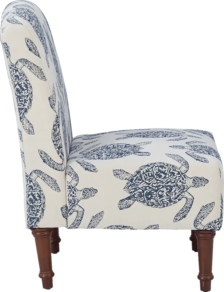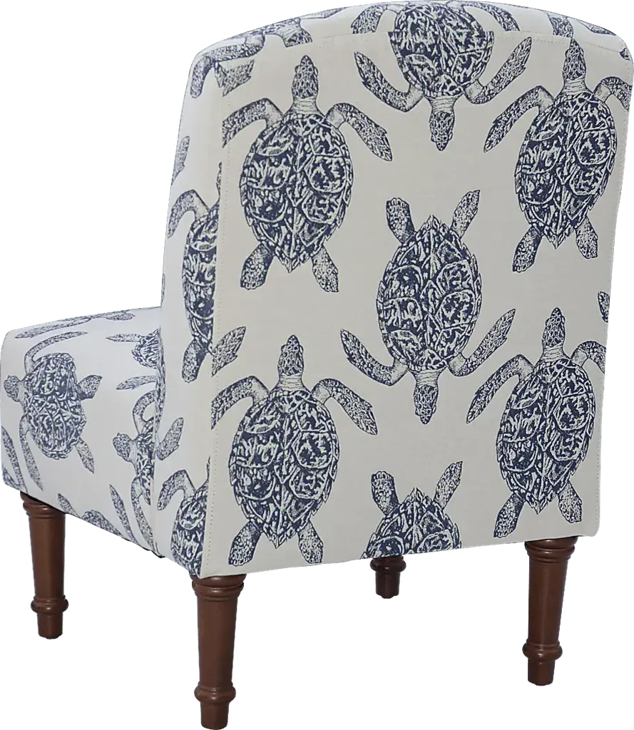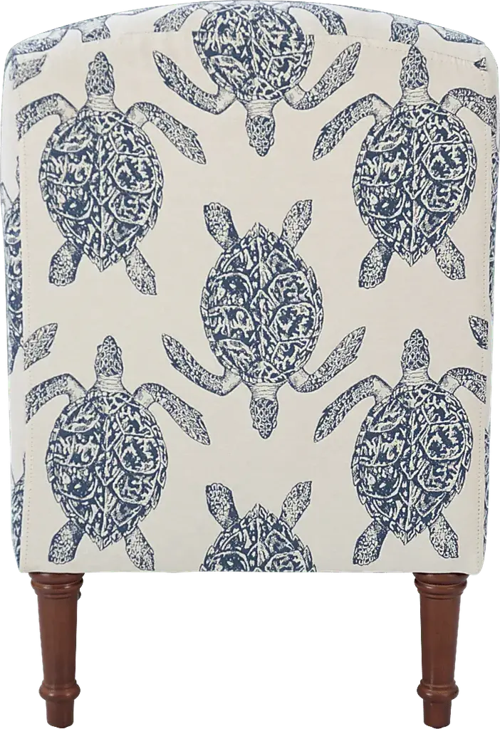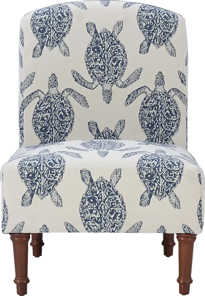 Transform your reading nook or living room with the Eastchill cozy accent chair, perfect for a modern coastal theme. The whimsical turtle print in indigo and cream hues adorns a snug polyester and cotton blend over plush cushions. Supported by a sturdy wooden frame with turned wood legs in a gray wash stain, this chair effortlessly blends modernity with a traditional touch. Its armless design ensures an easy fit in corners and tight spaces, providing both style and comfort to any setting. Customer assembly required.