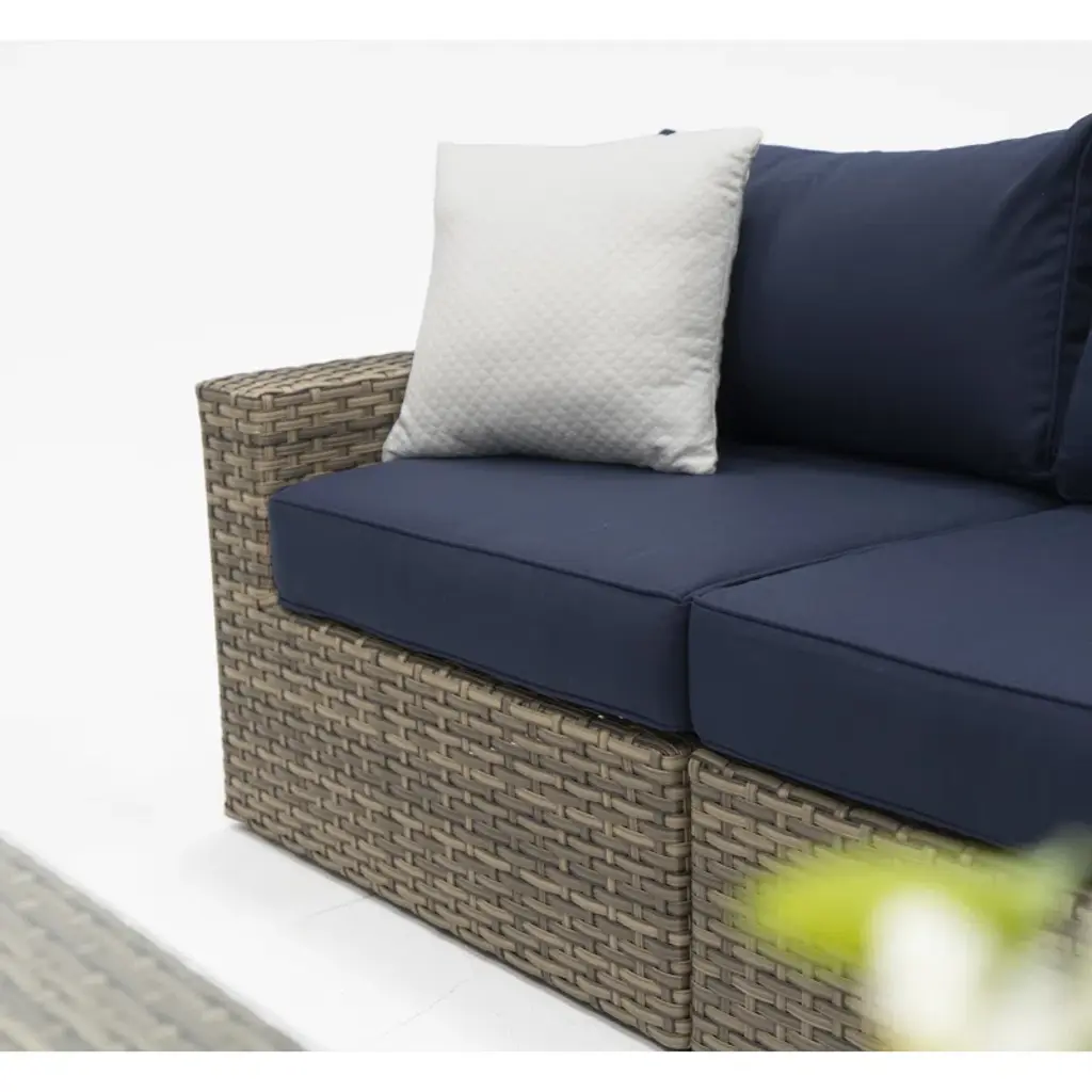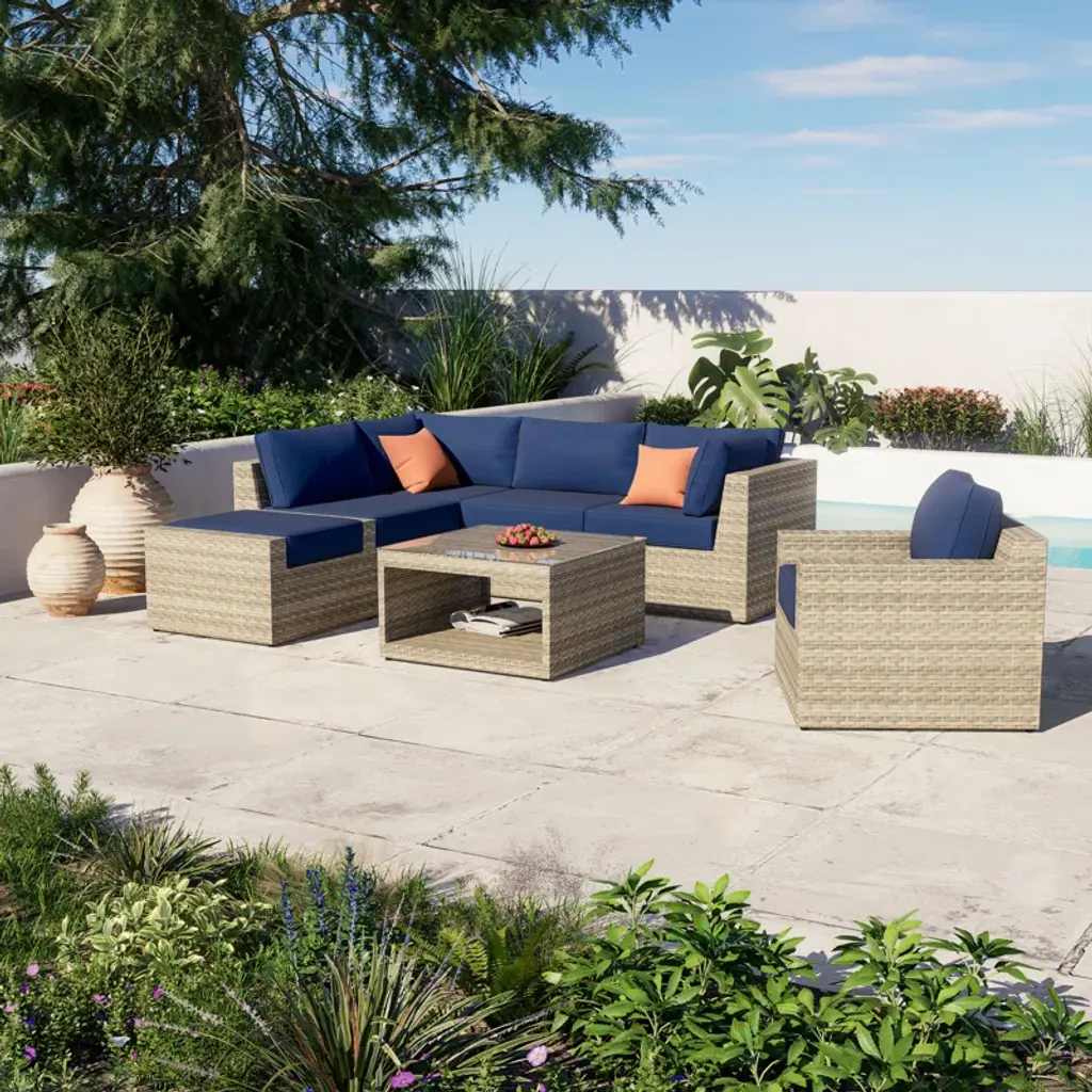 Transform your backyard into an inviting and relaxing hangout spot with a bold 7-piece outdoor conversation set. It includes four modular seats that form a sectional sofa, an ottoman, a club chair, and a square table with a glass-paneled top and an open shelf underneath for all your patio essentials. Each piece has an inner aluminum frame that's wrapped in all-weather PE wicker rattan. Water- and UV-resistant, machine-washable olefin seat and back cushions come with this seating group, and they're filled with foam for just the right amount of support as you sit.