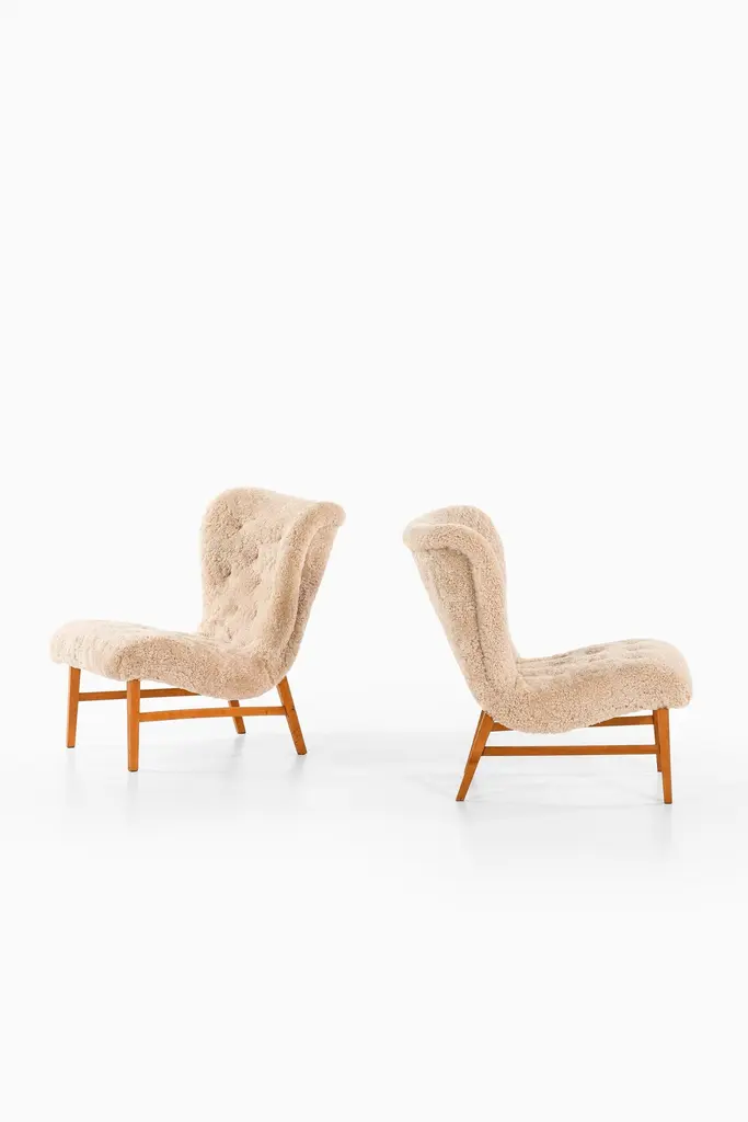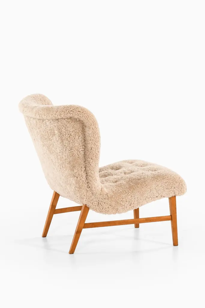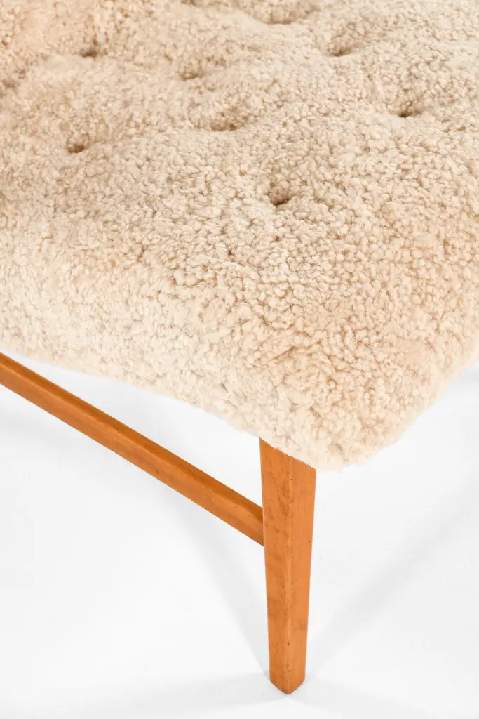 Easy Chairs in Beech and Newly Reupholstered in Sheepskin with Leather Buttons by Erik Bertil Karlén, 1940'sAdditional Information:Material: Beech and newly reupholstered in sheepskin with leather buttonsStyle: Mid century, ScandinavianProduced by Firma Rumsinteriör in SwedenDimensions (W x D x H): 73 x 84 x 79 cmSeat Height: 40 cmCondition: Good vintage condition, with minor signs of usageListed price is / chair