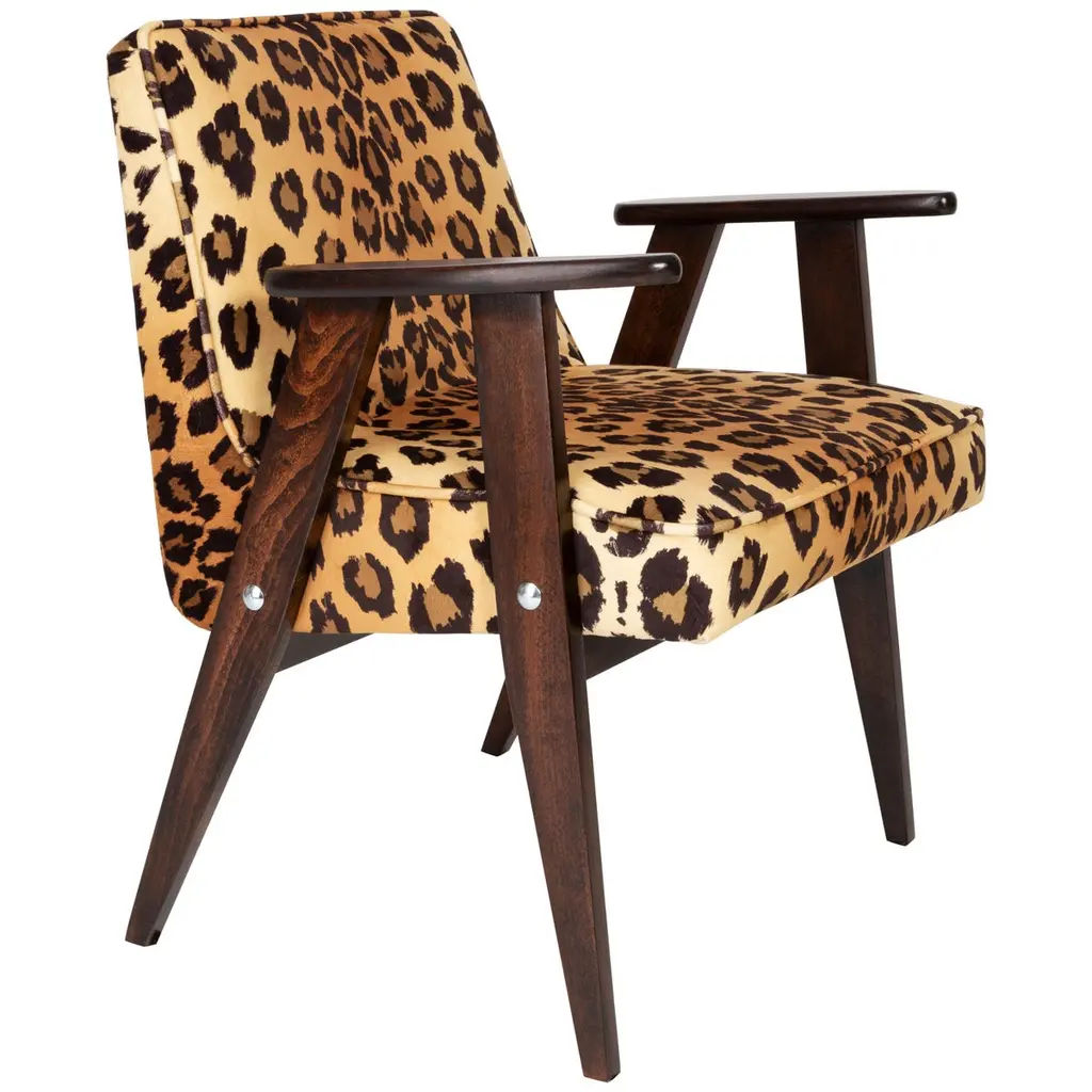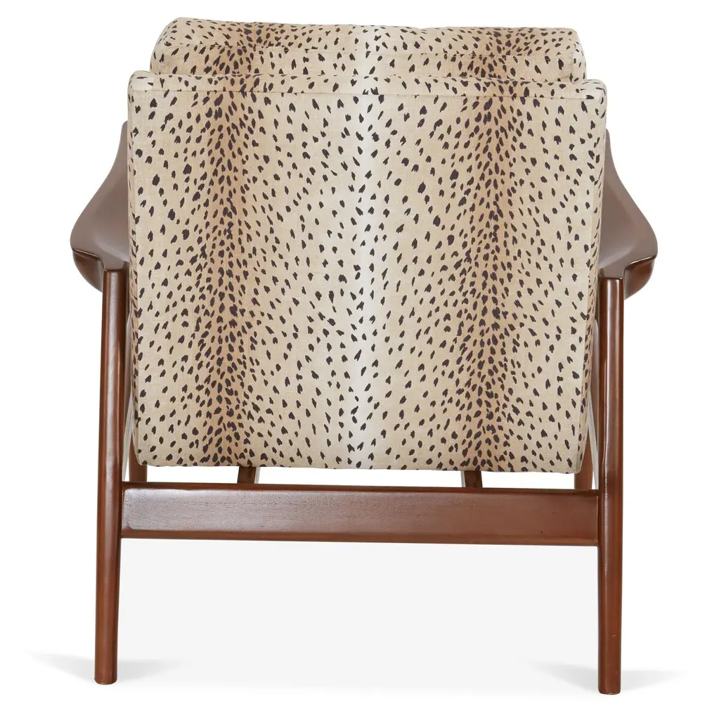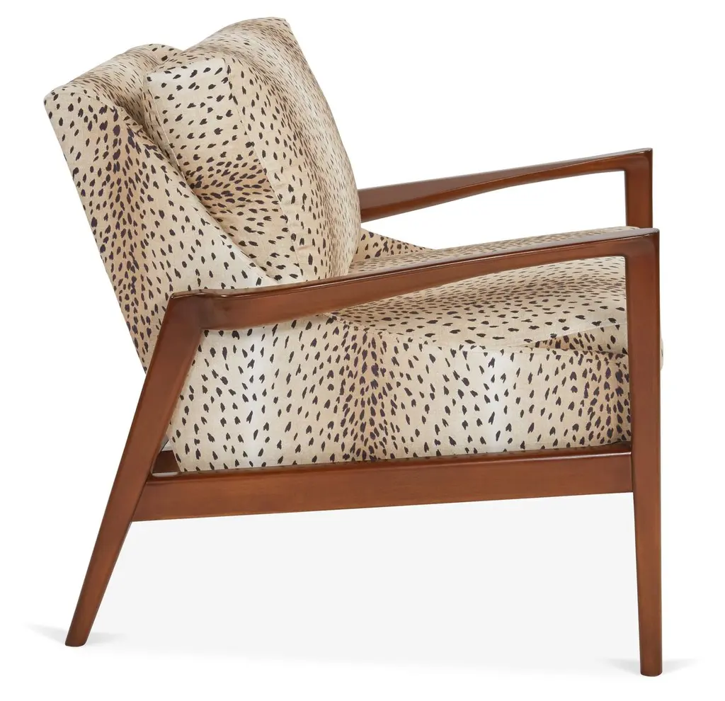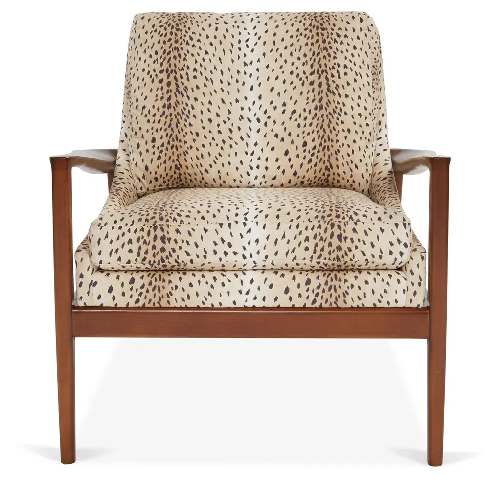 Available online exclusively at One Kings Lane: This armchair embodies a sleek, Scandinavian feel thanks to its angular arms, swooping seat, and cheetah-print upholstery. Sturdy hardwood framework and a high-density foam fill promise lasting comfort and support. Handcrafted in the USA.
