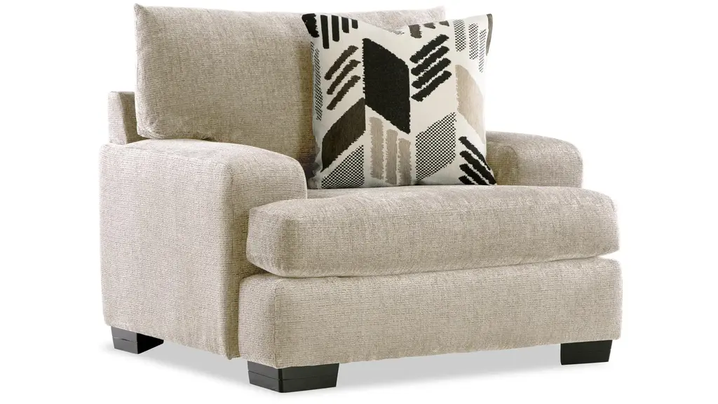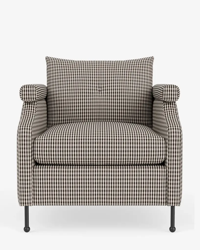 Purposefully designed to let the black leather take center stage, the minimalist profile of this sophisticated armchair is enhanced by the barrel arms that hug the comfortable, deep cushion seat. The dark, conical legs play off the textured ivory and sand houndstooth fabric and visually recall the black leather top accented with an eye-catching stitching. Elegant and versatile, the generous proportions of this armchair are an invitation to lounge.