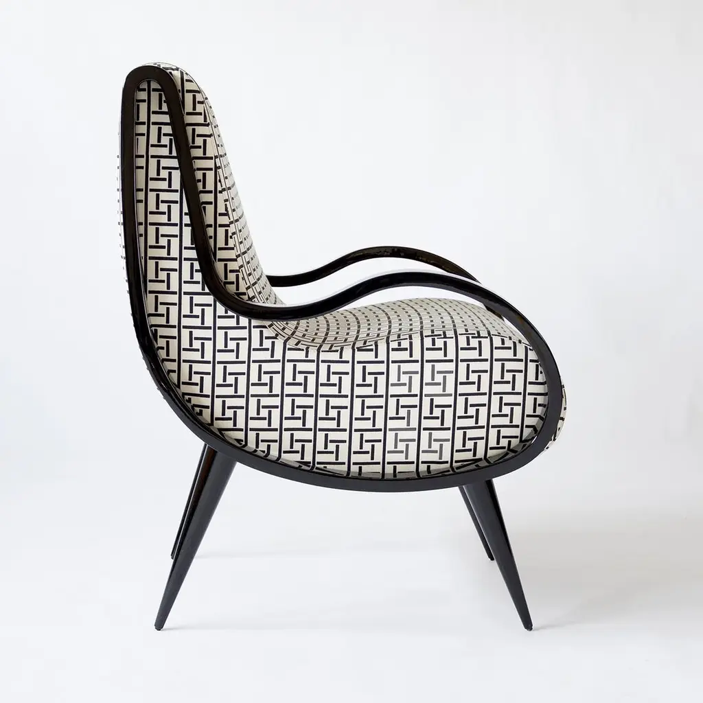 Modern look and original style for this designer armchair. The ideal piece of furniture to add a unique touch to any living room. The legs and the original rounded armrests are shown here in black lacquered wood. A finish that perfectly combines with the graphic fabric in black and white. A perfect stunning mix.