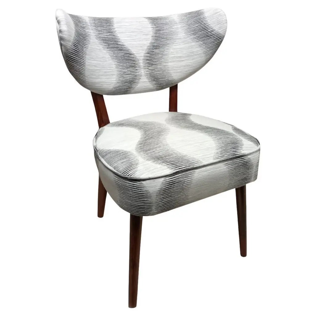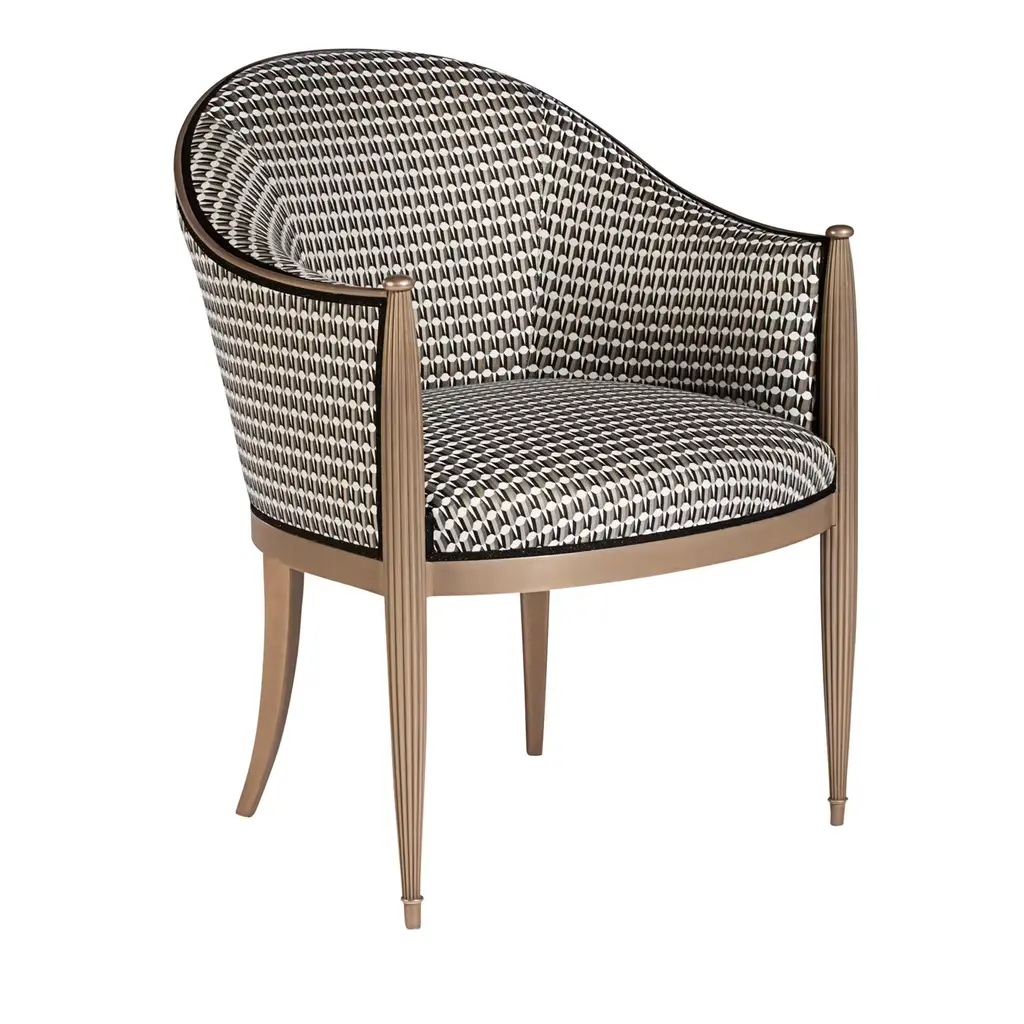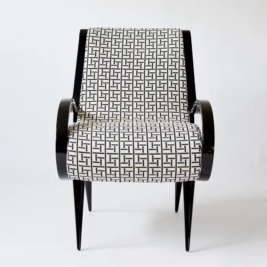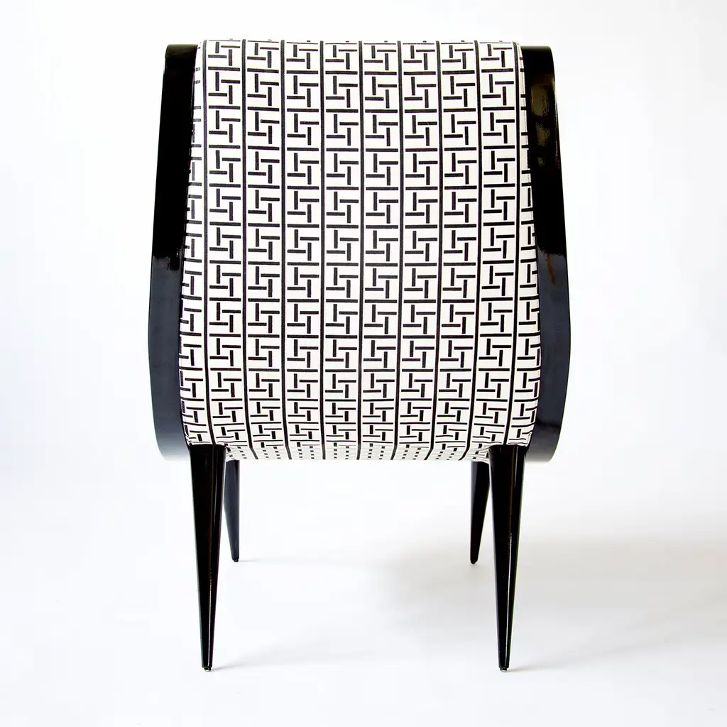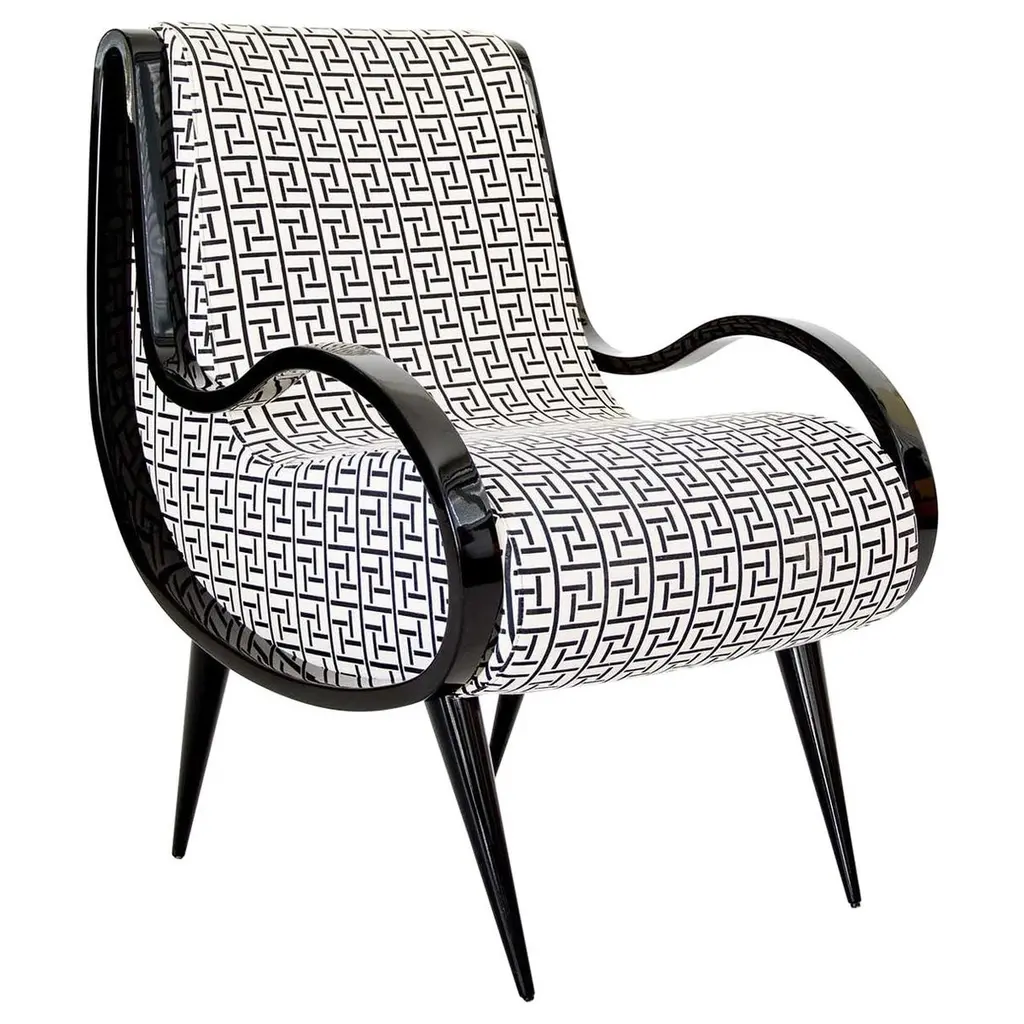 Modern look and original style for this designer armchair. The ideal piece of furniture to add a unique touch to any living room. The legs and the original rounded armrests are shown here in black lacquered wood. A finish that perfectly combines with the graphic fabric in black and white. A perfect stunning mix.