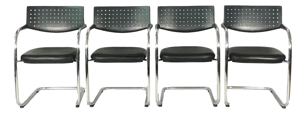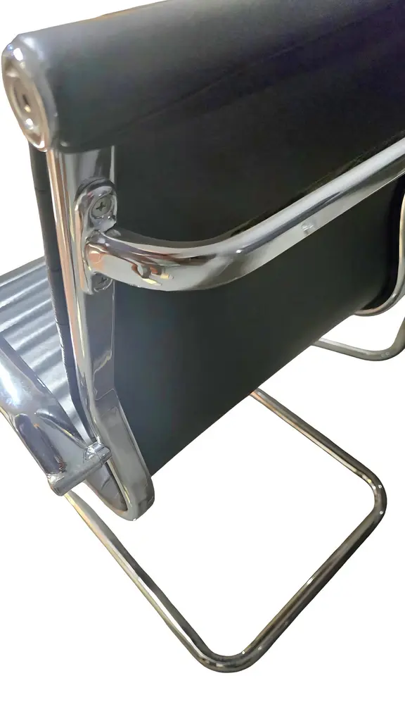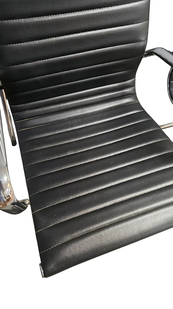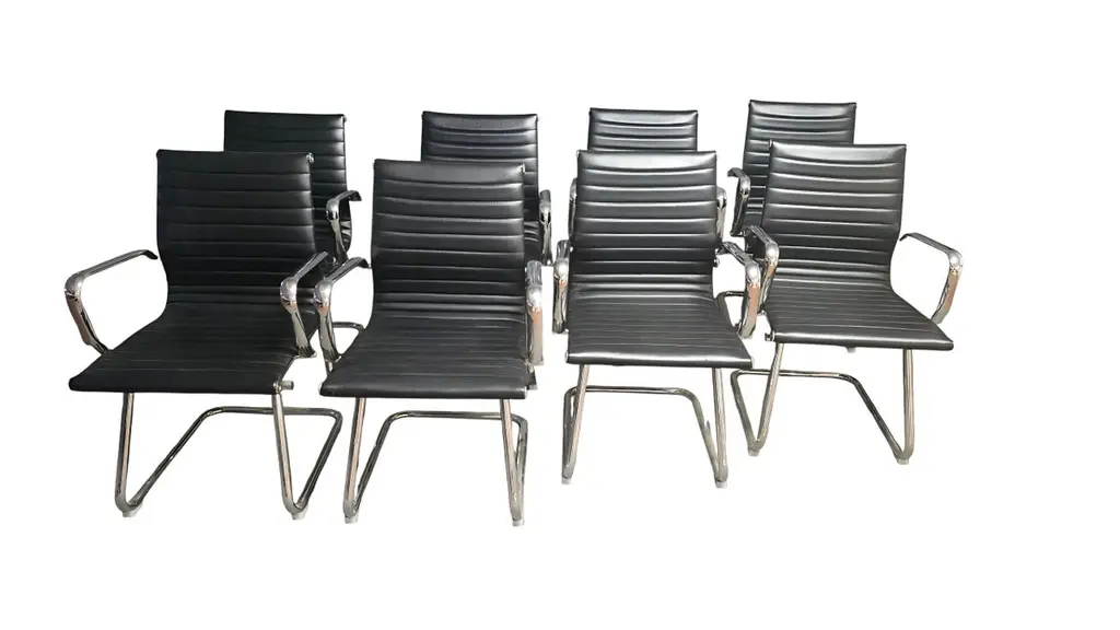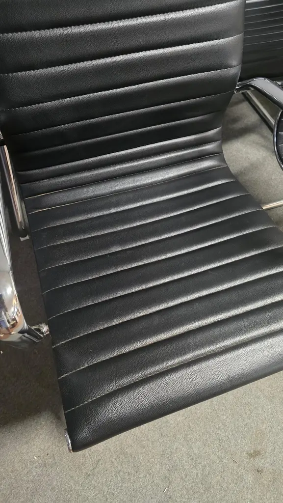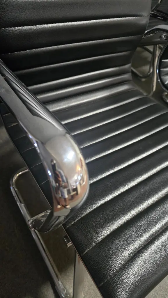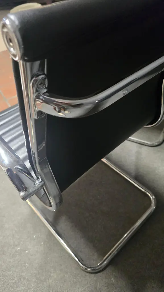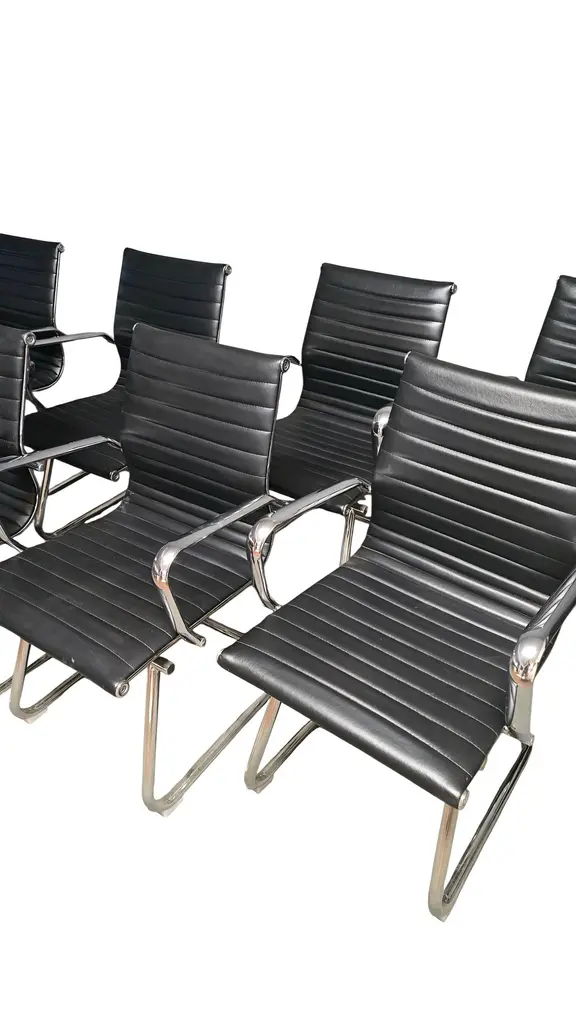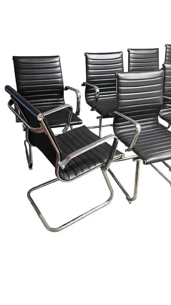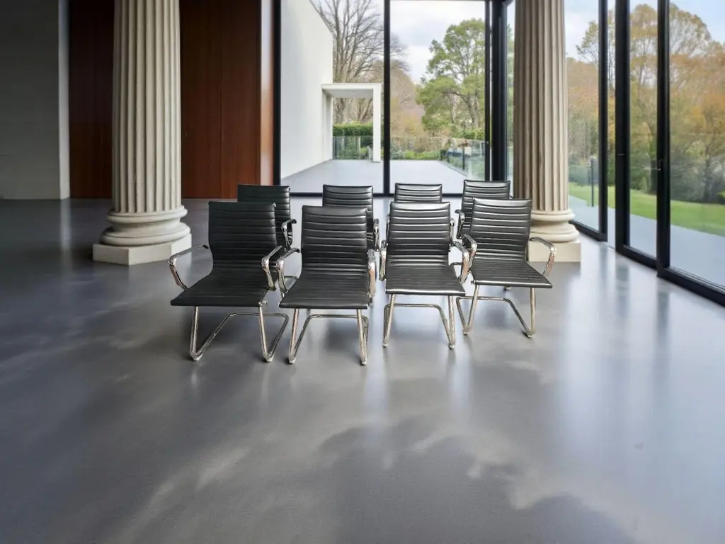 Eight contemporary chairs, dating back to 1980 and attributable to the style of Charles Eames, are a convincing example of the synthesis between aesthetics and functionality that characterized the design of the late Modern. Their black hammered leather upholstery gives a rich and sophisticated texture: the leather, worked to highlight a slight graining, gives the eye and touch a feeling of solidity and value that goes well with intensive daily use. The choice of hammered leather is not only an aesthetic issue, but also a practical one: the treatment increases the resistance to small signs of wear, reduces the visibility of any scratches and facilitates maintenance while maintaining a uniform and professional appearance over time.The steel load-bearing structure, accompanied by chrome armrests, underlines the functional imprint and construction robustness of the piece. Steel provides stability, load capacity and durability, while the chrome finish of the armrests adds a luminous contrast to the dark surface of the skin, enhancing the lines and joining details. The connections are designed to balance visual lightness and mechanical solidity: linear profiles and essential geometries reduce perceived footprint, making the chairs suitable for different contexts without weighing down the environment.The proportions and shape immediately recall the Eamesian principles: ergonomics designed to support the posture, slightly shaped seat and backrest with an inclination that promotes comfort in prolonged sessions. It is not a mere stylistic quote, but a functional declination of those principles that made the Eames school famous: beauty comes from the honesty of the materials and the clarity of the construction solutions. This design heritage makes chairs extremely versatile; the same shape that discreetly accompanies a domestic table is perfect in a conference room, where reliability and professional appearance are priorities.The year of production, 1980, contextualizes the object in a phase of diffusion and reinterpretation of the design icons of the previous century. In those years, many industrial producers and carpenters took the lessons of the masters, adapting them to contract requirements and emerging production standards. The result is an object that carries with it a historical and collectible value, without sacrificing contemporary usability: those looking for pieces with a precise temporal connotation will find in these chairs a balance between authenticity and pragmatism.From a practical point of view, the leather/steel combination ensures durability, ease of cleaning and resistance to heavy use; from an aesthetic point of view, the sobriety of black and the reflection of metal communicate a formal language suitable for offices, meeting rooms, design restaurants and modern homes. In summary, these are eight chairs that embody a coherent and mature design proposal: elegant without ostentation, robust but refined, able to dialogue with different spaces while maintaining a strong stylistic identity that refers, with respect and lightness, to the lesson of Charles Eames. Contact for further details on conservation status, measurements and vision possibilities.