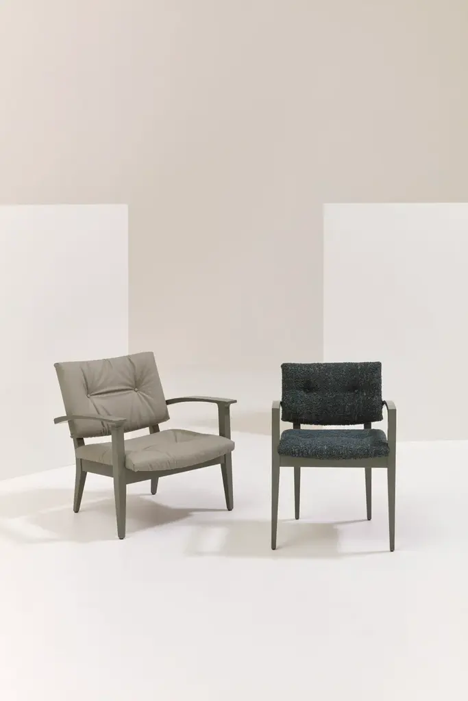 Eileen 7C02 is an upholstered armchair with fixed cover and a solid beech wood frame.Eileen is a collection that pays tribute to Werther Toffoloni’s homage to Eileen Grey, one of the first female designers and a pioneer of the International Style.Both the chair and armchair are enhanced by construction details that highlight the craftsmanship of the woodwork, while the leather upholstery features tailor-inspired quilting, making it soft, inviting, and exceptionally refined.