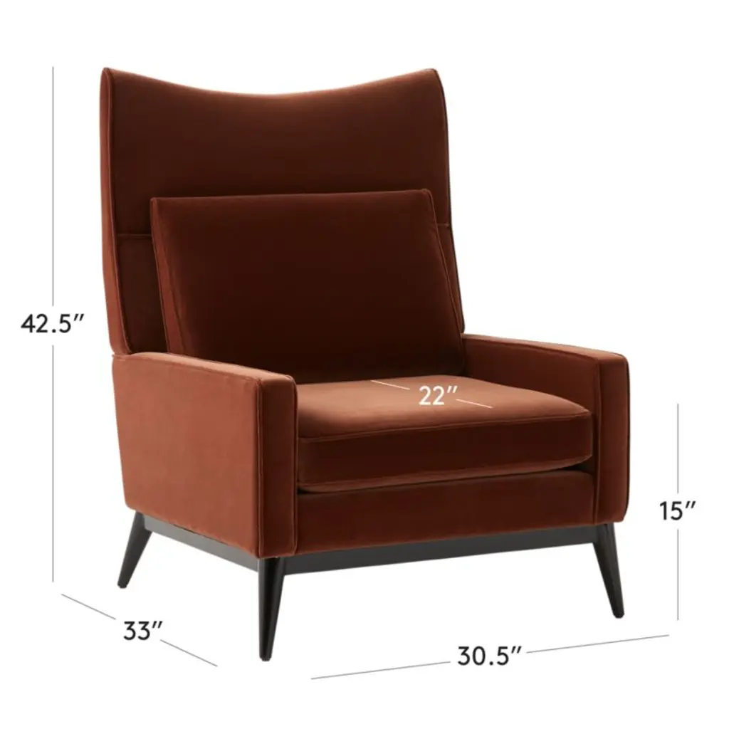 Updated in a rich reddish-bronze velvet, midcentury lounge chair by Paul McCobb retains all of the defining details that made the original a classic. The tall frame supports a firm seat cushion with a more formal yet supportive sit. Tapered black legs, a welt trim and a matching velvet accent pillow complete the tailored design. Pair with the coordinating ottoman. CB2 exclusive.