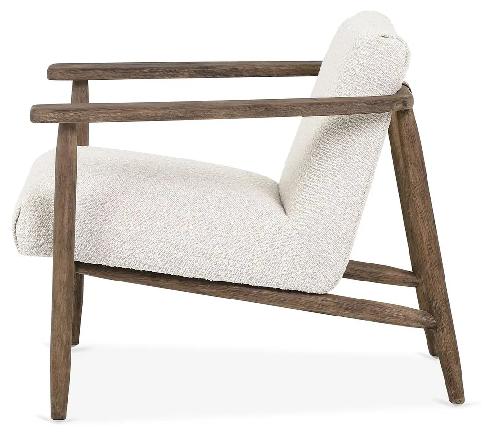 This accent chair is crafted of rubberwood with an open, angular frame, distressed finish, and amply padded cushions wrapped in plush, neutral-hued fabric.