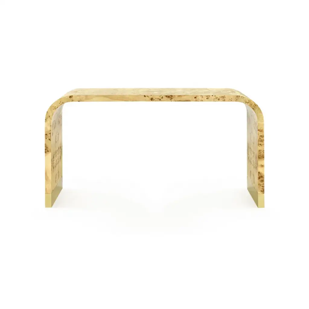 We love our Emil Collection for its embrace of retro silhouettes and cosmopolitan style. The naturally vibrant patterns found in burl wood have a distinctively 1970s feel—all kaleidoscopic swirls with a bold sense of cool. Our Emil Console is the classic embodiment of the beloved vintage waterfall table, with an inherent softness stemming from its seamless, curved design. The sheen of its veneer is matched by the brushed brass accents of its elongated sabots. The Emil Console can be paired with a plush bench or chair to create a sitting area in a foyer or living room, or simply used a showcase for decorative art, vases, candles, and more. The Emil Collection exudes elevated richness.