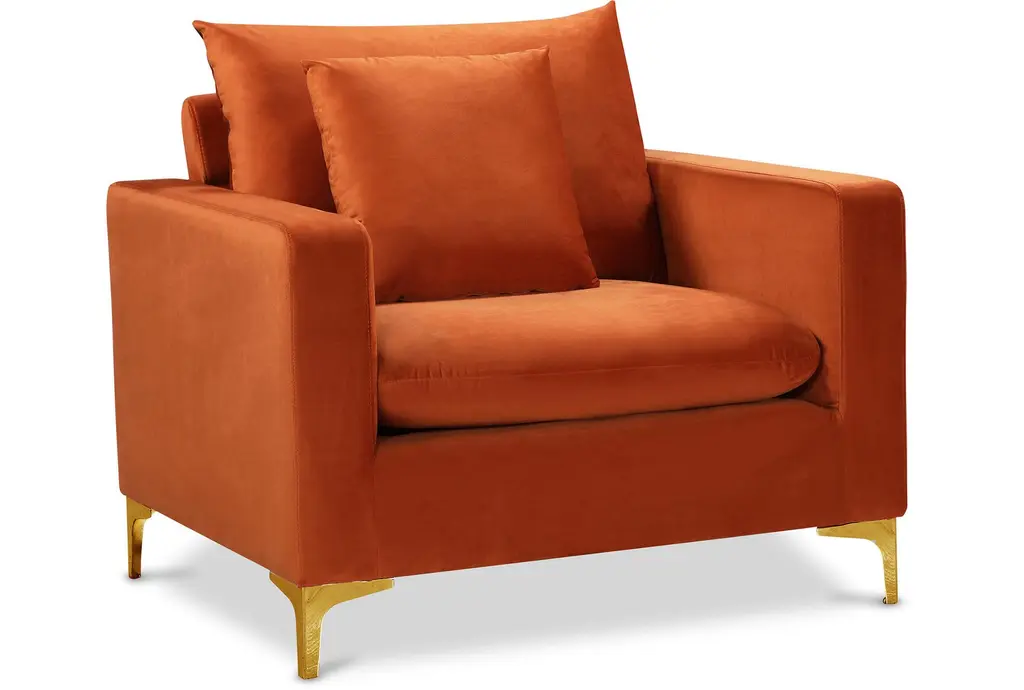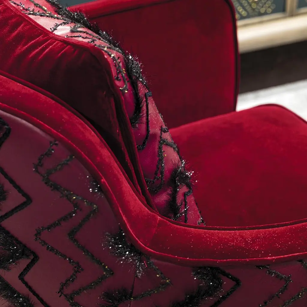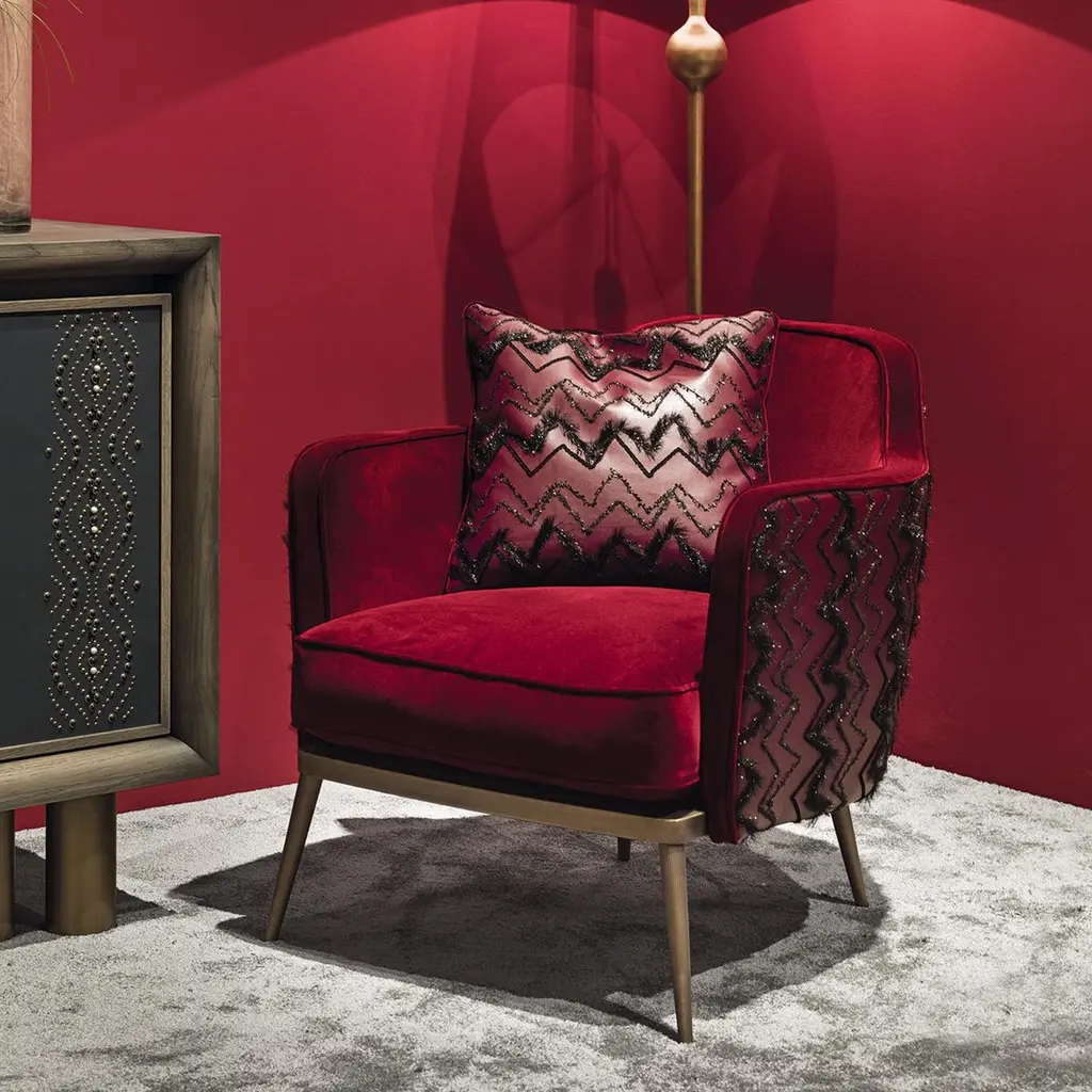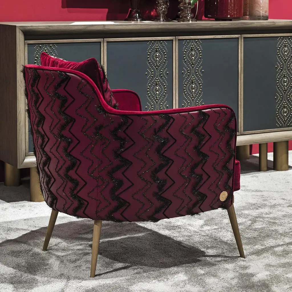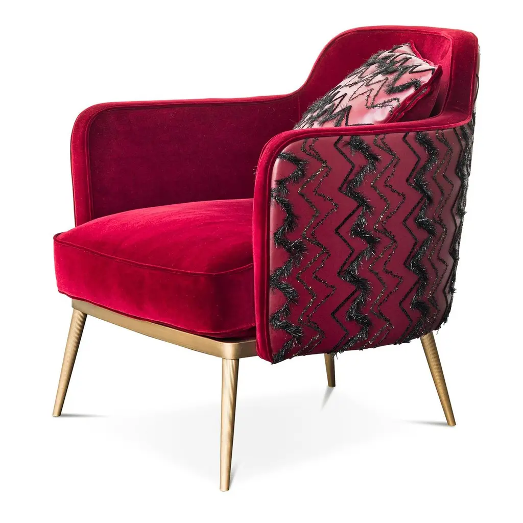 As if straight from a glamorous lounge, the Emily armchair exudes luxury where minimalism just won't do. On a bronze-colored base, the chair is upholstered in dramatic red cotton velvet and faux leather, then accented with zig-zag stitching. A statement-making piece, the armchair is perfect for luxury living rooms or hotel lounges.