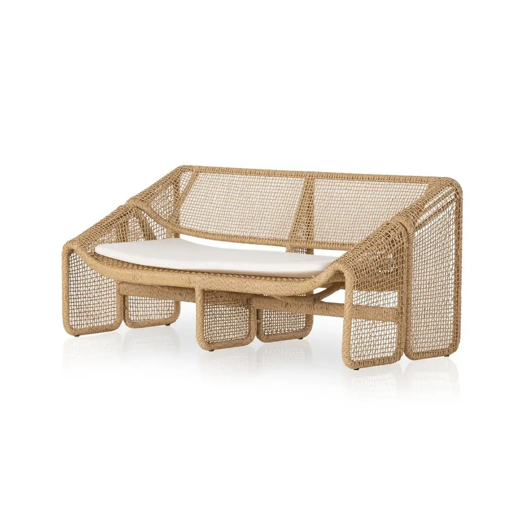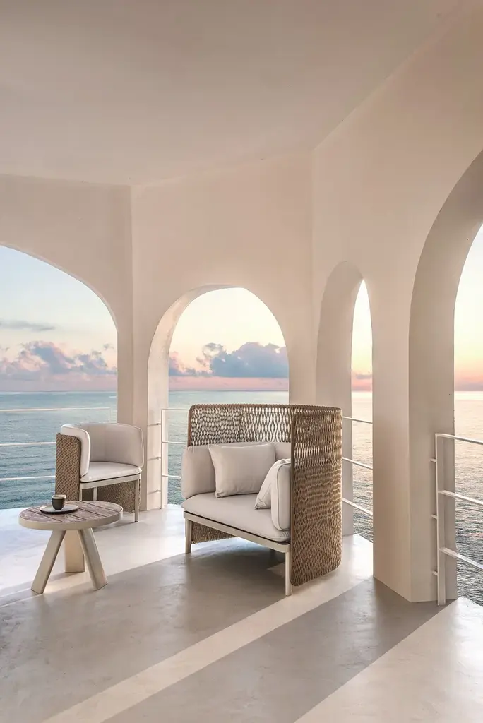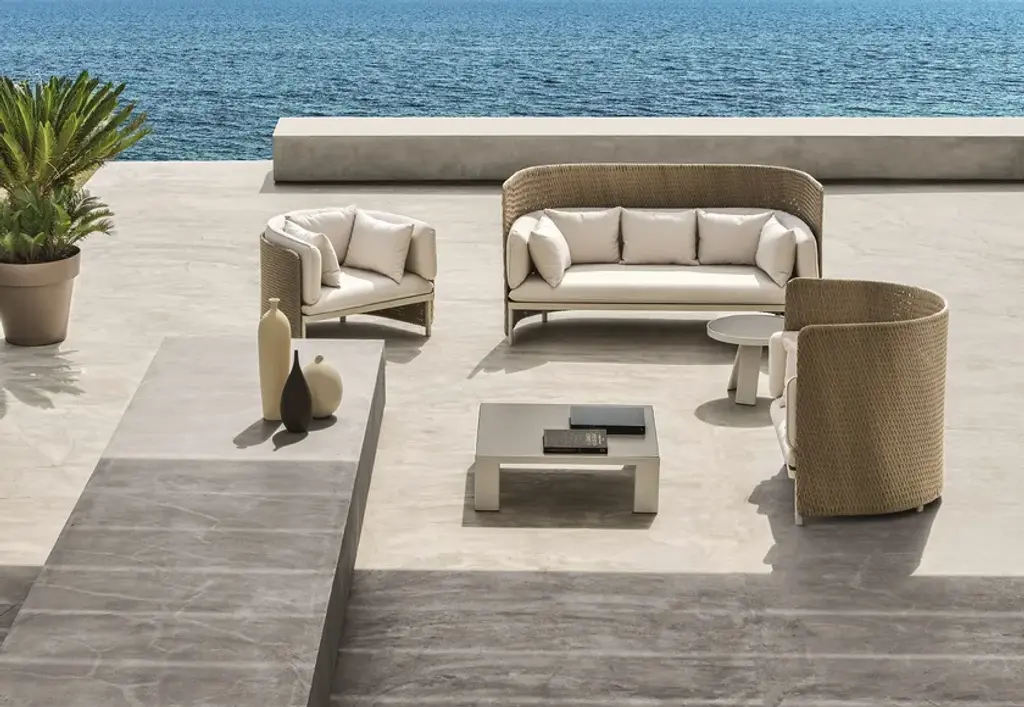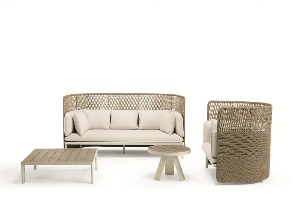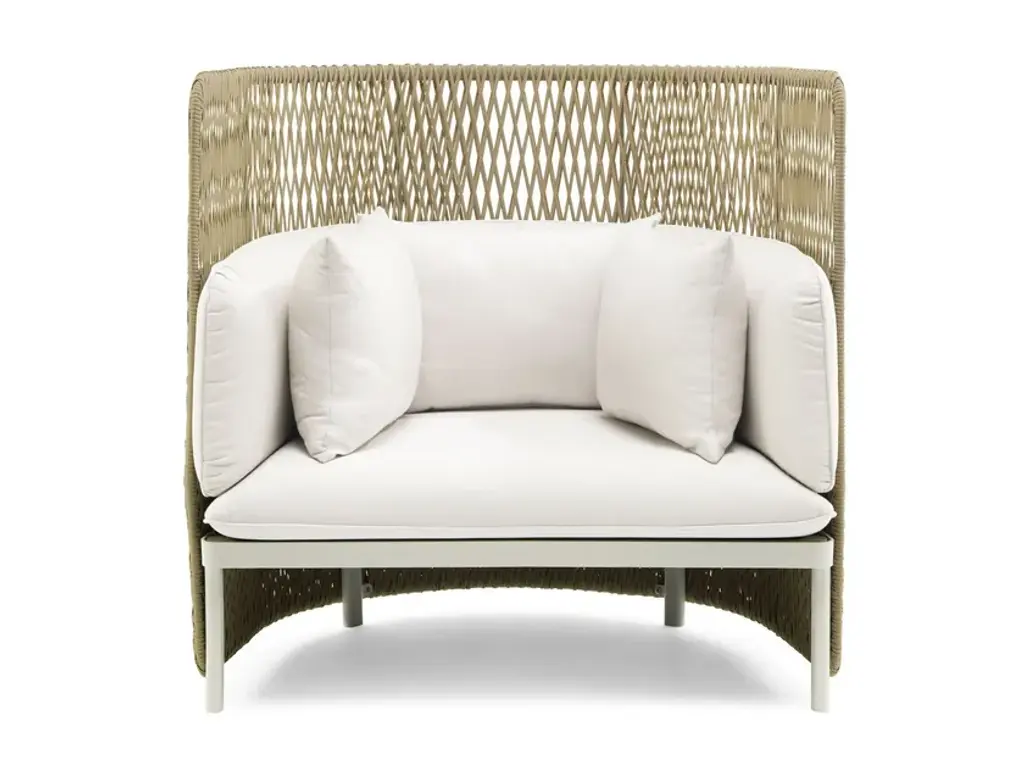 ESEDRA | High-back armchair - Highback lounge armchair in Natwick fibre and aluminium.Eye-catching aesthetics and unusual textures tell the story of Esedra, the outdoor collection designed by Luca Nichetto and star of the new Ethimo catalogue. At the time of the Ancient Romans, the “exedra” was a semi-circular space where social gatherings and philosophical debates were held. The collection Esedra takes its name from this element of classical architecture to create a complete range of furniture for a contemporary outdoor look, establishing a relationship between the various materials, such as the synthetic fibre used for the seat-backs, treated with a technology that recreates the sensation of natural woven fibre, the fabric upholstery of the cushions and the aluminium legs.The collection includes Esedra Chair, Lounge Chair and Sofa, elements perfect for the recreation of true semi-circular cosy “niches”, their structures coloured in Warmwhite, Dark Grey. The soft cushions fabrics that complete these lounge furnishings come in Nature White, Black Stone and Red Earth. Different shapes and sizes of tables and coffee tables are available with tops in a variety of materials such as pickled teak or highly resistant Laminam porcelain ceramic tile in Slate Grey or Dove Grey.