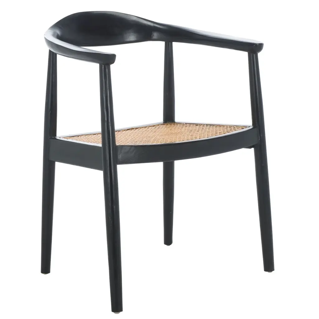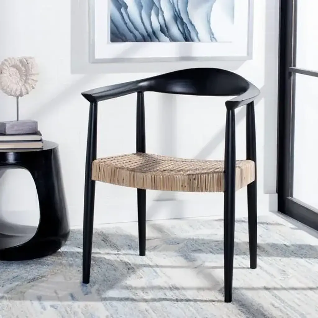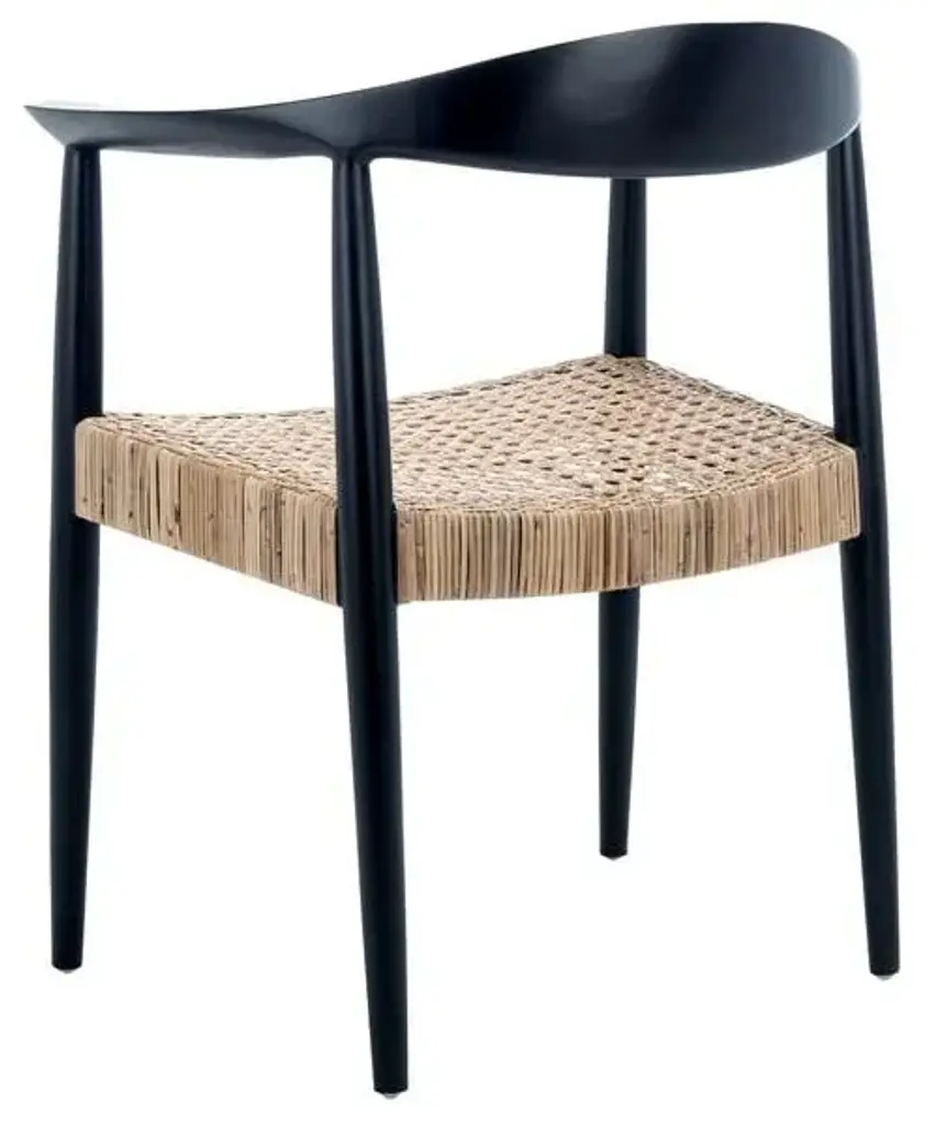 Teasing glimpses of Mid-Century chic with an iconic retro-inspired frame, this Eyre Accent Chair is a staple in any coastal-contemporary interior. Eyre’s finely carved black wood, is given additional decorative depth with its intricately woven natural rattan seat. Although leather is one of the most durable upholstery materials, proper care is vital to maintain its appearance and performance. Dust weekly using a soft, clean cloth slightly dampened with distilled water. Blot spills immediately with a soft, clean absorbent dry cloth. Weight Capacity (lb): 275 Seat Dimensions (W x D x H in): 19.48 x 17.91 x 17.32 Assembly Required? No Materials: Sungkai, Rattan Peel