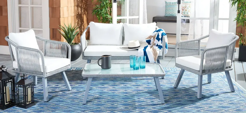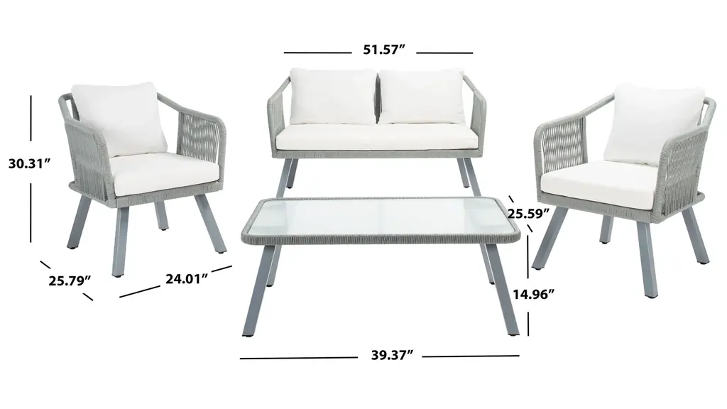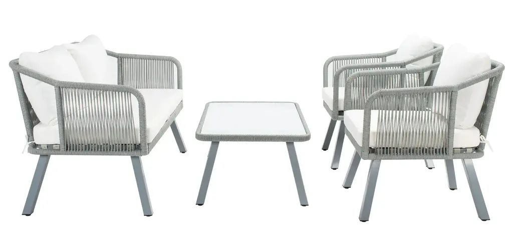 Modern minimalism gets a contemporary upgrade in this Fadri 4-pc. Outdoor Living Set. The geometric frames of Fadri's two chairs and loveseat are given a delightful, airy touch with grey rope details, while plush beige cushions provide matchless comfort in the great outdoors. Includes a glass topped coffee table.