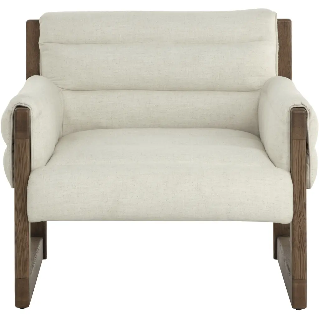 Beautiful and stylish, the Ferguson Lounge Chair is sure to impress. Nestled within a warm brown oak wood frame are channel tufted cushions upholstered in geralt linen performance fabric, making the most of its lavish yet cozy appearance. Matching channel tufted padding wraps over the armrests to embrace guests in a beacon of luxurious comfort.