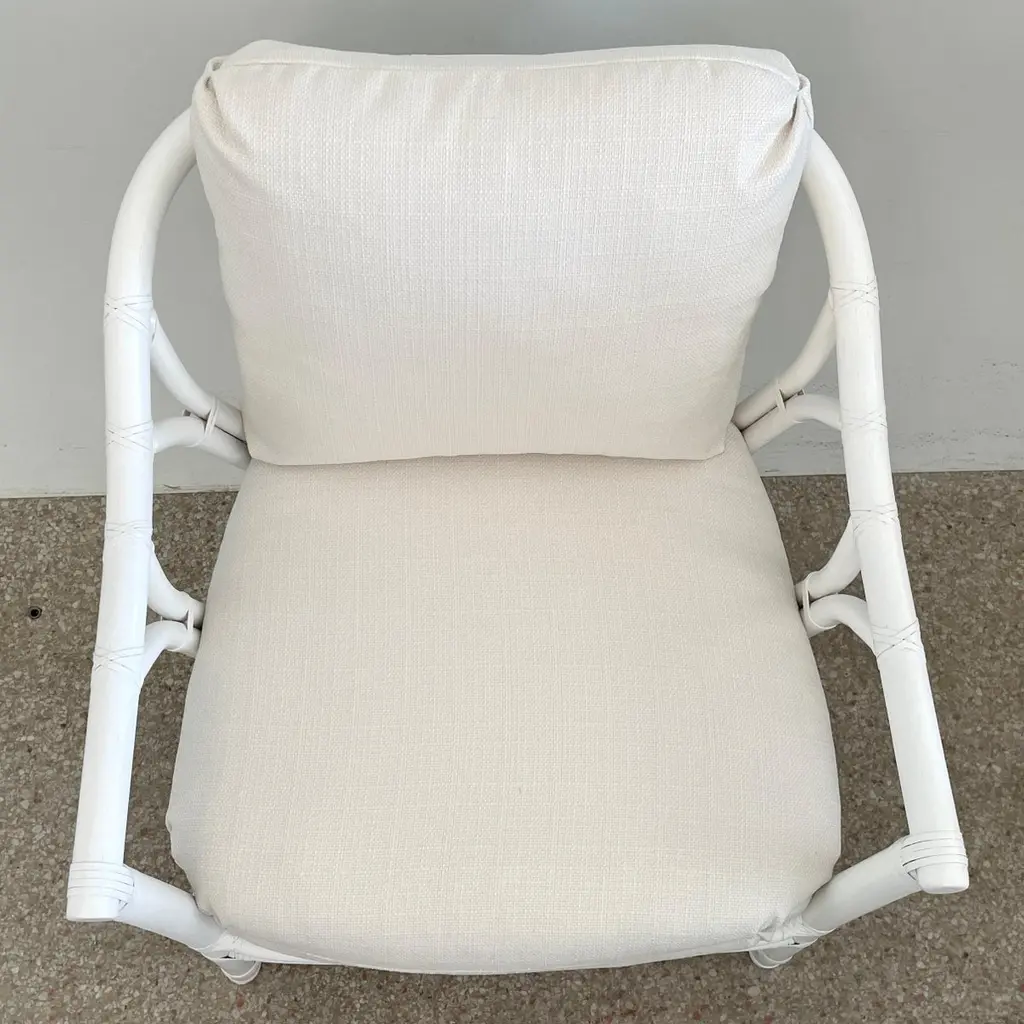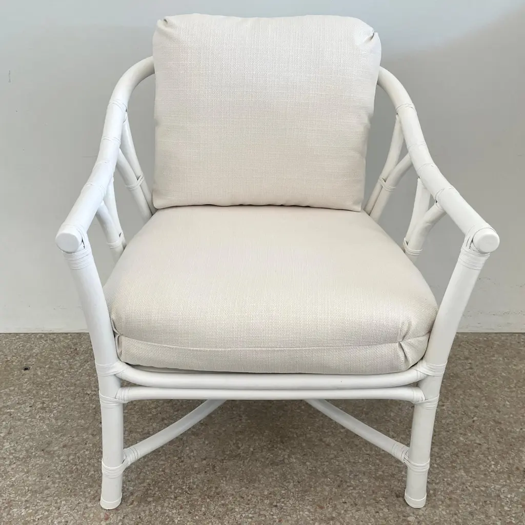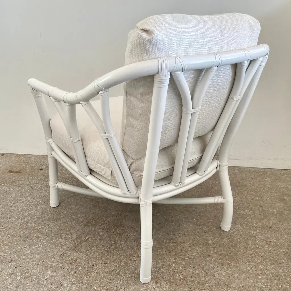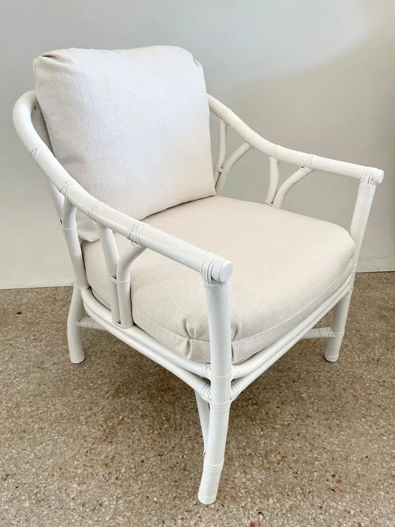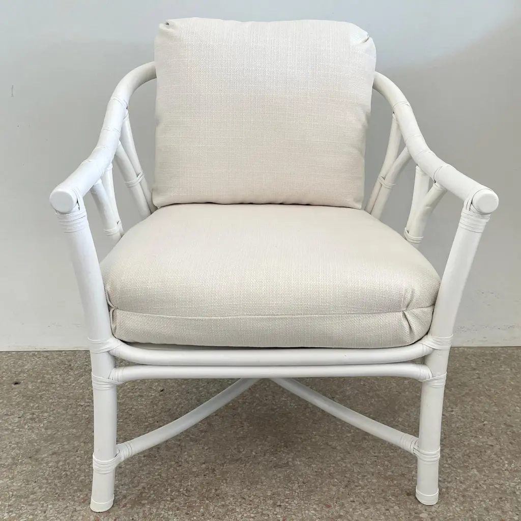 Fabulous Ficks Reed club chair upholstered in new Todd Hase High Performance cushions with frames newly lacquered in white. This piece has an authentic Ficks Reed label. Great addition to your boho chic interiors. We have three club chairs in stock.