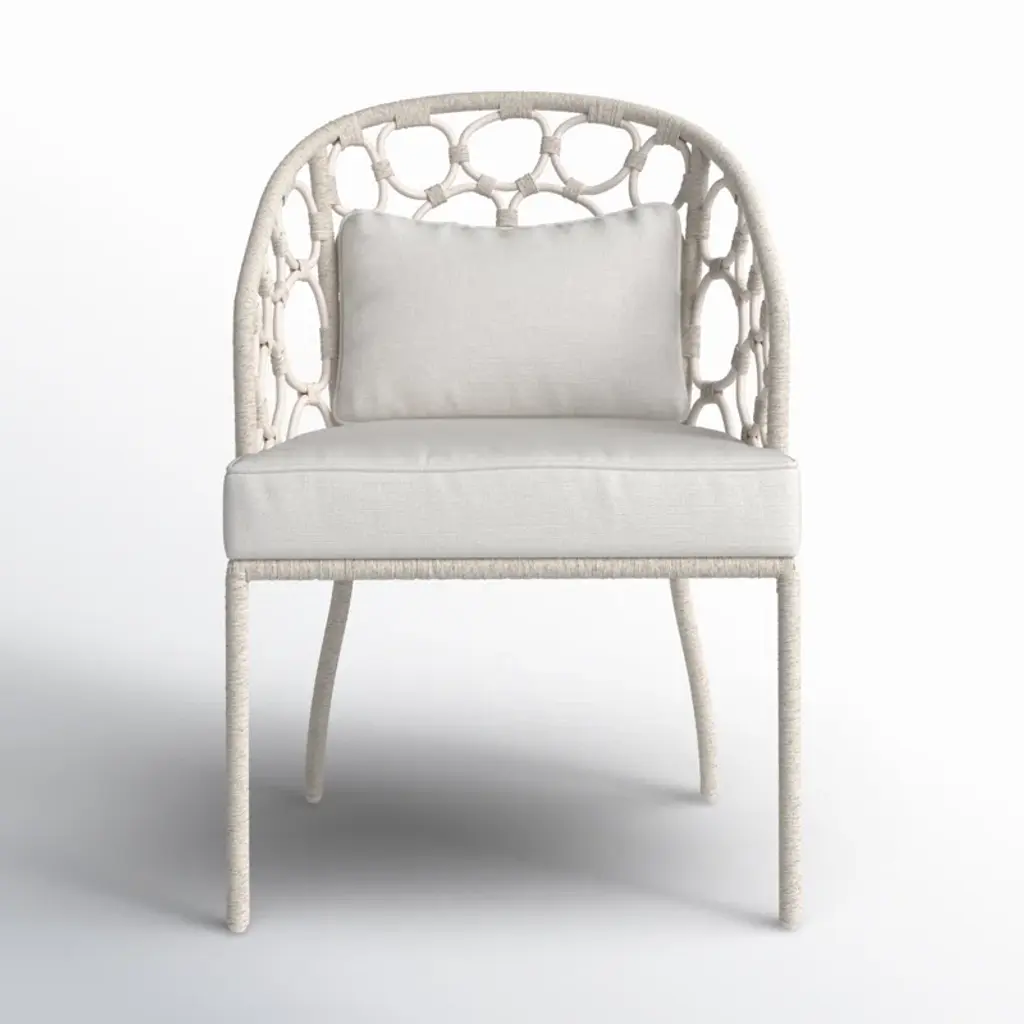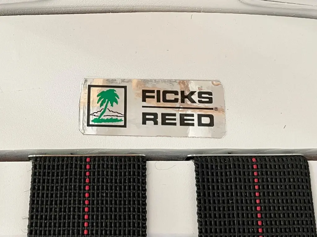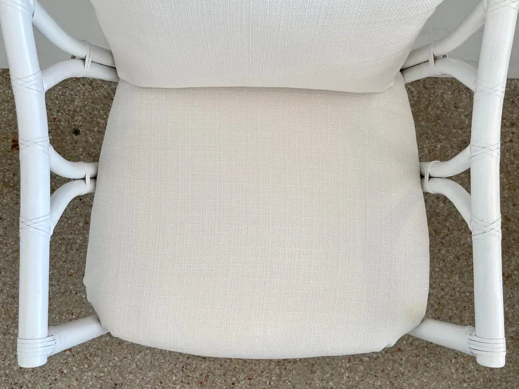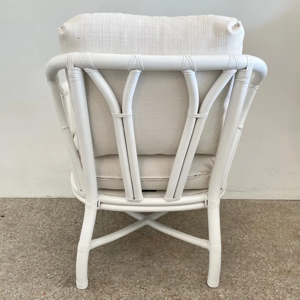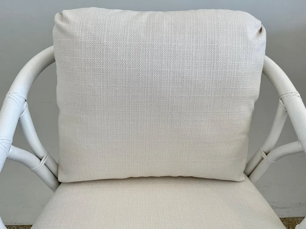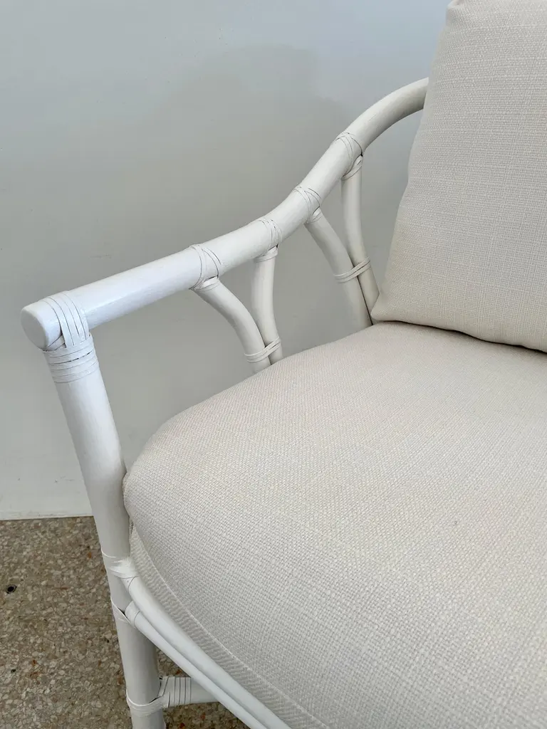 Fabulous Ficks Reed club chair upholstered in new Todd Hase High Performance cushions with frames newly lacquered in white. This piece has an authentic Ficks Reed label. Great addition to your boho chic interiors. We have three club chairs in stock.