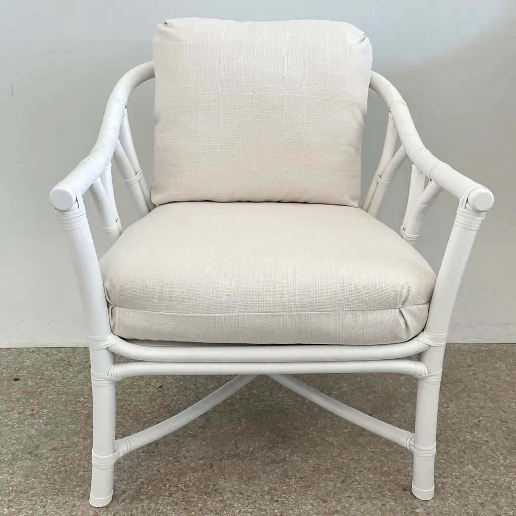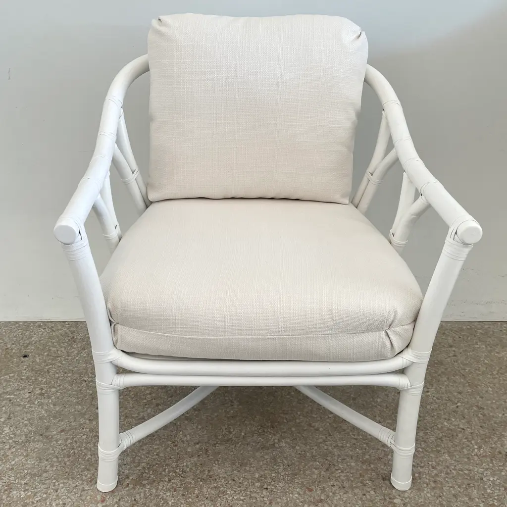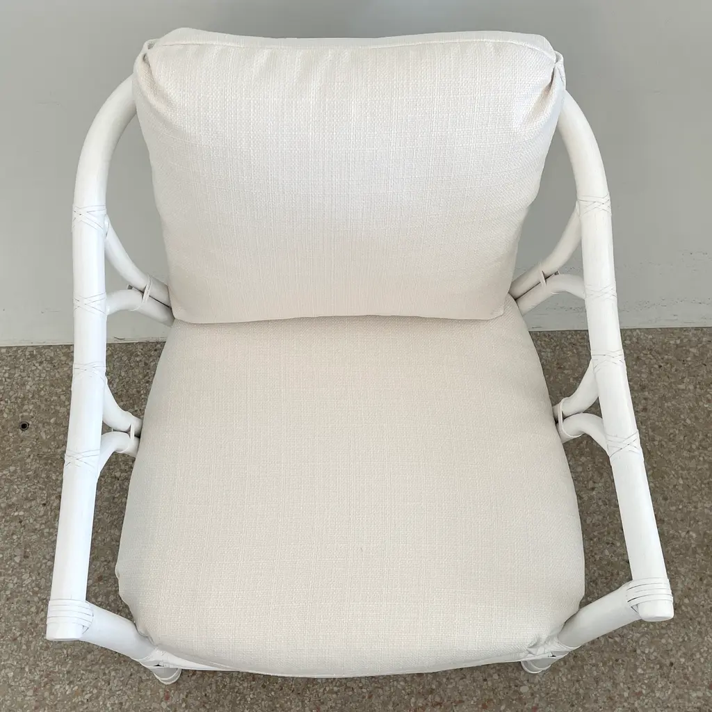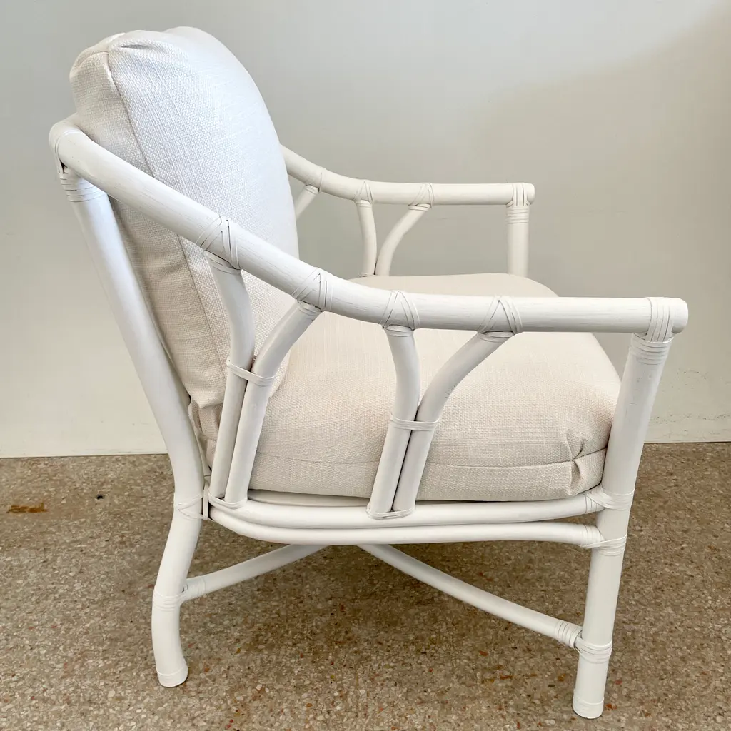 Fabulous Ficks Reed club chair upholstered in new Todd Hase High Performance cushions with frames newly lacquered in white. This piece has an authentic Ficks Reed label. Great addition to your boho chic interiors. We have two club chairs in stock.