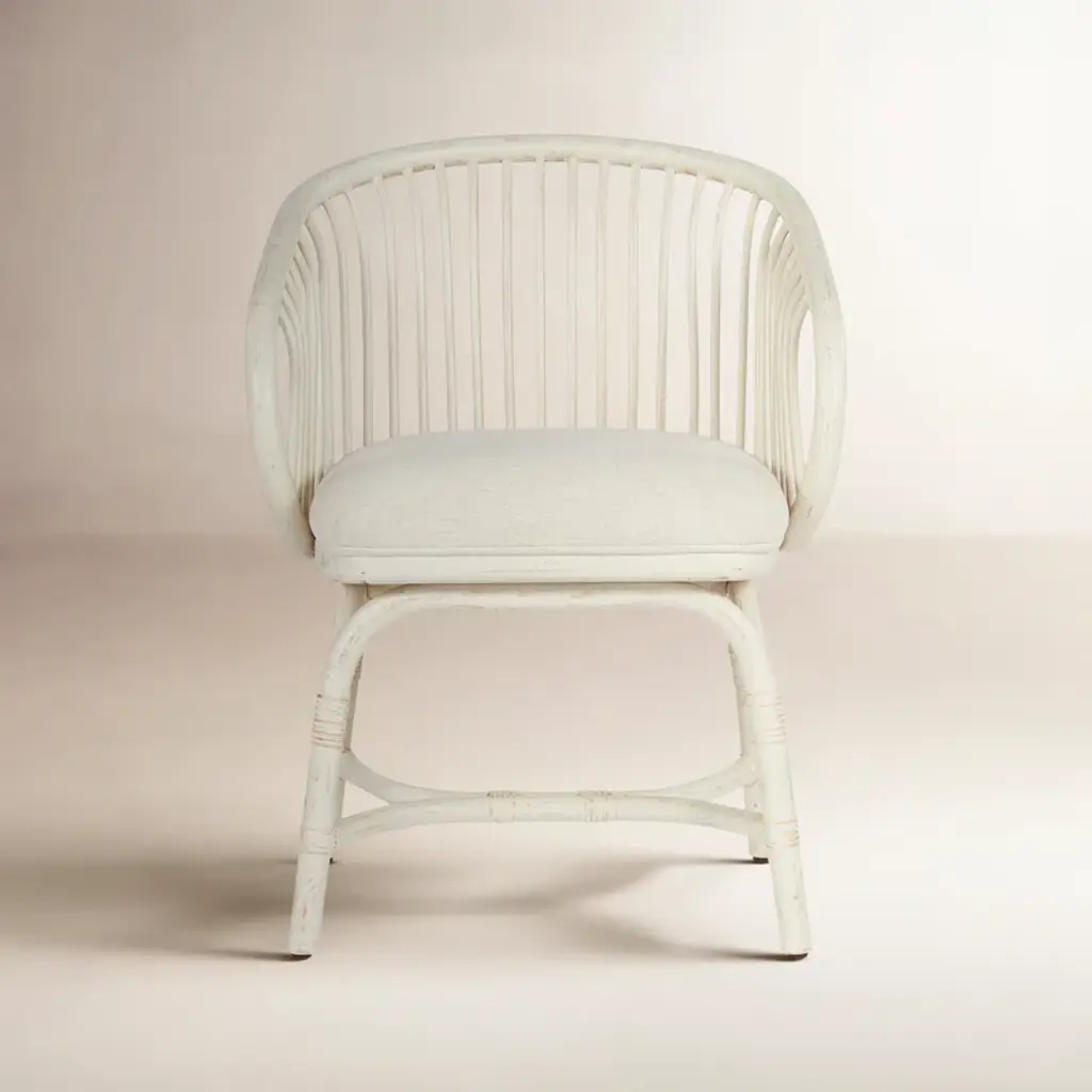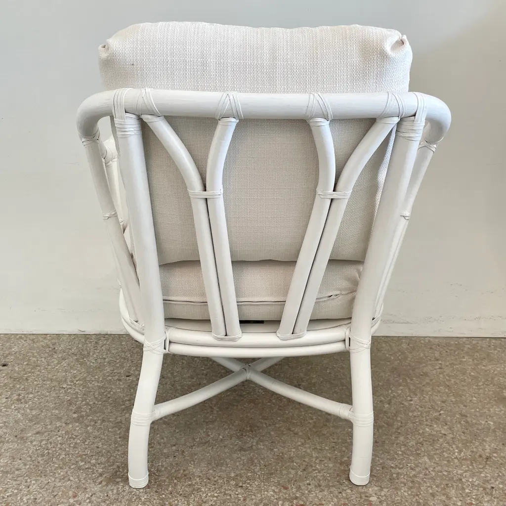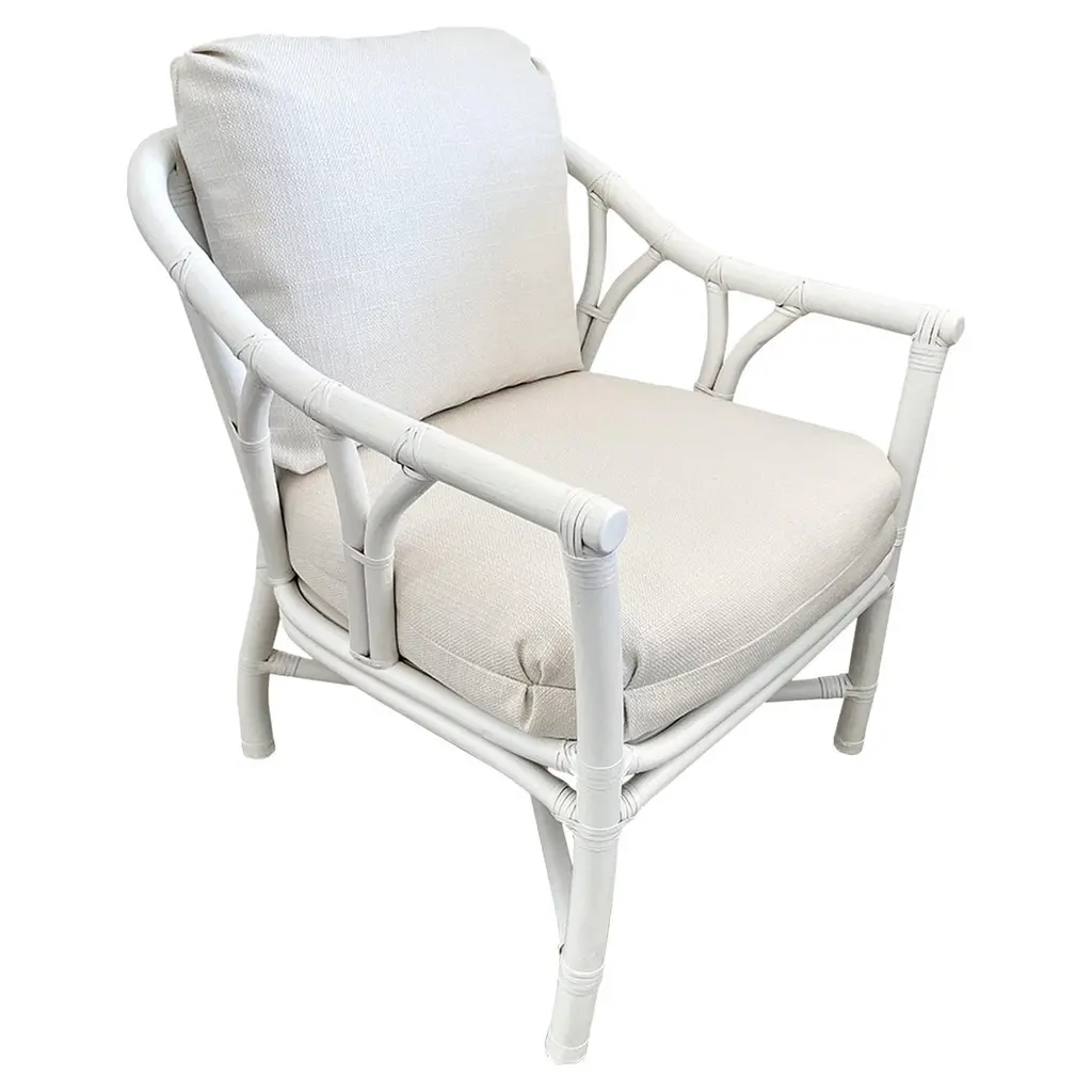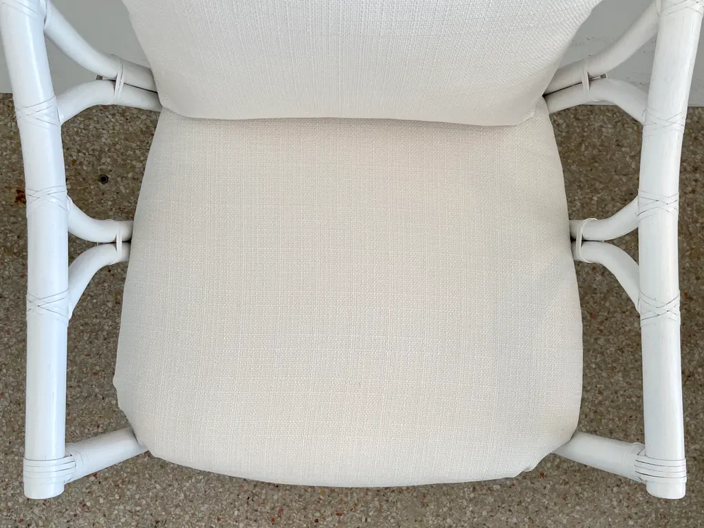 Fabulous Ficks Reed club chair upholstered in new Todd Hase High Performance cushions with frames newly lacquered in white. This piece has an authentic Ficks Reed label. Great addition to your boho chic interiors. We have two club chairs in stock.
